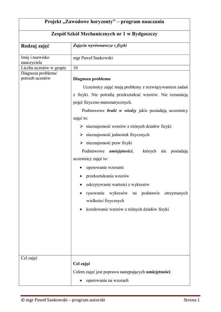 Projekt „Zawodowe horyzonty” – program nauczania Zespół Szkół Mechanicznych nr 1 w Bydgoszczy Rodzaj zajęć Zajęcia wyrównawcze z fizyki Imię i nazwisko nauczyciela Liczba uczniów w grupie Diagnoza problemu/ potrzeb uczniów mgr Paweł Sankowski 10 Diagnoza problemu Uczestnicy zajęć mają problemy z rozwiązywaniem zadań z fizyki. Nie potrafią przekształcać wzorów. Nie rozumieją pojęć fizyczno-matematycznych. Podstawowe braki w wiedzy jakie posiadają uczestnicy zajęć to: nieznajomość wzorów z różnych działów fizyki nieznajomość jednostek fizycznych nieznajomość praw fizyki Podstawowe umiejętności, których nie posiadają uczestnicy zajęć to: operowanie wzorami przekształcania wzorów odczytywanie wartości z wykresów rysowanie wykresów na podstawie otrzymanych wielkości fizycznych korelowanie wzorów z różnych działów fizyki Cel zajęć Cel zajęć Celem zajęć jest poprawa następujących umiejętności: operowania na wzorach © mgr Paweł Sankowski – program autorski Strona 1 rysowania wykresów przekształcania wzorów operowanie na wzorach z różnych działów fizyki odczytywanie wartości z wykresów Uzupełnienie następujących braków w wiedzy: wzorów jednostek praw fizyki Szczegółowy opis zajęć Zajęcia będą się odbywały raz w tygodniu po 2h, we czwartki o godzinie 15:00 w sali nr 17 w ZSM nr 1 w Bydgoszczy. Uczniowie będą rozwiązywać zadania z poszczególnych działów fizyki. Uczniowie otrzymają kart pracy i wraz z nauczycielem poznają teorię i będą rozwiązywać zadania. Kursanci nabędą umiejętności płynnego poruszania się wśród teorii fizycznych. Znajomości wzorów i umiejętności ich wykorzystania w zadaniach i do opisu praw fizyki. Szczegółowy opis systemu ewaluacji Ewaluacja wstępna: Uczestnicy zajęć na pierwszym spotkaniu napiszą test sprawdzający wiedzę ogólna z fizyki. Ewaluacja okresowa: Pod koniec pierwszego semestru uczestnicy napiszą sprawdzian © mgr Paweł Sankowski – program autorski Strona 2 z zadań z różnych działów fizyki. Każdy z uczestników wypełni również ankietę, w której oceni swoje postępy i cele na kolejny semestr, które chciałby osiągnąć. Ewaluacja końcowa: Po drugim semestrze uczestnicy napiszą test sprawdzających ich wiedzę. Każdy test zostanie omówiony z uczestnikiem indywidualnie. Wszyscy otrzymają ankietę, którą wypełnili w semestrze pierwszym i będą mogli skorelować swoje osiągnięcia z założonymi celami. Ocena sukcesu projektu (pisemnie): a) analiza osiągniętych celów b) skuteczność projektu c) użyteczność dla ucznia d) wnioski z ewaluacji Szczegółowy harmonogram działań Sposób realizacji Zakres nabywanych przez ucznia umiejętności Blok Temat tematyczny SEMESTR I 1/2009 Test diagnostyczny dla Prowadzący zajęcia rozda uczestnikom uczestników zajęć. test sprawdzający wiedzę. © mgr Paweł Sankowski – program autorski Strona 3 Kinematyka – Uczestnicy otrzymają ksero zadań rozwiązywanie zadań. z kinematyki. Prowadzący wraz z uczestnikami będzie rozwiązywał zadania na tablicy i wyjaśniał wszelkie wątpliwości. Uczestnik zajęć rozwiążę test sprawdzający znajomość fizyki. Zadaniem kursanta będzie rozwiązanie zadań z kinematyki. Zapoznanie uczestników z następującymi wzorami: , , . 2/2009 Dynamika. Zastosowanie Każdy uczestnik kursu pracuje nad partią równania Newtona zadań. Następnie następuje sprawdzenie do rozwiązywania zadań. wyników i dodatkowe wyjaśnienia. Kursanci będą rozwiązywać przykłady w których zastosują zasady dynamiki Newtona. Zapoznanie uczestników z równaniem Newtona: . 3/2009 Prawo powszechnego Wykładowca rozda zadania, a następnie ciążenia, pole wraz z kursantami będzie je rozwiązywał. grawitacyjne, energia © mgr Paweł Sankowski – program autorski Strona 4 potencjalna grawitacji. Celem zajęć jest rozwiązanie przez Rozwiązywanie zadań. kursanta zadań w oparciu o pomoc wykładowcy. Uczestnik kursu pozna wzory i nauczy się praw fizyki rządzących ruchem planet i ciał. Zapoznanie uczestników z następującymi wzorami: , . 4/2009 Szczególna teoria Każdy uczestnik kursu otrzyma ksero względności Einsteina. zadań ze szczególnej teorii względności. Rozwiązywanie zadań Wykładowca będzie koordynował w oparciu o postulaty rozwiązywanie zadań. W razie potrzeby Einsteina. udzieli wskazówek. Kursanci zostaną zapoznani ze szczególną teorią względności na przykładach zadań. Zapoznanie uczestników z następującymi wzorami: , , , , , . 5/2009 Hydrostatyka. Prawo © mgr Paweł Sankowski – program autorski Wykładowca zapozna kursantów Strona 5 Pascala i Archimedesa. z podstawowymi prawami i wzorami potrzebnymi do rozwiązywania zadań z hydrostatyki. Omówi prawo Archimedesa i prawo Pascala., działanie prasy hydraulicznej i pomiar gęstości ciał za pomocą U-rurki. Następnie rozda ksero zadań uczestnikom. Uczestnik zdobędzie wiedzę i umiejętności rozwiązywania zadań z hydrostatyki. Pozna następujące wzory: , , . 6/2009 Termodynamika. Prowadzący zajęcia rozda ksero 0, I, II zasada z zadaniami, wyjaśni przy każdym termodynamiki. zadaniu zasadę z której korzystamy Równanie Clapeyrona w celu jego rozwiązania. Uczestnicy będą i przemiany gazu kolejno rozwiązywać problemy. doskonałego. Kursanci zdobędą wiedzę o zasadach termodynamiki. Podczas rozwiązywania zadań poznają następujące wzory: , , . Zdobędą wiedzę na temat parametrów makroskopowych. © mgr Paweł Sankowski – program autorski Strona 6 7/2009 Elektrostatyka. Wykładowca omówi podstawowe wzory Prawo Coulomba, z elektrostatyki. Rozda kursantom zadania natężenia pola a następnie pomoże w ich rozwiązaniu. elektrycznego, zasada superpozycji. Uczestnicy zapoznają się z elektrostatyka na przykładzie zadań. Podczas rozwiązywania wykorzystają następujące wzory: , , . 8/2009 Magnetyzm. Prowadzący zajęcia om