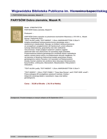 Utworzono : 08Łopacińskieg March 2017 Wojewódzka Biblioteka Publiczna im. Hieronima > PARYSÓW Dobra ziemskie, Mazek R. PARYSÓW Dobra ziemskie, Mazek R. Model : 9788378472759 PARYSÓW Dobra ziemskie, Mazek R. Producent : PARYSÓW Dobra ziemskie na południowo-wschodnim Mazowszu z XVI-XIX w., Mazek Roman, Polihymnia 2015 "TEXT-ALIGN: justify; TEXT-INDENT: 1.25cm; MARGIN-BOTTOM: 0.35cm"> Książka przedstawia funkcjonowanie klucza ziemskiego wraz z dziedzicznym miasteczkiem. Bazując na źródłach różnej proweniencji, ze szczególnym uwzględnieniem akt hipotecznych, praca odtwarza sytuację własnościową, gospodarkę oraz stan zadłużenia nieruchomości. Dzięki podjętym badaniom ustalono ciągłość właścicieli dóbr oraz okoliczności ich sprzedaży bądź podziałów. Przeprowadzone badania genealogiczne umożliwiły lepsze naświetlenie wpływu sytuacji danej rodziny na podejmowane decyzje majątkowe. Po raz pierwszy w literaturze historycznej zostało opracowane drzewo genealogiczne rodziny Parysów z ich wywodem od Radzanowskich. Zostały również ustalone lub uściślone dane dotyczące Abramowiczów, Eysymonttów, Linkhauzów, Manowskich, Maszkowskich, Pełczyńskich i Orlewskich. "TEXT-ALIGN: justify; TEXT-INDENT: 1.25cm; MARGIN-BOTTOM: 0.35cm"> "TEXT-INDENT: 1.25cm; FONT-FAMILY: 'Times New Roman', serif; FONT-SIZE: small"> Pracę wzbogaca 65 szczegółowo opisanych ilustracji. Aneksy i Załączniki zawierają tabele z nazwiskami, mapy oraz tablice genealogiczne. Cena : 35,90 zł Brutto ( 34,19 zł Netto) Dostępność: Produkt dostępny w naszym sklepie od 09 September 2015 kontakt : - [email protected] Strona 1