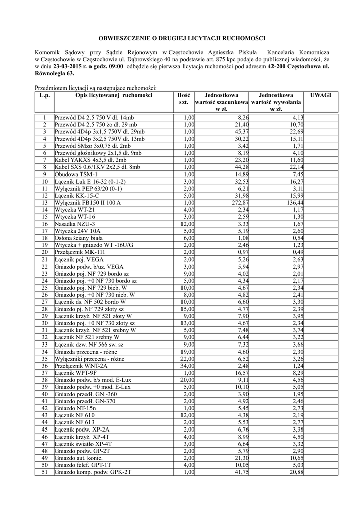 OBWIESZCZENIE O DRUGIEJ LICYTACJI RUCHOMOŚCI Komornik Sądowy przy Sądzie Rejonowym w Częstochowie Agnieszka Piskuła Kancelaria Komornicza w Częstochowie w Częstochowie ul. Dąbrowskiego 40 na podstawie art. 875 kpc podaje do publicznej wiadomości, że w dniu 23-03-2015 r. o godz. 09:00 odbędzie się pierwsza licytacja ruchomości pod adresem 42-200 Częstochowa ul. Równoległa 63. Przedmiotem licytacji są następujące ruchomości: L.p. Opis licytowanej ruchomości 1 2 3 4 5 6 7 8 9 10 11 12 13 14 15 16 17 18 19 20 21 22 23 24 25 26 27 28 29 30 31 32 33 34 35 36 37 38 39 40 41 42 43 44 45 46 47 48 49 50 51 Przewód D4 2,5 750 V dł. 14mb Przewód D4 2,5 750 żo dł. 29 mb Przewód 4D4p 3x1,5 750V dł. 29mb Przewód 4D4p 3x2,5 750V dł. 13mb Przewód SMzo 3x0,75 dł. 2mb Przewód głośnikowy 2x1,5 dł. 9mb Kabel YAKXS 4x3,5 dł. 2mb Kabel SXS 0,6/1KV 2x2,5 dł. 8mb Obudowa TSM-1 Łącznik Łuk E 16-32 (0-1-2) Wyłącznik PEP 63/20 (0-1) Łącznik KK-15-C Wyłącznik FB150 II 100 A Wtyczka WT-21 Wtyczka WT-16 Nasadka NZU-3 Wtyczka 24V 10A Osłona ściany biała Wtyczka + gniazdo WT -16U/G Przełącznik MK-111 Łącznik poj. VEGA Gniazdo podw. b/uz. VEGA Gniazdo poj. NF 729 bordo sz Gniazdo poj. +0 NF 730 bordo sz Gniazdo poj. NF 729 bieb. W Gniazdo poj. +0 NF 730 nieb. W Łącznik ds. NF 502 bordo W Gniazdo pj. NF 729 złoty sz Łącznik krzyż. NF 521 złoty W Gniazdo poj. +0 NF 730 złoty sz Łącznik krzyż. NF 521 srebny W Łącznik NF 521 srebny W Łącznik dzw. NF 566 sw. sz Gniazda przecena - różne Wyłączniki przecena - różne Przełącznik WNT-2A Łącznik WPT-9F Gniazdo podw. b/s mod. E-Lux Gniazdo podw. +0 mod. E-Lux Gniazdo przedł. GN -360 Gniazdo przedł. GN-370 Gniazdo NT-15n Łącznik NF 610 Łącznik NF 613 Łącznik podw. XP-2A Łącznik krzyż. XP-4T Łącznik światło XP-4T Gniazdo podw. GP-2T Gniazdo aut. konic. Gniazdo felef. GPT-1T Gniazdo komp. podw. GPK-2T Ilość Jednostkowa Jednostkowa szt. wartość szacunkowa wartość wywołania w zł. w zł. 1,00 8,26 4,13 1,00 21,40 10,70 1,00 45,37 22,69 1,00 30,22 15,11 1,00 3,42 1,71 1,00 8,19 4,10 1,00 23,20 11,60 1,00 44,28 22,14 1,00 14,89 7,45 3,00 32,53 16,27 2,00 6,21 3,11 5,00 31,98 15,99 1,00 272,87 136,44 4,00 2,34 1,17 3,00 2,59 1,30 12,00 3,33 1,67 5,00 5,19 2,60 6,00 1,08 0,54 2,00 2,46 1,23 2,00 0,97 0,49 2,00 5,26 2,63 3,00 5,94 2,97 9,00 4,02 2,01 5,00 4,34 2,17 10,00 4,67 2,34 8,00 4,82 2,41 10,00 6,60 3,30 15,00 4,77 2,39 9,00 7,90 3,95 13,00 4,67 2,34 5,00 7,48 3,74 9,00 6,44 3,22 9,00 7,32 3,66 19,00 4,60 2,30 22,00 6,52 3,26 34,00 2,48 1,24 1,00 16,57 8,29 20,00 9,11 4,56 5,00 10,10 5,05 2,00 3,90 1,95 2,00 4,92 2,46 1,00 5,45 2,73 12,00 4,38 2,19 2,00 5,53 2,77 2,00 6,76 3,38 4,00 8,99 4,50 3,00 6,64 3,32 2,00 5,79 2,90 2,00 21,30 10,65 4,00 10,05 5,03 1,00 41,75 20,88 UWAGI 52 53 54 55 56 57 58 59 60 61 62 63 64 65 66 67 68 69 70 71 72 73 74 75 76 77 78 79 80 81 82 83 84 85 86 87 88 89 90 91 92 93 94 95 96 97 98 99 100 101 102 103 104 105 106 107 108 109 110 111 112 113 Żarówka 25W Żarówka 40W Żarówka 60W Żarówka 100W Żarówka 150 W Żarówka 200W Żarówka E14 - różna Lampa 100W Philips Żarówka do latarki E-10 2,5V/0,3 Żarówka 6V 0,3A P-13,5 Żarówka choinkowa Świetlówka 18W Leuci Żarówka sodowa WLS Rozłącznik R-301 10A Ogranicznik przepięć WOM 275 S191 B 50A S191B 63A S194B 6A S194B 16A S191C 50A S191C 63A Wył. K60N B 3P1A Wył. K60N B 3P2A Wył. K60N B 3P3A Wył. K60N C 3P1A Wył. K60N C 3P2A Wył. K60N C 3P3A Świetlówka T8 18W Grolux Świetlówka 36W Grolux Świetlówka T5 24W AQUASTAR Zacisk prąd-odgał. 4-25 Zacisk prąd-odgał. 6-25 Zacisk prąd-odgał. 16-95 Zacisk Al-Cu 10-50 Uchwyt pętlic 10-16 Uchwyt pętlic 25-35 Uchwyt pętlic 50-70 Końcówka Km 16 Końcówka Km 35 Końcówka 2KA 50 Końcówka 2KA 185 Cewka do MSM-2 Cewka do SUA 7/12 Wspornik ścienny 100 Podstawa PSW/01 Kanał 90x40 Uchwyt do Rl U-18 szary Złączka 2CLF-18 szara Uchwyt do rur U-47 zwykły Rura peszel 44 dł. 14mb Oprawa Disano Oprawa świetlówkowa K-600 Oprawa świetlówkowa MBFF-13 Gniazod Bezpieczników 100A Gniazdo bezp. 63A zat. Gniazdo bezp. 63A Wkładka WT-1/T 6A Wkładka WT-1/T 10A Wkładka WT-1/T 20A Wkładka WT-1/T 50A Wkładka WT-2/T 315A Wkładka WT-2/T 400A 14,00 19,00 10,00 4,00 3,00 2,00 23,00 1,00 15,00 6,00 12,00 5,00 7,00 2,00 1,00 8,00 2,00 1,00 1,00 6,00 4,00 7,00 3,00 5,00 1,00 1,00 1,00 1,00 1,00 1,00 7,00 30,00 11,00 19,00 11,00 8,00 21,00 5,00 1,00 19,00 5,00 2,00 8,00 35,00 35,00 2,00 30,00 30,00 100,00 1,00 1,00 1,00 3,00 1,00 3,00 4,00 10,00 9,00 11,00 3,00 20,00 8,00 1,28 1,29 1,29 1,55 2,43 3,76 1,50 27,80 0,55 0,54 0,74 4,37 19,68 42,77 64,27 11,89 12,66 55,14 49,38 11,92 14,39 37,18 37,18 37,21 39,64 39,64 39,64 25,88 28,83 30,11 0,85 1,27 3,25 6,89 1,12 1,51 3,14 0,81 1,48 0,80 2,26 3,07 8,66 1,06 1,24 26,52 0,20 0,29 0,23 20,83 363,38 42,16 35,37 17,55 3,43 6,54 3,11 3,11 3,11 7,03 4,67 6,17 0,65 0,65 0,65 0,78 1,22 1,88 0,75 13,90 0,28 0,29 0,37 2,19 9,84 21,38 32,14 5,95 6,33 27,57 27,57 5,96 7,20 18,59 18,59 18,61 19,82 19,82 19,82 12,94 14,42 15,06 0,43 0,64 1,63 3,45 0,56 0,76 1,57 0,41 0,74 0,40 1,13 1,54 4,33 0,53 0,62 13,26 0,10 0,15 0,12 10,42 181,69 21,08 17,69 8,78 1,72 3,27 1,56 1,56 1,56 3,52 2,34 3,09 114 115 116 117 118 119 120 121 122 123 124 125 126 127 128 129 130 131 132 133 134 135 136 137 138 139 140 141 142 143 144 145 146 147 148 149 150 151 152 153 154 155 156 157 158 159 160 161 162 163 164 165 166 167 168 169 170 171 172 173 174 175 Wkładka WTN-00 10A Wstawka 10A Wstawka dolna 20A Przycisk N-226-1 Obudowa sterownicza K-2 Przycisk NEF P-22-KL+Mxy Łącznik N-226-1Z Przycisk XB4B W84M5 Przycisk NEF-30-p Lampka OSW-48 Przekaźnik R-15 3pdt 48VDC Przekaźnik RTS-61 220V Przekaźnik RM-82P 12V DC Wyłącznik M611-1V 0,1-0,16 Wyłącznik M633 10-16 Przyłącze telefonu WT-WT 2mb Przyłącze telefonu WT-WT 5mb Wtyk telefoniczny 8p8c Zaczep elektromagnetyczny R1 Zestaw 16-18/01 4,b Zestaw 16-48(C-O-P 4,b) Zestaw 32-48(C-O