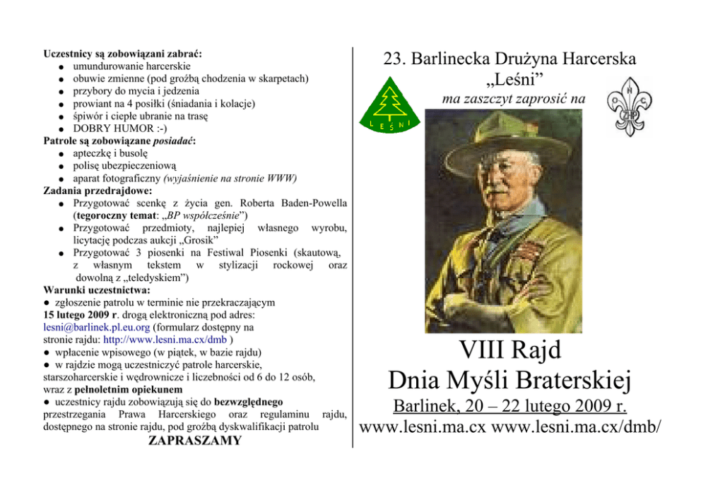 Uczestnicy są zobowiązani zabrać: ● umundurowanie harcerskie ● obuwie zmienne (pod groźbą chodzenia w skarpetach) ● przybory do mycia i jedzenia ● prowiant na 4 posiłki (śniadania i kolacje) ● śpiwór i ciepłe ubranie na trasę ● DOBRY HUMOR :-) Patrole są zobowiązane posiadać: ● apteczkę i busolę ● polisę ubezpieczeniową ● aparat fotograficzny (wyjaśnienie na stronie WWW) Zadania przedrajdowe: ● Przygotować scenkę z życia gen. Roberta Baden-Powella (tegoroczny temat: „BP współcześnie”) ● Przygotować przedmioty, najlepiej własnego wyrobu, licytację podczas aukcji „Grosik” ● Przygotować 3 piosenki na Festiwal Piosenki (skautową, z własnym tekstem w stylizacji rockowej oraz dowolną z „teledyskiem”) Warunki uczestnictwa: ● zgłoszenie patrolu w terminie nie przekraczającym 15 lutego 2009 r. drogą elektroniczną pod adres: [email protected] (formularz dostępny na stronie rajdu: http://www.lesni.ma.cx/dmb ) ● wpłacenie wpisowego (w piątek, w bazie rajdu) ● w rajdzie mogą uczestniczyć patrole harcerskie, starszoharcerskie i wędrownicze i liczebności od 6 do 12 osób, wraz z pełnoletnim opiekunem ● uczestnicy rajdu zobowiązują się do bezwzględnego przestrzegania Prawa Harcerskiego oraz regulaminu rajdu, dostępnego na stronie rajdu, pod groźbą dyskwalifikacji patrolu ZAPRASZAMY 23. Barlinecka Drużyna Harcerska „Leśni” ma zaszczyt zaprosić na VIII Rajd Dnia Myśli Braterskiej Barlinek, 20 – 22 lutego 2009 r. www.lesni.ma.cx www.lesni.ma.cx/dmb/ REGULAMIN VIII RAJDU DNIA MYŚLI BRATERSKIEJ PROGRAM RAJDU (ver. 1.4) PIĄTEK od 18:00 – zakwaterowanie i kolacja Termin rajdu: 20 – 22 lutego 2009 r. Organizator: 23. Barlinecka Drużyna Harcerska „Leśni” 20:00 – apel rozpoczynający 20:30 – aukcja „Grosik” Komenda rajdu: 21:30 – świeczkowisko rozpoczynające komendant: pwd. Jakub Syroka HO 23:00 – moczydelska gra nocna (MGN) z-ca komendanta: sam. Marta Rogozińska CISZA NOCNA z-ca komendanta: ćw. Adrian Płaczek SOBOTA kwatermistrz: wyw. Mateusz Klimczak 8:00 – pobudka oraz pion. Ewelina Stępień 9:00 – odprawa patrolowych Baza rajdu: Zespół Szkół Ponadgimnazjalnych Nr 1 im. 9:30 – rozpoczęcie biegu harcerskiego kpt. hm. Andrzeja Romockiego „Morro” w Barlinku BIEG HARCERSKI – Barlinek i okolica (obiad w trakcie) ul. Szosowa 2b, Barlinek (dojazd na stronie WWW) do 15:00 – powrót z trasy Cele rajdu: 15:00 – konkurs kadryla ● uczczenie Dnia Myśli Braterskiej 16:00 – Festiwal Piosenki Harcerskiej ● współzawodnictwo patroli 17:00 – five o'clock ● poznanie Barlinka oraz piękna przyrody jego okolic 17:15 – turniej polo ● kontakt z kulturą i sztuką „własnej produkcji” 18:30 – konkurs scenek z życia BP ● dobra zabawa :-) 19:30 – kolacja Organizatorzy zapewniają: 20:30 – świeczkowisko uroczyste ● dwa noclegi 23:00 - CISZA NOCNA ● obiad w sobotę (podczas biegu harcerskiego) NIEDZIELA ● herbatę podczas pobytu w bazie (teraz już będzie) 8:00 – pobudka ● nagrody dla każdego patrolu do 10:00 – śniadanie i sprzątanie Wpisowe wynosi: 15 zł (opiekunowie są zwolnieni) 10:00 – apel końcowy (razie potrzeby może być wcześniej) pełna treść regulaminu jest dostępna na stronie do 10:30 – opuszczenie bazy rajdu http://www.lesni.ma.cx/dmb/