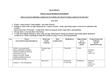PLAN PRACY WRAZ Z KALENDARIUM WYDARZEŃ SPECJALNEGO OŚRODKA SZKOLNO-WYCHOWAWCZEGO W ROKU SZKOLNYM 2012/2013 MAJ 2013 Święta: 1 maja (środa) i 3 maja (piątek) – dni wolne od pracy. Dodatkowy dzień wolny od zajęć edukacyjnych: 2 maja (czwartek) - szkoły zapewniają zajęcia wychowawczo-opiekuńcze dla uczniów. Łącznie dni wolne: 29 kwietnia – 5 maja 2013r. Dzieci wracają do szkoły 6 maja 2013r. (poniedziałek). 30 maja 2013r. (czwartek) Boże Ciało Święto 31 maja 2013 (piątek) dodatkowy dzień wolny od zajęć edukacyjnych. Szkoła i przedszkole zapewniają zajęcia opiekuńczowychowawcze. Dzieci wyjeżdżają 29 maja 2013 (środa) wracają 3 czerwca 2013 (poniedziałek). L.p. Nazwa uroczystości/wydarzenia/imprezy Udział w uroczystościach DNIA GODNOŚCI OSÓB Z NIEPEŁNOSPRAWNOŚCIĄ INTELEKTUALNĄ SEKSUALNOŚĆ OSÓB NIEPEŁNOSPRAWNYCH INTELEKTUALNIE Konkurs o Unii Europejskiej Planowany termin realizacji Data zrealizowania Realizatorzy Początek maja 2013 I.Nagrodzka 09.05.2013 M.Żołnieruk K.Otorowska Odpowiedzial ny za realizację i jakość Uwagi do planu lub realizacji Sposób dokumentowania M.lech Scenariusz Zdjęcia strona www B.Pałubicka Scenariusz Zdjęcia strona www protokół Wysyłanie informacji o zagrożeniach rocznych (oceną niedostateczną, naganną lub nieklasyfikowaniem) lub przekazanie informacji na zebraniu z rodzicami „Urodziny Marysi” – w rocznicę urodzin Patronki Marii Konopnickiej Wielospecjalistyczna ocena funkcjonowania ucznia: ewaluacja IPET, konstruowanie IPET na r. szk. 2013/2014 Przekazanie wicedyrektrowi do 17.05.2013r. Wychowawcy klas B. Pałubicka G. BUlczak-Kulka B.Pałubicka Wysyłanie: Do 20.05.2013r. Scenariusz Zdjęcia strona www 23.05. 2013 Zgodnie z ustalonym terminarzem Wychowawcy klas, wychowawcy grup, wychowawcy grup PS, pedagog, psycholog, wicedyrektor M.Lech ZAJĘCIA OTWARTE W PRZEDSZKOLU „ ŻYJMY ZDROWO” IPE-T, terminarz, protokoły Dokumentacja zgodnie z obowiązującymi procedurami Udział w Turnieju Wiedzy o Bezpieczeństwie Ruchu Drogowego w Policach Ewaluacja przebiegu terapii dzieci objętych wczesnym wspomaganiem rozwoju Kopie zawiadomień w aktach uczniów Zgodnie z ustalonym terminarzem Terapeuci WW, wychowawcy grup PS, psycholog M. Lech 15.05.2013 I. Santorek M.Lech Dokumenty, protokoły. Scenariusz Zdjęcia strona www 28.05.2013 II Piknik Rodzinny w przedszkolu Wycieczka do ZOo w Volgaście WOJEWÓDZKI KONKURS EKOLOGICZNO-MATEMATYCZNY M.Lech V.Gawlińska B. Pałubicka 15.05.2013 Pomiędzy: 20 a 24.05. 2013 Rajd rowerowy „4 atmosfery” do Niemiec MISTRZOSTWA WOJEWÓDZTWA W PIŁCE NOŻNEJ W ŚWINOUJŚCIU Zespól Samokształceniowy matematycznoprzyrodniczy T.Janicka 14-17.05.2013 Scenariusz Zdjęcia strona www Karta wycieczki Scenariusz Zdjęcia strona www M.Lech B.Pałiubicka Scenariusz Zdjęcia strona www protokół M.Mackiewicz E.Derlikiewicz Ż.Burnos M.Lech Karta wycieczki Scenariusz Zdjęcia strona www P.Jakubowski E.Lelek M.Lech Scenariusz Zdjęcia strona www protokół M.Lech Dokumentacja zgodnie z obowiązującymi procedurami B.Pałubicka Testy Wyniki analizy P.Jakubowski Udział w Mistrzostwach Województwa w Lekkiej Atletyce w Pyrzycach Pomiar porównawczy_ przyrost poziomu procesów poznawczych kl. I-III E. Mayko I.Santorek I.Stasiak B.HOffnowska 14-17.05.2013 II pomiar porównawczy – przyrost wiadomości i umiejętności kl. IV 13.- 15.05.2013 I Pomiar dydaktyczny – próbny egzamin praktyczny - kl. II ZSZ WIEM POTRAFIĘ ROBIĘ zajęcia praktyczne integracyjne dla SPP, ZET GIM i Szkoły w Zirchow II połowa maja 2013 K. Warś J.Ryszka B.Pałubicka S.Kruk WBambrowicz B.Pałubicka A.Michalska G. Kos A. Grodnicka B.Pałubicka A.MIchalska B.Pałubicka S. Kruk W.Lemańska B.Pałubicka Rajd pieszy „Dziurawego Trampka” A.MIachalska Z.Leciej M.Nowak Testy Wyniki analizy Scenariusz Zdjęcia strona www protokół Wycieczka dydaktyczna SPP B Wyjazd do Ośrodka Egzaminacyjnego (etap praktyczny egzaminu potwierdzającego kwalifikacje zawodowe kucharz małej gastronomii) Testy Wyniki analizy M.Lech Karta wycieczki Scenariusz Zdjęcia strona www Dokumentacja zgodnie z obowiązującymi procedurami Karta wycieczki Scenariusz Zdjęcia strona www