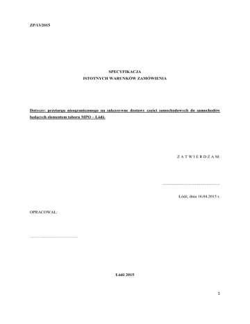 ZP/13/2015 SPECYFIKACJA ISTOTNYCH WARUNKÓW ZAMÓWIENIA Dotyczy: przetargu nieograniczonego na sukcesywne dostawy części samochodowych do samochodów będących elementem taboru MPO – Łódź. Z A T W I E R D Z A M: ....................................................... Łódź, dnia 16.04.2015 r. OPRACOWAŁ: ………..…………………… Łódź 2015 1 1. Informacje ogólne Tryb zamówienia: przetarg nieograniczony Zamawiający: Miejskie Przedsiębiorstwo Oczyszczania – Łódź Sp. z o.o. Adres zamawiającego: ul. Tokarzewskiego 2, 91-842 Łódź. Telefon/Faks: +42 616-04-14 / +42 616-07-51 Internet: http://www.mpolodz.pl E-mail: [email protected]; Podstawa prawna: Ustawa z dnia 29 stycznia 2004 r. Prawo zamówień publicznych zwana w dalszej części specyfikacji „ustawą”. 2. Przedmiot zamówienia 1. Przedmiotem niniejszego zamówienia są sukcesywne dostawy części samochodowych do samochodów ciężarowych oraz osobowych wchodzących w skład zaplecza technicznego MPO – Łódź. 2. Asortyment najczęściej zamawianych części podany jest w formularzu cenowym stanowiącym załącznik nr 6 do SIWZ. Wartość oferty najkorzystniejszej nie będzie wartością umowy. Wartością umowy będzie wartość brutto zamówienia ustalona przez Zamawiającego i podana bezpośrednio przed otwarciem ofert. 3. Zamawianie części odbywać się będzie za pomocą faxu lub poczty elektronicznej z podaniem numeru katalogowego części, marki oraz typu pojazdu. W sytuacji, gdy Zamawiający nie będzie mógł podać numeru katalogowego części, Wykonawca będzie miał obowiązek dokonać dostawy części na podstawie wzoru (np. uszkodzonej części wymagającej wymiany), przekazanego przez Zamawiającego. 4. W przypadku opóźnienia dostawy części przekraczającego termin wskazany w pkt. 3.3 Zamawiający będzie mógł dokonać zakupu części, u innego dostawcy a Wykonawcę obciąży ewentualną różnicą kosztów zakupu. 5. Zamawiający zastrzega sobie możliwość zmniejszenia zamówienia zgodnie z jego potrzebami. W przypadku zmniejszenia ilości zamawianych części, Wykonawcy nie przysługuje żadne roszczenie wobec Zamawiającego 6. Dostawy części będą przyjmowane przez Zamawiającego wyłącznie w dni robocze od poniedziałku do piątku w godz. 6.00 – 21.00. Rozładunek dostarczonych części może nastąpić wyłącznie w obecności pracownika zamawiającego, który potwierdza to w dokumencie WZ wykonawcy. Zamawiający może, wg. swoich potrzeb, wyrazić zgodę na dostawę części w: soboty, dni świąteczne, oraz poza godzinami 6.00 – 21.00. 7. Termin realizacji (dla sukcesywnie składanych zamówień) liczony jest od dnia przesłania Wykonawcy zamówienia (faxem lub e-mailem) przez Zamawiającego, do godziny dnia faktycznie zrealizowanej dostawy (loco magazyn Zamawiającego – Łódź ul. Tokarzewskiego 2) i maksymalnie może wynosić 24 godziny. Jeżeli 24 godzinny termin dostawy upływa w dzień wolny, w który Zamawiający nie dokonuje przyjęcia części, to dostawa musi być dokonana najpóźniej do godz. 9:00 pierwszego dnia roboczego następującego po dniu wolnym od pracy, w którym upłynął termin dostawy. Zamawiający może żądać wykonania dostawy w dzień wolny od pracy ( sobota oraz dzień świąteczny ). 8. Termin płatności wynosi 30 dni od realizacji każdorazowego zamówienia i dostarczenia faktury VAT Zamawiającemu. 2 9. Wymagane jest, aby części zamienne będące przedmiotem zamówienia były dostarczane fabrycznie nowe i kompletne, oryginalne lub części zamienne o porównywalnej jakości: Zgodnie z obowiązującymi przepisami pod pojęciem; a/ oryginalnej części zamiennej należy rozumieć części zamienne o tej samej jakości co komponenty stosowane do montażu pojazdu samochodowego produkowane zgodnie ze specyfikacjami i standardami produkcyjnymi ustalonymi przez producenta tych pojazdów do produkcji komponentów lub części zamiennych danego pojazdu samochodowego, w tym części zamienne produkowane na tej samej linii produkcyjnej co komponenty danego pojazdu samochodowego; przyjmuje się że części zamienne są oryginalne jeżeli producent tych części zaświadczy, że zostały one wyprodukowane zgodnie ze specyfikacjami i standardami produkcyjnymi ustalonymi przez producenta danych pojazdów i są one tej samej jakości co części stosowane do montażu tych pojazdów, b/ części zamiennej o porównywalnej jakości należy rozumieć części zamienne, których producent zaświadczy, że są one tej samej jakości co komponenty które są lub były stosowane do montażu danych pojazdów samochodowych, c/ części zamienne (oryginalne lub części o porównywalnej jakości) związane z bezpieczeństwem użytkowania pojazdów i ochroną środowiska mogą być montowane w pojazdach, jeżeli spełniony jest co najmniej jeden z następujących warunków: oznakowane są znakami homologacji międzynarodowej stosowanymi w homologacji Europejskiej Komisji Gospodarczej Organizacji Narodów Zjednoczonych (EKG ONZ) - "E" lub Unii Europejskiej - "e"; oznakowane są cechami producenta pojazdu, na który wystawiono krajowe świadectwo homologacji typu pojazdu; ocechowanie to powinno być zgłoszone do upoważnionej jednostki celem ewidencji; oznakowane są cechami dostawcy producenta pojazdu, na który wystawiono krajowe świadectwo homologacji typu pojazdu; ocechowanie to powinno być zgłoszone do upoważnionej jednostki celem ewidencji; oznakowane są znakiem zgodności zgodnie z przepisami o systemie oceny zgodności i akredytacji; przepisu nie stosuje się do przedmiotów wyposażenia i części oznakowanych znakiem bezpieczeństwa na podstawie dotychczasowych przepisów o badaniach i certyfikacji; Wykaz części związanych z bezpieczeństwem użytkowania pojazdu i ochroną środowiska podlegających sprawdzeniu w tym zakresie przez jednostki akredytowane w polskim systemie akredytacji określa załącznik nr 3 do Rozporządz