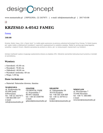 www.momastudio.pl | INFOLINIA.: 22 2437671 | e-mail: [email protected] | 2017-03-08 KRZESŁO A-0542 FAMEG Fameg 340.00 Krzesła, fotele i ławy z linii „Classic bent” to meble gięte wykonane za pomocą unikalnej technologii firmy Fameg. To fotele bujane, jak i gięte meble o efektownych kształtach i oparciach wyposażonych w ozdobne zawijasy. Meble te zachwycają swoją łagodną sylwetką i ciepłymi liniami. Idealnie sprawdzą się zarówno w domu, jak i w restauracjach, kawiarniach czy hotelach. Istnieje możliwość wyboru kryjącego wybarwienia drewna za dopłatą 15%. Odnośnie wariantów kolorystycznych prosimy o kontakt ze sprzedawcą. Wymiary ● ● ● ● ● Szerokość: 45.00 cm Wysokość: 79.00 cm Głębokość: 48.00 cm Wysokość siedziska: 49 cm Waga: 5.00 kg Dane techniczne ● Materiał: Naturalne drewno, tkanina WARSZAWA Al. Krakowska 6a 05-090 Janki k/Warszawy tel: +48 22 2437671 +48 664 890 337 e-mail: [email protected] GDAŃSK CH RENTAL PARK ul. Przywidzka 7 80-001 Gdańsk tel: +48 58 3508790 e-mail: [email protected] KRAKÓW ul. Zakopiańska 56 30-418 Kraków tel: +48 505 436 669 tel: +48 12 3070112 e-mail: [email protected] WROCŁAW ul. Wrocławska 7 55-040 Wrocław tel: +48 71 3461885 e-mail: [email protected]
