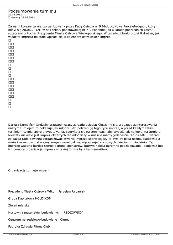 Osiedle nr 9 NOWE PARCELE Podsumowanie turnieju 29.05.2012. Zmieniony 29.05.2012. Za nami kolejny turniej zorganizowany przez Radę Osiedla nr 9 „Nowe Parcele”, który odbył się 20.06.2012r. w hali szkoły podstawowej nr 7 . Podobnie jak w latach poprzednich został rozegrany o Puchar Prezydenta Miasta Ostrowa Wielkopolskiego. W tej edycji brało udział 8 drużyn, jak widać ta impreza na stałe wpisała się w kalendarz ostrowskich imprez. Dariusz Kempiński – przewodniczący zarządu osiedla: Cieszymy się, z dużego zainteresowania naszym turniejem to pokazuje jak młodzi ludzi potrzebują tego typu imprez, a przed każdym takim turniejem czynią spore przygotowania, spotykają się na treningach aby wypaść jak najlepiej na turnieju. Niestety niewiele jest imprez otwartych dla młodzieży w mieście mamy jedenaście rad osiedli i uważam, że każda rada powinna zorganizować otwartą imprezę sportową czy to była by piłka nożna, siatkówka a może i nawet dart, starajmy zorganizować jak najwięcej zajęć ruchowych dzieciom i młodzieży. Tą imprezę wsparło bardzo szerokie grono sponsorów, którym należą ogromne podziękowania, ponieważ bez ich pomocy organizacja imprezy w takiej formie była by niemożliwa. Organizację turnieju wsparli: Prezydent Miasta Ostrowa Wlkp. Jarosław Urbaniak Grupa Kapitałowa HOLDIKOM Zieleń miejska Hurtownia materiałów budowlanych Centrum narzędziowo-budowlane RZOZOWSCY Olmet Fabryka Zdrowia Fitnes Club http://os9.ostrowwlkp.org Kreator PDF Utworzono 8 March, 2017, 16:07 Osiedle nr 9 NOWE PARCELE OBI Aeroklub Ostrowski Dystrybutor pokryć dachowych HOFFMAX Ostrowskie Centrum Tenisowe RAFA Producent konstrukcji stalowych WITPOL Elektro-dom Dystrybutor wody BONART Studio Reklamy ATA Producent galanterii skurzanej LAREDO - okna, drzwi, rolety torbyitorebki.pl bramy Hydraulika siłowa ORING Trofea Sportowe AMS Telewizja internetowa ESPORTTV Nauka Jazdy RYNOWIECKI Dystrybutor sprzętu komputerowego notebooki.pl Dostawca usług internetowych INFO-NET Patronat Medialny Esporttv Promax Gazeta Ostrowska Radio ESKA W tym roku również zostały zorganizowane dodatkowe konkursy dla zawodników jak i dla publiczności, swoją konkurencję miały również dzieci, które rzucały piłką do mini kosza, dla każdego chcieliśmy coś zorganizować i cel udało się osiągnąć. Na widowni zjawiły się całe rodziny zawodników, które dopingowały do samego meczu finałowego. Przed meczem finałowym została przeprowadzona rozgrywka sponsorzy vs media, niektórym z publiczności i pozostałych drużyn wydawało się, że nic ciekawego w tym meczy się nie wydarzy, ale akcje jakie miały miejsce wiele osób mile zaskoczyły. Ostatecznie sponsorzy wygrali z mediami 30:25 wszyscy przybili sobie „piątki” i podziękowali za miłą grę. http://os9.ostrowwlkp.org Kreator PDF Utworzono 8 March, 2017, 16:07 Osiedle nr 9 NOWE PARCELE Imprezie tej towarzyszyła bardzo szeroka kampania informacyjna która dzięki lokalnym mediom : Esporrtv, Promax , Gazeta Ostrowska i radio Eska jak i portalowi Urzędu Miejskiego mogła być tak nagłośniona na szeroką skalę, do tego dzięki firmie Info-Net, która dostarczyła łącze internetowe na hale i firmie Esporttv, która po raz kolejny profesjonalnie obsłużyła tą impreze , mogliśmy oglądać transmisję na żywo w internecie, która cieszyła bardzo dużym zainteresowaniem. To wspaniała forma promocji sportu jak i naszego miasta. Konkurs rzutów dla publiczności kobiety: Margareta Majcher Konkurs rzutów z połowy: Sołtysiak Rafał Wsady: Tomasz Zyber Konkurs rzutów za 3 p-kty : Łukasz Wojciechowski Wyróżnienie: Adrian Lis z 4 gim Najlepszego Rozgrywającego: Michał Hybiak Najlepszego Rzucającego Obrońcy: Paweł Grzela Najlepszego Skrzydłowego: Łukasz Wojciechowski Najlepszego Silnego Skrzydłowego: Łukasz Ryczko Najlepszego Centra: Tomasz Zyber IV miejsce PSW 4. Mariusz Klupś 5. Tomasz Zyber 6. Tomasz Cieśla 7. Adam Mocydlarz 8. Bartosz Gil 9. Patryk Cebulski 10. Bartosz Ziemniewicz III - oczy waszki 4. Nizio Bartosz http://os9.ostrowwlkp.org Kreator PDF Utworzono 8 March, 2017, 16:07 Osiedle nr 9 NOWE PARCELE 5. Sołtysiak Rafał 6. Michał Hybiak 7. Piotr Figas 8. Michał Zeissel 9. Mateusz Marecki 10. Jacek Smarsz II Miejsce Miażdżyca 4. Maciej Maciejewski 5. Tomasz Mielcarek 8. Łukasz Ryczko 11. Pawel Grzela 13. Cyryl Kuczera 15. Damian Kupś 15’ Maurycy Kuczera I miejsce ZBW 4.Adam Kaczmarzyk (pzkosz) 5.Daniel Matyśkiewicz 6.Filip Pietrzak 7.Adam Jędrzejewski 8.Łukasz Wojciechowski (pzkosz) 9. Płuciennik Maciej 10. Marcin Banaszkiewicz MVP – Adam Kaczmarzyk Nagroda specjalna – Maciej Maciejewski http://os9.ostrowwlkp.org Kreator PDF Utworzono 8 March, 2017, 16:07 Osiedle nr 9 NOWE PARCELE Lista zawodników sponsorów nr na koszulce 4 Krzysztof Brzozowski - firma WMK Brzozowscy 5 Marcin Lis - Woda Bonart 6 Sławek Junak - Laredo 7 Jacek Rudowicz - centrum sportowe RAFA 8 Karol Hoffman - firma HOFFMAX 9 Marcin Binek - centrum sportowe RAFA 10 Dariusz Kempiński - firma INFO-NET 11 Radosław Rynowiecki - Nauka jazdy Rynowiecki 12 Grzegorz Antkowiak - centrum narzędziowe OLMET 13 Jacek Witek - firma WITPOL 16 Jakub Grobelny SP7 Mecz sponsorzy vs media 30:25 http://os9.ostrowwlkp.org Kreator PDF Utworzono 8 March, 2017, 16:07 Osiedle nr 9 NOWE PARCELE Jeżeli tylko to będzie tylko możliwe, postaramy się, aby w przyszłym roku zorganizować po raz kolejny turniej, bo jak widać takich imprez powinno być jak najwięcej . Relację z tego turnieju można obejrzeć w serwisie internetowym www.esporttv.pl jak i na stronie Rady Osiedla nr 9 NOWE PARCELE www.os9.ostrowwlkp.org http://os9.ostrowwlkp.org Kreator PDF Utworzono 8 March, 2017, 16:07