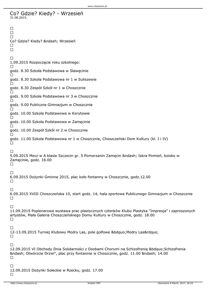 www.choszczno.pl Co? Gdzie? Kiedy? - Wrzesień 31.08.2015. Co? Gdzie? Kiedy? – Wrzesień 1.09.2015 Rozpoczęcie roku szkolnego: godz. 8.30 Szkoła Podstawowa w Sławęcinie godz. 8.30 Szkoła Podstawowa nr 1 w Suliszewie godz. 8.30 Zespół Szkół nr 1 w Choszcznie godz. 9.00 Szkoła Podstawowa nr 3 w Choszcznie godz. 9.00 Publiczne Gimnazjum w Choszcznie godz. 10.00 Szkoła Podstawowa w Korytowie godz. 10.00 Szkoła Podstawowa w Zamęcinie godz. 10.00 Zespół Szkół nr 2 w Choszcznie godz. 11.00 Szkoła Podstawowa nr 1 w Choszcznie, Choszczeński Dom Kultury (kl. I i IV) 5.09.2015 Mecz w A klasie Szczecin gr. 5 Pomorzanin Zamęcin – Iskra Pomień, boisko w Zamęcinie, godz. 16.00 6.09.2015 Dożynki Gminne 2015, plac koło fontanny w Choszcznie, godz.12.00 6.09.2015 XVIII Choszczeńska 10, start godz. 14, hala sportowa Publicznego Gimnazjum w Choszcznie 11.09.2015 Poplenerowa wystawa prac plastycznych członków Klubu Plastyka "Impresja" i zaproszonych artystów, Mała Galeria Choszczeńskiego Domu Kultury w Choszcznie, godz. 18.00 12-13.09.2015 Turniej Klubowy Modry Las, pole golfowe „Modry Las” 12.09.2015 VI Obchody Dnia Solidarności z Osobami Chorymi na Schizofrenię „Schizofrenia – Otwórzcie Drzwi", plac przy fontannie w Choszcznie, godz. 11.00 – 14.00 12.09.2015 Dożynki Sołeckie w Rzecku, godz. 17.00 http://www.choszczno.pl Kreator PDF Utworzono 8 March, 2017, 18:22 www.choszczno.pl 12.09.2015 Mecz w regionalnej okręgówce gr. Szczecin Płd. Gavia Choszczno – Remor Recz, stadion miejskie w Choszcznie, godz. 15.00 13.09.2015 Mecz w B klasie Szczecin gr. 4 Gavia II Choszczno – Mercury Nowogródek Pomorski, boisko w Sławęcinie, godz. 14.00 13.09.2015 Mecz w B klasie Szczecin gr. 4 Pionier Zwierzyn – Drawa Drawno, boisko w Zwierzyniu, godz. 14.00 14.09.2015 VI edycja Turnieju o Puchar Premiera RP dla dziewcząt i chłopców w wieku 10 - 11 i 12 - 13 lat - rocznik 2002 - 2003 dziewczęta, boisko Orlik 2012 w Choszcznie, godz. 11.00 15.09.2015 VI edycja Turnieju o Puchar Premiera RP dla dziewcząt i chłopców w wieku 10 - 11 i 12 - 13 lat - rocznik 2002 - 2003 chłopcy, boisko Orlik 2012 w Choszcznie, godz. 11.00 16.09.2015 VI edycja Turnieju o Puchar Premiera RP dla dziewcząt i chłopców w wieku 10 - 11 i 12 - 13 lat - rocznik 2004 - 2005 chłopcy, boisko Orlik 2012 w Choszcznie, godz. 11.00 18.09.2015 VIII Choszczeński Bieg Terenowy dla młodzieży szkolnej, Plac Witosa, godz. 10.00 19.09.2015 Dożynki Sołeckie w Suliszewie, godz. 17.00 19.09.2015 Mecz w A klasie Szczecin gr. 5 Korona Raduń – Iskra Pomień, boisko w Raduniu 20.09.2015 Zawody wędkarskie OPEN 2015 – „Koniec Lata”, jezioro Raduń, godz. 9.00 – 13.00 20.09.2015 Mecz w B klasie Szczecin gr. 4 Pionier Zwierzyn – Orzeł Żeńsko, boisko w Zwierzyniu, godz. 14.00 20.09.2015 Mecz w A klasie Szczecin gr. 5 Pomorzanin Zamęcin – Ina Nadarzyn, boisko w Zamęcinie, godz. 15.00 http://www.choszczno.pl Kreator PDF Utworzono 8 March, 2017, 18:22 www.choszczno.pl 22.09.2015 Europejski Dzień bez Samochodu, zbiórka na placu koło fontanny w Choszcznie, godz. 17.00 25.09.2015 Wystawa prac inspirowanych twórczością ZDZISŁAWA BEKSIŃSKIEGO, Mała Galeria Choszczeńskiego Domu Kultury, godz. 17.30 26.09.2015 Mecz w regionalnej okręgówce gr. Szczecin Płd. Gavia Choszczno – Orzeł Trzcińsko – Zdrój, stadion miejskie w Choszcznie, godz. 16.00 26.09.2015 Mecz w B klasie Szczecin gr. 4 Gavia II Choszczno – Iskra Warszyn, boisko w Sławęcinie 26 - 27.09.2015 Turniej Tenisa Zimnego, korty tenisowe ul. Mur Południowy w Choszcznie http://www.choszczno.pl Kreator PDF Utworzono 8 March, 2017, 18:22