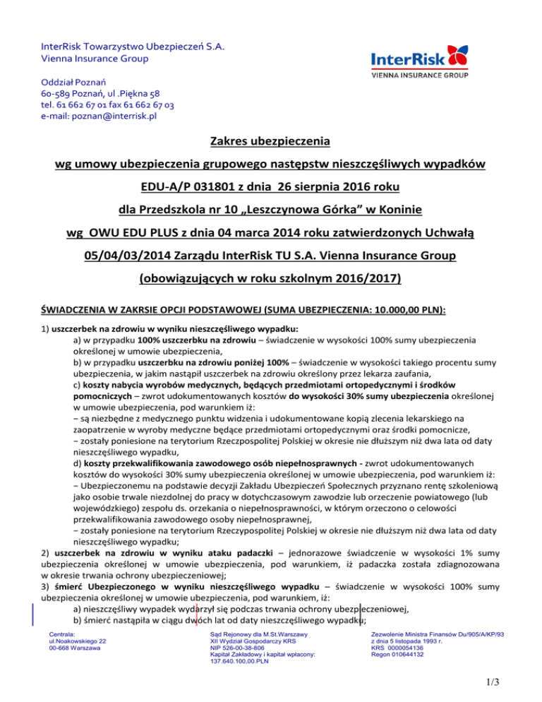 InterRisk Towarzystwo Ubezpieczeń S.A. Vienna Insurance Group Oddział Poznań 60-589 Poznań, ul .Piękna 58 tel. 61 662 67 01 fax 61 662 67 03 e-mail: [email protected] Zakres ubezpieczenia wg umowy ubezpieczenia grupowego następstw nieszczęśliwych wypadków EDU-A/P 031801 z dnia 26 sierpnia 2016 roku dla Przedszkola nr 10 „Leszczynowa Górka” w Koninie wg OWU EDU PLUS z dnia 04 marca 2014 roku zatwierdzonych Uchwałą 05/04/03/2014 Zarządu InterRisk TU S.A. Vienna Insurance Group (obowiązujących w roku szkolnym 2016/2017) ŚWIADCZENIA W ZAKRSIE OPCJI PODSTAWOWEJ (SUMA UBEZPIECZENIA: 10.000,00 PLN): 1) uszczerbek na zdrowiu w wyniku nieszczęśliwego wypadku: a) w przypadku 100% uszczerbku na zdrowiu – świadczenie w wysokości 100% sumy ubezpieczenia określonej w umowie ubezpieczenia, b) w przypadku uszczerbku na zdrowiu poniżej 100% – świadczenie w wysokości takiego procentu sumy ubezpieczenia, w jakim nastąpił uszczerbek na zdrowiu określony przez lekarza zaufania, c) koszty nabycia wyrobów medycznych, będących przedmiotami ortopedycznymi i środków pomocniczych – zwrot udokumentowanych kosztów do wysokości 30% sumy ubezpieczenia określonej w umowie ubezpieczenia, pod warunkiem iż: − są niezbędne z medycznego punktu widzenia i udokumentowane kopią zlecenia lekarskiego na zaopatrzenie w wyroby medyczne będące przedmiotami ortopedycznymi oraz środki pomocnicze, − zostały poniesione na terytorium Rzeczpospolitej Polskiej w okresie nie dłuższym niż dwa lata od daty nieszczęśliwego wypadku, d) koszty przekwalifikowania zawodowego osób niepełnosprawnych - zwrot udokumentowanych kosztów do wysokości 30% sumy ubezpieczenia określonej w umowie ubezpieczenia, pod warunkiem iż: − Ubezpieczonemu na podstawie decyzji Zakładu Ubezpieczeń Społecznych przyznano rentę szkoleniową jako osobie trwale niezdolnej do pracy w dotychczasowym zawodzie lub orzeczenie powiatowego (lub wojewódzkiego) zespołu ds. orzekania o niepełnosprawności, w którym orzeczono o celowości przekwalifikowania zawodowego osoby niepełnosprawnej, − zostały poniesione na terytorium Rzeczypospolitej Polskiej w okresie nie dłuższym niż dwa lata od daty nieszczęśliwego wypadku; 2) uszczerbek na zdrowiu w wyniku ataku padaczki – jednorazowe świadczenie w wysokości 1% sumy ubezpieczenia określonej w umowie ubezpieczenia, pod warunkiem, iż padaczka została zdiagnozowana w okresie trwania ochrony ubezpieczeniowej; 3) śmierć Ubezpieczonego w wyniku nieszczęśliwego wypadku – świadczenie w wysokości 100% sumy ubezpieczenia określonej w umowie ubezpieczenia, pod warunkiem, iż: a) nieszczęśliwy wypadek wydarzył się podczas trwania ochrony ubezpieczeniowej, b) śmierć nastąpiła w ciągu dwóch lat od daty nieszczęśliwego wypadku; Centrala: ul.Noakowskiego 22 00-668 Warszawa Sąd Rejonowy dla M.St.Warszawy XII Wydział Gospodarczy KRS NIP 526-00-38-806 Kapitał Zakładowy i kapitał wpłacony: 137.640.100,00.PLN Zezwolenie Ministra Finansów Du/905/A/KP/93 z dnia 5 listopada 1993 r. KRS 0000054136 Regon 010644132 1/3 4) zdiagnozowanie u Ubezpieczonego sepsy – jednorazowe świadczenie w wysokości 10% sumy ubezpieczenia określonej w umowie ubezpieczenia, pod warunkiem, iż sepsa została zdiagnozowana w okresie trwania ochrony ubezpieczeniowej; 5) śmierć rodzica Ubezpieczonego w następstwie nieszczęśliwego wypadku - jednorazowe świadczenie w wysokości 10% sumy ubezpieczenia określonej w umowie ubezpieczenia, pod warunkiem, iż: a) nieszczęśliwy wypadek wydarzył się podczas trwania ochrony ubezpieczeniowej, b) śmierć nastąpiła w ciągu 12 miesięcy od daty nieszczęśliwego wypadku; 6) pogryzienie przez psa – jednorazowe świadczenie w wysokości 1% sumy ubezpieczenia określonej w umowie ubezpieczenia. ROZSZERZENIE ZAKRESU OPCJI PODSTAWOWEJ O OPCJE DODATKOWE : 1) Opcja Dodatkowa D4 – pobyt w szpitalu w okresie ubezpieczenia w wyniku nieszczęśliwego wypadku – świadczenie w wysokości 1% sumy ubezpieczenia określonej w umowie ubezpieczenia dla Opcji Dodatkowej D4 (s.u. 4.000,00 PLN – świadczenie dzienne 40,00 PLN), za każdy następny dzień pobytu Ubezpieczonego w szpitalu, począwszy od trzeciego dnia pobytu w szpitalu, będącego następstwem nieszczęśliwego wypadku, który miał miejsce w okresie trwania ochrony ubezpieczeniowej. W przypadku kolejnych, następujących po sobie pobytów w szpitalu w związku z tym samym nieszczęśliwym wypadkiem świadczenie szpitalne przysługuje od pierwszego dnia pobytu w szpitalu. Świadczenie z tytułu pobytu w szpitalu w wyniku nieszczęśliwego wypadku przysługuje maksymalnie za 90 dni pobytu Ubezpieczonego w szpitalu w ciągu okresu ubezpieczenia; 2) Opcja Dodatkowa D5 – pobyt w szpitalu w okresie ubezpieczenia w wyniku choroby – świadczenie w wysokości 1% sumy ubezpieczenia określonej w umowie ubezpieczenia dla Opcji Dodatkowej D5 (s.u.4.000,00 PLN – świadczenie dzienne 40,00 PLN), za każdy następny dzień pobytu Ubezpieczonego w szpitalu, począwszy od trzeciego dnia pobytu w szpitalu, w związku z chorobą, która została zdiagnozowana w trakcie trwania ochrony ubezpieczeniowej. W przypadku kolejnych, następujących po sobie pobytów w szpitalu w związku z tą samą chorobą świadczenie szpitalne przysługuje od pierwszego dnia pobytu w szpitalu. Świadczenie z tytułu pobytu w szpitalu w wyniku choroby przysługuje maksymalnie za 60 dni pobytu w szpitalu w ciągu okresu ubezpieczenia; 3) Opcja Dodatkowa D8 – operacje w wyniku nieszczęśliwego wypadku – świadczenie w wysokości stanowiącej procent sumy ubezpieczenia określonej w umowie ubezpieczenia dla Opcji Dodatkowej D8 (s.u. 2.000,00 PLN), uzależnione od rodzaju operacji określonej wyłącznie w TABELI nr 8 OWU EDU PLUS, pod warunkiem iż operacja: a) została zalecona przez lekarza jako niezbędna część procesu leczenia następstw nieszczęśliwego wypadku, który miał miejsce w o