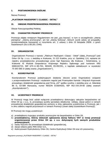 I. POSTANOWIENIA OGÓLNE Nazwa Promocji „PLATINUM MAXEXPERT I CLASSIC - DETAL” II. OBSZAR PRZEPROWADZENIA PROMOCJI Obszar Rzeczypospolitej Polskiej. III. CHARAKTER PRAWNY PROMOCJI Promocja objęta niniejszym Regulaminem nie jest „grą losową”, w tym w szczególności „loterią pieniężną”, „loterią promocyjną”, ani też „loterią fantową”, których wynik zależy od przypadku (przeprowadzenia losowania) w rozumieniu art. 2 ustawy z dnia 19 listopada 2009r. o grach hazardowych (Dz.U.09.201.1540). IV. ORGANIZATOR Organizatorem Promocji o nazwie: „Platinum MaxExpert i Classic - Detal" (dalej „Promocja”) jest Orlen Oil Sp. z o.o. z siedzibą w Krakowie, 31-323 Kraków, przy ul. Opolskiej 114, wpisana do rejestru przedsiębiorców prowadzonego przez Sąd Rejonowy dla Krakowa - Śródmieścia, w Krakowie XI Wydział Gospodarczy Krajowego Rejestru Sądowego pod numerem KRS 0000102722, NIP 675-11-90-702, REGON 351492391, o kapitale zakładowym w wysokości 75 093 000 zł (dalej zwana „Organizatorem”). V. KOORDYNATOR Koordynatorem Promocji podejmującym działania zlecone przez Organizatora związane z przeprowadzeniem Promocji i wydaniem nagród jest Przemysław Kamola i Wojciech Koprowski prowadzący działalność gospodarczą pod firmą „G3” spółka cywilna z siedzibą przy ul. Gilarskiej 86 D, 03-589 Warszawa, numer REGON 015604203, NIP 952-193-29-00 (dalej zwanym „Koordynatorem”). VI. UCZESTNICY PROMOCJI W Promocji mogą brać udział wyłącznie przedsiębiorcy dokonujący zakupów bezpośrednio od Orlen Oil sp. z o.o., tj. prowadzący punkty sprzedaży detalicznej (sklepy, stacje paliw) w ramach prowadzonej działalności gospodarczej zarówno w dniu zgłoszenia uczestnictwa w Promocji, jak i w dniu odbioru nagród przyznanych w ramach Promocji (zwani dalej Uczestnikami Promocji). W Promocji nie mogą uczestniczyć: a) przedsiębiorcy kupujący produkty promocyjne nie bezpośrednio w Orlen Oil, b) przedsiębiorcy, którzy dokonali zgłoszenia danej faktury VAT w innej promocji organizowanej przez Orlen Oil sp. z o.o. dotyczącej tych samych produktów promocyjnych, c) osoby fizyczne nie prowadzące działalności gospodarczej, d) stacje własne paliw PKN Orlen S.A., e) Autoryzowani Dystrybutorzy Orlen Oil, Centra Dystrybucji Orlen Oil oraz ich pracownicy, Regulamin promocji „PLATINUM MAXEXPERT I CLASSIC - DETAL” f) hurtownie olejowe i motoryzacyjne, w tym również te, które poza sprzedażą hurtową prowadzą jednocześnie sprzedaż detaliczną, w szczególności w zakresie środków smarnych oraz płynów eksploatacyjnych, g) przedsiębiorcy, którzy jako klienci mają przyznane specjalne warunki cenowe na produkty objęte niniejszą Promocją h) pracownicy Orlen Oil sp. z o.o. oraz członkowie ich rodzin. Za członków rodziny uważa się współmałżonków, rodzeństwo, małżonków rodzeństwa, zstępnych, wstępnych, kuzynów oraz osoby pozostające w stosunku przysposobienia. VII. PRODUKTY OBJĘTE PROMOCJĄ Promocja pod nazwą „Platinum MaxExpert i Classic - Detal” dotyczy olejów wymienionych w Tabeli nr 1, zwanych dalej Produktami Promocyjnymi. Tabela nr 1 PRODUKTY PROMOCYJNE QFS429B10 QFS429B40 QFS430B10 QFS430B40 QFS431B10 QFS431B40 QFS432B10 QFS432B40 QFS433B10 QFS433B40 QFS434B10 QFS434B40 QFS436B10 QFS436B40 QFS437B10 QFS437B40 QFS438B10 QFS438B40 QFS404B10 QFS404B60 QFS405B10 QFS405B60 QFS406B10 QFS406B60 QFS407B10 QFS407B60 QFS408B10 QFS408B60 QFS409B10 QFS409B60 PLATINUM MAXEXPERT A3/B4 10W-40 B1L PLATINUM MAXEXPERT A3/B4 10W-40 B4L PLATINUM MAXEXPERT C3 5W-40 B1L PLATINUM MAXEXPERT C3 5W-40 B4L PLATINUM MAXEXPERT C4 5W-30 B1L PLATINUM MAXEXPERT C4 5W-30 B4L PLATINUM MAXEXPERT F 5W-30 B1L PLATINUM MAXEXPERT F 5W-30 B4L PLATINUM MAXEXPERT FT 5W-30 B1L PLATINUM MAXEXPERT FT 5W-30 B4L PLATINUM MAXEXPERT V 5W-30 B1L PLATINUM MAXEXPERT V 5W-30 B4L PLATINUM MAXEXPERT XD 5W-30 B1L PLATINUM MAXEXPERT XD 5W-30 B4L PLATINUM MAXEXPERT XF 5W-30 B1L PLATINUM MAXEXPERT XF 5W-30 B4L PLATINUM MAXEXPERT XJ 5W-30 B1L PLATINUM MAXEXPERT XJ 5W-30 B4L PLATINUM CLASSIC DIESEL MIN 15W-40 B1L PLATINUM CLASSIC DIESEL MIN 15W-40 B4,5L PLATINUM CLASSIC DIESEL SEM 10W-40 B1L PLATINUM CLASSIC DIESEL SEM 10W-40 B4,5L PLATINUM CLASSIC DIESEL SYN. 5W-40 B1L PLATINUM CLASSIC DIESEL SYN. 5W-40 B4,5L PLATINUM CLASSIC GAS MINER.15W-40 B1L PLATINUM CLASSIC GAS MINER.15W-40 B4,5L PLATINUM CLASSIC GAS SEMISY 10W-40 B1L PLATINUM CLASSIC GAS SEMISY 10W-40 B4,5L PLATINUM CLASSIC GAS SYNTH. 5W-40 B1L PLATINUM CLASSIC GAS SYNTH. 5W-40 B4,5L Regulamin promocji „PLATINUM MAXEXPERT I CLASSIC - DETAL” QFS410B10 QFS410B60 QFS411B10 QFS411B60 QFS412B10 QFS412B60 QFS413B10 QFS413B60 PLATINUM CLASSIC LIFE+ 20W-50 B1L PLATINUM CLASSIC LIFE+ 20W-50 B4,5L PLATINUM CLASSIC MINERAL 15W-40 B1L PLATINUM CLASSIC MINERAL 15W-40 B4,5L PLATINUM CLASSIC SEMISYNTH. 10W-40 B1L PLATINUM CLASSIC SEMISYNTH. 10W-40 B4,5L PLATINUM CLASSIC SYNTHETIC 5W-40 B1L PLATINUM CLASSIC SYNTHETIC 5W-40 B4,5L VIII. CZAS TRWANIA AKCJI PROMOCYJNEJ Promocja trwa od dnia 01.03.2016r. do dnia 08.04.2016r. lub do wyczerpania puli nagród. IX. ZGŁOSZENIA DO PROMOCJI Zgłoszenia do promocji należy rejestrować niezwłocznie po dokonaniu zakupu na stronie www.orlenoilpromocje.pl, w terminie od dnia 01.03.2016r. do dnia 22.04.2016r. X. CAŁKOWITY CZAS TRWANIA PROMOCJI Całkowity czas trwania Promocji obejmuje: czas rejestracji Uczestników, przyznawanie nagród oraz przekazanie nagród tj. okres od dnia 01.03.2016 r. do dnia 20.05.2016r. XI. 1. 2. PRZEDMIOT PROMOCJI Przedmiotem Promocji jest zakup w czasie trwania akcji promocyjnej Produktów Promocyjnych w pakietach bezpośrednio w Orlen Oil Sp. z o.o. Pakiet promocyjny (jednorazowy zakup na jednym dokumencie zakupu) obejmuje ilość Produktów Promocyjnych określonych poniżej w Tabeli nr 2. Zakup Produktów Promocyjnych musi być udokumentowany fakturą VAT. Tabela nr 2 PAKIET PROMOCYJNY (jednorazowy zakup na fakturze) PRODUKT ILOŚĆ PLATINUM MAXEXPE