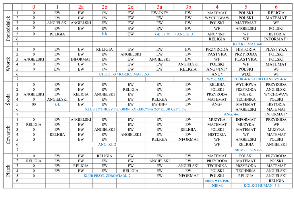 Piątek Czwartek Środa Wtorek Poniedziałek 0 1 2 3 4 5 6 7 1 2 3 4 5 6 7 1 2 3 4 5 6 7 1 2 3 4 5 6 7 1 2 3 4 5 6 0 0 0 0 0 1 2a EW EW EW EW ANGIELSKI ANGIELSKI EW EW RELIGIA 2b 2c 3a 3b 4 5 6 EW EW EW EW k-k EW EW EW EW EW EW-INF* EW EW EW EW EW EW EW MATEMAT WYCHOWAW POLSKI POLSKI MATEMAT RELIGIA MATEMAT WF POLSKI k-k 3a 3b / ANG kl. 3 POLSKI WF ANG*/INF+ RELIGIA ANGIELSKI WF WF HISTORIA INFORMAT+ KÓŁKO MAT 4-6 0 0 ANGIELSKI 0 0 EW EW EW EW EW EW INFORMAT EW EW EW 0 EW 0 EW ANGIELSKI EW 0 ANGIELSKI 00 k-k EW EW RELIGIA EW EW RELIGIA EW EW EW ANGIELSKI EW EW ANGIELSKI EW EW EW EW EW EW EW CHÓR 1-3 / KÓŁKO MAT. 2-3 EW EW ANGIELSKI EW EW EW RELIGIA EW EW EW EW EW EW RELIGIA EW-INF+ EW EW EW ANGIELSKI RELIGIA EW EW EW EW EW KLUB LOTNICZY 2-3/ GIMN. KOREKCYNA 2-3/ KLUB CZYT. 2-3 0 RELIGIA 0 0 EW EW EW RELIGIA 0 ANGIELSKI EW EW EW EW ANGIELSKI EW EW EW EW ANG. Kl. 2 EW EW EW ANGIELSKI EW EW EW EW RELIGIA EW EW RELIGIA EW INFORMAT PRZYRODA PASTYKA WF POLSKI ANG+/INF* ANG* HISTORIA PRZYRODA PLASTYKA WF POLSKI WDŻ WYR. MAT. RELIGIA POLSKI PRZYRODA MATEMAT ANG+ CHÓR 4- 6 /KLUB LOTNICZY 4- 6 WYCHOWA PRZYRODA POLSKI TECHNIKA MATEMAT ANGIELSKI ANG. 4-6 MUZYKA INFORMAT MATEMAT MUZYKA POLSKI MATEMAT HISTORIA WF ANGIELSKI WF WF RELIGIA /NIEM./ 0 RELIGIA 0 0 0 EW EW EW EW EW EW RELIGIA EW RELIGIA EW EW EW EW EW EW RELIGIA KLUB PRZYJ. ZDROWIA kl. 2 EW ANGIELSKI EW EW EW EW EW ANGIELSKI EW INFORMAT MATEMAT PRZYRODA TECHNIKA POLSKI POLSKI NIEM./ WYR. POL. NIEM. PLASTYKA POLSKI POLSKI MATEMAT WF WF PRZYRODA ANGIELSKI WYCHOWAW POLSKI HISTORIA MATEMAT INFORMAT* PRZYRODA WF MUZYKA MATEMAT POLSKI ANGIELSKI SKS 4-6 POLSKI MATEMAT PRZYRODA TECHNIKA RELIGIA PRZYRODA POLSKI MATEMAT ANGIELSKI ANGIELSKI RELIGIA KÓŁKO HUMAN. 5-6
