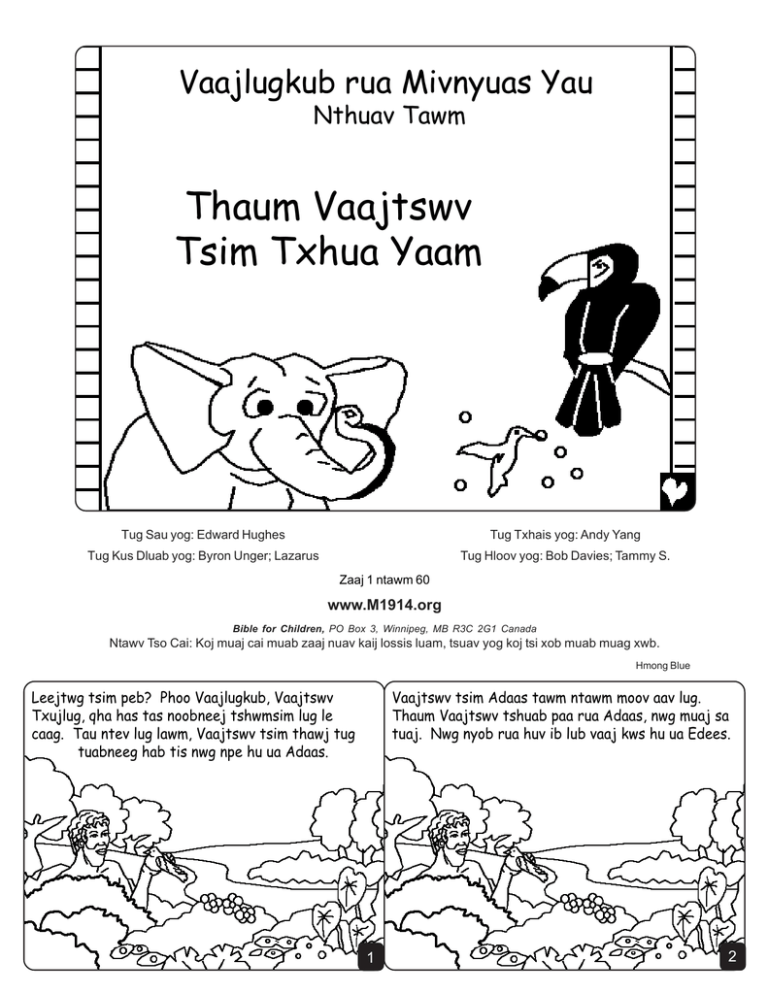 Vaajlugkub rua Mivnyuas Yau Nthuav Tawm Thaum Vaajtswv Tsim Txhua Yaam Tug Sau yog: Edward Hughes Tug Txhais yog: Andy Yang Tug Kus Dluab yog: Byron Unger; Lazarus Tug Hloov yog: Bob Davies; Tammy S. Zaaj 1 ntawm 60 www.M1914.org Bible for Children, PO Box 3, Winnipeg, MB R3C 2G1 Canada Ntawv Tso Cai: Koj muaj cai muab zaaj nuav kaij lossis luam, tsuav yog koj tsi xob muab muag xwb. Hmong Blue Leejtwg tsim peb? Phoo Vaajlugkub, Vaajtswv Txujlug, qha has tas noobneej tshwmsim lug le caag. Tau ntev lug lawm, Vaajtswv tsim thawj tug tuabneeg hab tis nwg npe hu ua Adaas. Vaajtswv tsim Adaas tawm ntawm moov aav lug. Thaum Vaajtswv tshuab paa rua Adaas, nwg muaj sa tuaj. Nwg nyob rua huv ib lub vaaj kws hu ua Edees. 1 2 Tseeb tag, Vaajtswv tsim txhua yaam kws muaj lug – txhua yaam. Uantej Vaajtswv tsim Adaas, Nwg tsim ib lub nplajteb zoo nkauj heev kws muaj tau yaam zoo heev. Vaajtswv tsim tej tojroob hab tajnraag, tej paajntoos tsw qaab hab tej ntoo sab sab, tej noog kws muaj tis ci hab tej muv kws yaa nrov ziv, tej ntseg luj kws luam dlej hab tej qwj kws nplag leev. 3 Puag thaum chivkeeb lug, uantej kws Vaajtswv tsim ib yaam dlaabtsi, tsi muaj dlaabtsi le tsuas yog Vaajtswv xwb. Tsi muaj tuabneeg lossis tej qhovchaw lossis ib yaam dlaabtsi le. Tsi muaj ib yaam dlaabtsi le. Tsi muaj qhov kaaj ntug hab tsi muaj qhov tsaus ntuj. Tsi muaj qhov moog sau hab qhov moog huv. Tsi muaj naagmo hab tsi muaj pigkig. Tsuas muaj Vaajtswv tuableeg xwb tug kws tsi muaj qhov pib. Ces Vaajtswv txawm pib ua dlejnum! 4 Thaum chivkeeb, Vaajtswv tsim lub ntuj hab lub nplajteb. 6 5 Ces Vaajtswv txawm has. “Cale muaj qhov pumkev.” Hab lub nplajteb tsi muaj dlaabtsi hab nyob dlo dlus. Hab tsaus ntuj nti thoob plawg sau nplaim dlej havtxwv. 7 8 Hab txawm pumkev tuaj. Vaajtswv tisnpe rua qhov pumkev hu ua Nruab Nub hab Nwg tis qhov tsaus ntuj hu ua Mo Ntuj. Hab muaj caij tsaus ntuj hab muaj cai kaaj ntug yog thawj nub. Rua nub ob, Vaajtswv cais tej dlej nyob huv havtxwv, tej havtxwv hab tej paagdlej nyag nyob muaj nyag chaw huvqaab Ntuj Ceebtsheej. Rua nub peb, Vaajtswv has tas, “Cale muaj aav qhuav tshwm tuaj.” Hab nwg cale muaj. 10 9 Vaajtswv saamfwm kuam tej nroj hab paajntoos hab nrojtsuag hab ntoo cale tshwm tuaj. Hab puab txawm tshwm tuaj. Hab muaj caij tsaus ntuj hab muaj cai kaaj ntug yog nub peb. Ces Vaajtswv txawm tsim lub nub, hab lub hli, hab ntau ntau lub nubqub kws tsi muaj leejtwg suav txheeb le. Hab muaj caij tsaus ntuj hab muaj cai kaaj ntug yog nub plaub. 12 11 Vaajtswv tsim txhua yaam ntseg puv nkaus tej dlej nyob huv nplajteb nuav hab txhua yaam noog nyob sau tej aav hab havtxwv hab nruabntug. Hab muaj caij tsaus ntuj hab muaj cai kaaj ntug yog nub tsib. Tej tsaj nruab dleg hab ntseg hab noog yog tej yaam kws Vaajtswv yuav tsim ntxiv. Rua nub tsib Nwg tsim tej ntseg luj luj kws muaj kaugnav ntse hab tej ntseg miv miv, tej qab ceg-ntev hab tej noog ntxuaj tis ceev kws zoo zoo sab heev. 13 14 Tej lab txhojpob hab tej kheb xyobtxhaj. Tej caab nplagleev hab tej ca ncaujpuv. Tej neeg cejdlaab ntev kws sab sab hab tej miv kws nyooj pws. Txhua yaam tsaj yog Vaajtswv tsim nub ntawd. Tom qaab ntawd, Vaajtswv rov has dlua. Vaajtswv has tas, “Ca lub nplajteb cale tshwm muaj txhua yaam tsajtxhu...” Txhua yaam tsaj hab kaabntsaum hab naab qaadlev txawm tshwm muaj tuaj. Nwg muaj tej ntxhw kws tsuj ua aav tseeg nkawg hab tej naagkus dlej kws najnub txav ntoo. 15 16 Vaajtswv tsim ibyaam ntxiv rua nub rau ntawd hab – ibyaam tshwjxeeb heev. Zag nuav muaj txhua yaam txhij rua Tuabneeg. Nwg muaj zaubmov nyob tom tajnraag hab muaj tsaj lug koom nwg. Hab Vaajtswv has tas, “Ca Peb tsim tuabneeg kuam muaj yaamntxwv zoo le Peb. Ca nwg muaj fwjchim kaav taagnrho txhua yaam huv nplajteb.” Hab muaj caij tsaus ntuj hab muaj cai kaaj ntug yog nub rau. 18 17 YOGLE VAAJTSWV TSIM TUABNEEG MUAJ YAAMNTXWV ZOO LE NWG; VAAJTSWV TSIM KUAM TUABNEEG MUAJ TUG YAAMNTXWV ZOO LE NWG ... 19 Vaajtswv has rua Adaas. “Noj txhua yaam kws koj ntshaw huv lub vaaj. Tabsis tsi xob noj tsob txiv kws ua rua paub qhov phem hab qhov zoo. Yog koj noj tsob txiv ntawd nub twg ces koj yuav tuag nub ntawd.” 20 Hab tug TSWV kws yog Vaajtswv has tas, “Nwg tsi zoo kws ca tug txivneej nyob ib leeg. Kuv yuav tsim ib tug paab lug rua nwg.” Vaajtswv coj txhua yaam noog hab tsajtxhu lug rua Adaas. Adaas tisnpe rua txhua yaam. Ntshai nwg yuav txawjntse heev mas txhaj le muaj peevxwm ua tau. Tabsis taagnrho tej noog hab tsajtxhu tsi muaj ib tug kws zoo ua khub nrug Adaas le. 21 Vaajtswv ua rua Adaas tsaug tsaugzug heev. Vaajtswv txaj muab tug txivneej kws tsaugzug ntawd ib tug txhaa taav rhu tawm, Vaajtswv muab Adaas tug txhaa taav lug tsim ib tug Quaspuj. Tug quaspuj kws Vaajtswv tsim mas phim nkaus rua Adaas ua khub. 22 Vaajtswv siv rau nub lug tsim txhua yaa. Ces Vaajtswv foom koobmoov rua nub xyaa hab muab ua nub su. Nyob rua huv lub vaaj Edees, Adaas hab Evas nwg tug quaspuj muaj kev kaajsab lug coj lawv le Vaajtswv has. Vaajtswv yog obtug tug TSWV, tug Pub Txhuayaam rua obtug hab yog obtug le Phoojywg. 24 23 Thaum Vaajtswv Tsim Txhua Yaam Ib zaaj huv Vaajtswv Txujlug, phoo Vaajlugkub, yog nyob rua huv Chivkeeb 1-2 “Lub chaw rua Koj cov Lug nkaag kws muaj teeb ci.” Ntawv Nkauj 119:130 Vaajtswv paub has tas peb ua ntau yaam phem, kws Nwg hu ua kev txhum. Txuj kev rau txim rua kev txhum yog kev tuag. Vaajtswv hlub peb kawg le kws Nwg xaa Nwg Leejtub, Yexus, lug tuag sau tug Ntoo Khaublig hab them peb lub txim. Yexus sawv rov lug muaj sa hab rov moog sau Ntuj Ceebtsheej! Nwgnuav Vaajtswv muaj peevxwm zaam tau peb tej kev txhum. Yog koj xaav tsiv tawm ntawm koj tej kev txhum, has le nuav rua Vaajtswv: Aub Vaajtswv, kuv ntseeg has tas Yexus tuag txhwv kuv hab nwgnuav tseem muaj sa nyob. Thov Koj lug nyob huv kuv lub neej hab zaam kuv tej kev txhum, sub kuv txhaj le muaj txujsa tshab, hab ib nub moog nrug Koj nyob moog ib txhis. Thov paab kuam kuv ua neej rua Koj le Koj tug mivnyuas. Nyeem phoo Vaajlugkub hab nrug Vaajtswv sibthaam txhua n