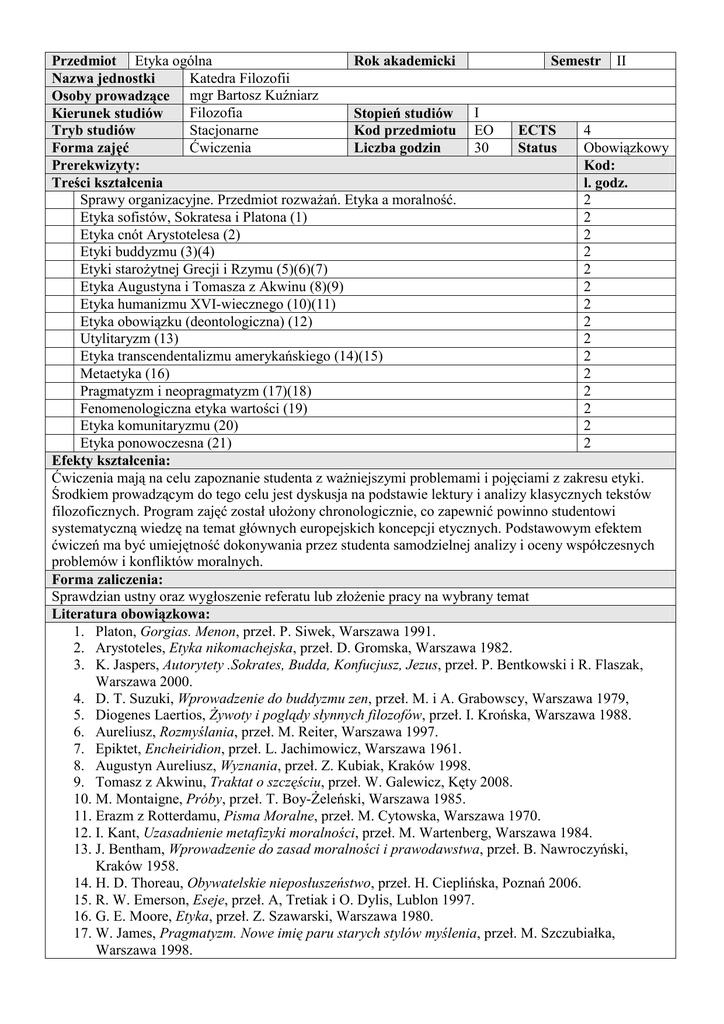 Przedmiot Etyka ogólna Rok akademicki Semestr II Katedra Filozofii Nazwa jednostki Osoby prowadzące mgr Bartosz Kuźniarz Filozofia Kierunek studiów Stopień studiów I Stacjonarne 4 Tryb studiów Kod przedmiotu EO ECTS Ćwiczenia 30 Obowiązkowy Forma zajęć Liczba godzin Status Prerekwizyty: Kod: Treści kształcenia l. godz. Sprawy organizacyjne. Przedmiot rozważań. Etyka a moralność. 2 Etyka sofistów, Sokratesa i Platona (1) 2 Etyka cnót Arystotelesa (2) 2 Etyki buddyzmu (3)(4) 2 Etyki starożytnej Grecji i Rzymu (5)(6)(7) 2 Etyka Augustyna i Tomasza z Akwinu (8)(9) 2 Etyka humanizmu XVI-wiecznego (10)(11) 2 Etyka obowiązku (deontologiczna) (12) 2 Utylitaryzm (13) 2 Etyka transcendentalizmu amerykańskiego (14)(15) 2 Metaetyka (16) 2 Pragmatyzm i neopragmatyzm (17)(18) 2 Fenomenologiczna etyka wartości (19) 2 Etyka komunitaryzmu (20) 2 Etyka ponowoczesna (21) 2 Efekty kształcenia: Ćwiczenia mają na celu zapoznanie studenta z ważniejszymi problemami i pojęciami z zakresu etyki. Środkiem prowadzącym do tego celu jest dyskusja na podstawie lektury i analizy klasycznych tekstów filozoficznych. Program zajęć został ułożony chronologicznie, co zapewnić powinno studentowi systematyczną wiedzę na temat głównych europejskich koncepcji etycznych. Podstawowym efektem ćwiczeń ma być umiejętność dokonywania przez studenta samodzielnej analizy i oceny współczesnych problemów i konfliktów moralnych. Forma zaliczenia: Sprawdzian ustny oraz wygłoszenie referatu lub złożenie pracy na wybrany temat Literatura obowiązkowa: 1. Platon, Gorgias. Menon, przeł. P. Siwek, Warszawa 1991. 2. Arystoteles, Etyka nikomachejska, przeł. D. Gromska, Warszawa 1982. 3. K. Jaspers, Autorytety .Sokrates, Budda, Konfucjusz, Jezus, przeł. P. Bentkowski i R. Flaszak, Warszawa 2000. 4. D. T. Suzuki, Wprowadzenie do buddyzmu zen, przeł. M. i A. Grabowscy, Warszawa 1979, 5. Diogenes Laertios, Żywoty i poglądy słynnych filozofów, przeł. I. Krońska, Warszawa 1988. 6. Aureliusz, Rozmyślania, przeł. M. Reiter, Warszawa 1997. 7. Epiktet, Encheiridion, przeł. L. Jachimowicz, Warszawa 1961. 8. Augustyn Aureliusz, Wyznania, przeł. Z. Kubiak, Kraków 1998. 9. Tomasz z Akwinu, Traktat o szczęściu, przeł. W. Galewicz, Kęty 2008. 10. M. Montaigne, Próby, przeł. T. Boy-Żeleński, Warszawa 1985. 11. Erazm z Rotterdamu, Pisma Moralne, przeł. M. Cytowska, Warszawa 1970. 12. I. Kant, Uzasadnienie metafizyki moralności, przeł. M. Wartenberg, Warszawa 1984. 13. J. Bentham, Wprowadzenie do zasad moralności i prawodawstwa, przeł. B. Nawroczyński, Kraków 1958. 14. H. D. Thoreau, Obywatelskie nieposłuszeństwo, przeł. H. Cieplińska, Poznań 2006. 15. R. W. Emerson, Eseje, przeł. A, Tretiak i O. Dylis, Lublon 1997. 16. G. E. Moore, Etyka, przeł. Z. Szawarski, Warszawa 1980. 17. W. James, Pragmatyzm. Nowe imię paru starych stylów myślenia, przeł. M. Szczubiałka, Warszawa 1998. 18. R. Rorty, Konsekwencje pragmatyzmu. Eseje z lat 1972-1980, przeł. C. Karkowski, Warszawa 1998. 19. M. Scheler, Resentyment a moralność, przeł. J. Garewicz, Warszawa 1997. 20. A. MacIntyre, Dziedzictwo cnoty. Studium z teorii moralności, przeł. A. Chmielewski, Warszawa 1996. 21. E. Lévinas, Całość i nieskończoność. Esej o zewnętrzności, przeł. M. Kowalska, Warszawa 1998. Literatura uzupełniająca: Podpis osób prowadzących: Podpis kierownika jednostki: