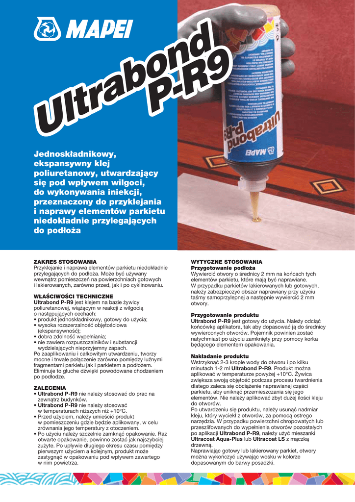 d n o 9 b R a r P t l U Jednoskładnikowy, ekspansywny klej poliuretanowy, utwardzający się pod wpływem wilgoci, do wykonywania iniekcji, przeznaczony do przyklejania i naprawy elementów parkietu niedokładnie przylegających do podłoża ZAKRES STOSOWANIA Przyklejanie i naprawa elementów parkietu niedokładnie przylegających do podłoża. Może być używany wewnątrz pomieszczeń na powierzchniach gotowych i lakierowanych, zarówno przed, jak i po cyklinowaniu. WŁAŚCIWOŚCI TECHNICZNE Ultrabond P-R9 jest klejem na bazie żywicy poliuretanowej, wiążącym w reakcji z wilgocią o następujących cechach: • produkt jednoskładnikowy, gotowy do użycia; • wysoka rozszerzalność objętościowa (ekspansywność); • dobra zdolność wypełniania; • nie zawiera rozpuszczalników i substancji wydzielających nieprzyjemny zapach. Po zaaplikowaniu i całkowitym utwardzeniu, tworzy mocne i trwałe połączenie zarówno pomiędzy luźnymi fragmentami parkietu jak i parkietem a podłożem. Eliminuje to głuche dźwięki powodowane chodzeniem po podłodze. ZALECENIA • Ultrabond P-R9 nie należy stosować do prac na zewnątrz budynków. • Ultrabond P-R9 nie należy stosować w temperaturach niższych niż +10°C. • Przed użyciem, należy umieścić produkt w pomieszczeniu gdzie będzie aplikowany, w celu zrównania jego temperatury z otoczeniem. • Po użyciu należy szczelnie zamknąć opakowanie. Raz otwarte opakowanie, powinno zostać jak najszybciej zużyte. Po upływie długiego okresu czasu pomiędzy pierwszym użyciem a kolejnym, produkt może zastygnąć w opakowaniu pod wpływem zawartego w nim powietrza. WYTYCZNE STOSOWANIA Przygotowanie podłoża Wywiercić otwory o średnicy 2 mm na końcach tych elementów parkietu, które mają być naprawiane. W przypadku parkietów lakierowanych lub gotowych, należy zabezpieczyć obszar naprawiany przy użyciu taśmy samoprzylepnej a następnie wywiercić 2 mm otwory. Przygotowanie produktu Ultrabond P-R9 jest gotowy do użycia. Należy odciąć końcówkę aplikatora, tak aby dopasować ją do średnicy wywierconych otworów. Pojemnik powinien zostać natychmiast po użyciu zamknięty przy pomocy korka będącego elementem opakowania. Nakładanie produktu Wstrzyknąć 2-3 krople wody do otworu i po kilku minutach 1-2 ml Ultrabond P-R9. Produkt można aplikować w temperaturze powyżej +10°C. Żywica zwiększa swoją objętość podczas procesu twardnienia dlatego zaleca się obciążenie naprawianej części parkietu, aby uniknąć przemieszczania się jego elementów. Nie należy aplikować zbyt dużej ilości kleju do otworów. Po utwardzeniu się produktu, należy usunąć nadmiar kleju, który wyciekł z otworów, za pomocą ostrego narzędzia. W przypadku powierzchni chropowatych lub przeszlifowanych do wypełnienia otworów pozostałych po aplikacji Ultrabond P-R9, należy użyć mieszanki Ultracoat Aqua-Plus lub Ultracoat LS z mączką drzewną. Naprawiając gotowy lub lakierowany parkiet, otwory można wykończyć używając wosku w kolorze dopasowanym do barwy posadzki. 4608_ultrabond p-r9_pl (24.11.2011 - 3ª Bozza/Ciano/PDF) DANE TECHNICZNE (wartości typowe) (PL) A.G. BETA WŁAŚCIWOŚCI PRODUKTU Konsystencja: ciecz Kolor: brązowy Gęstość objętościowa (g/cm³): 1,1 Zawartość ciał stałych (%): 100 Lepkość Brookfield’a (mPa·s): 4.500 (wirnik 3-20 obr./min) Przechowywanie: 12 miesięcy w oryginalnie zamkniętych opakowaniach, w suchym miejscu Szkodliwość wg Dyrektywy 1999/45/WE: szkodliwy. Przed użyciem zapoznać się z punktem “Środki ostrożności i bezpieczeństwa” oraz opisem na opakowaniu i z kartą charakterystyki Temperatura stosowania: od +10°C do +30°C Obciążenie ruchem pieszym: po 24 godzinach Szlifowanie: po 24 godzinach CZYSZCZENIE Gdy produkt Ultrabond P-R9 jest jeszcze świeży może być usunięty z podłóg gotowych i lakierowanych przy pomocy preparatu Cleaner L. Narzędzia można wyczyścić przy pomocy Thinner PU. Po utwardzeniu Ultrabond P-R9 może zostać usunięty jedynie mechanicznie, tak aby nie zniszczyć parkietu. miejscach o dobrej wentylacji. Podczas aplikacji w temperaturach powyżej +60°C produkt może działać szkodliwie oraz może powodować uczulenie w następstwie narażenia dróg oddechowych. W przypadku zagrożenia należy zasięgnąć porady lekarza. Więcej informacji na temat bezpiecznego stosowania produktu jest dostępnych w aktualnej wersji Karty Charakterystyki. ZUŻYCIE 1-2 ml wstrzyknięte do każdego z otworów. PRODUKT DLA PROFESJONALISTÓW. OPAKOWANIA Pojemniki 0,5 kg. PRZECHOWYWANIE Ultrabond P-R9 może być przechowywany przez 12 miesięcy w oryginalnie zamkniętych opakowaniach i w suchym miejscu. ŚRODKI OSTROŻNOŚCI I BEZPIECZEŃSTWA Ultrabond P-R9 jest drażniący dla oczu, skóry i układu oddechowego. Częsty kontakt ze skórą może powodować reakcje alergiczne u osób wrażliwych na izocyjaniany. Podczas stosowania produktu zaleca się unikania kontaktu ze skórą i oczami, oraz noszenie okularów i rękawic ochronnych oraz przestrzegania typowych środków ostrożności podejmowanych przy pracy z produktami chemicznymi. Stosować w Przetwarzanie, powielanie, kopiowanie zamieszczonych w tej ulotce materiałów jest zabronione.La ri PARAMETRY UŻYTKOWE UWAGI Powyższe dane należy traktować wyłącznie jako ogólne wskazówki. Niezależne od nas warunki pracy i różnorodność materiałów wykluczają jakiekolwiek roszczenia wynikające z tych danych. W przypadku wątpliwości zalecane jest przeprowadzenie badań własnych. MAPEI udziela gwarancji jedynie co do niezmiennej jakości swoich produktów. Proszę zawsze odwoływać się do aktualnej wersji karty technicznej dostępnej na stronie internetowej www.mapei.com Referencje dotyczące produktu są dostępne na życzenie oraz na stronach: www.mapei.pl oraz www.mapei.com ® BUDUJĄC PRZYSZŁOŚĆ 4608-11-2011 nd9 o b -R a r P t Ul