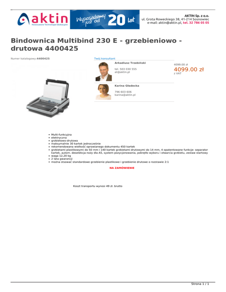Bindownica Multibind 230 E - grzebieniowo drutowa 4400425 Numer katalogowy:4400425 Twój konsultant Arkadiusz Trzebiński tel. 503 030 555 [email protected] NOWOŚĆ W OFERCIE 4099.00 zł 4099.00 zł z VAT Karina Gładecka 796 603 606 [email protected] Multi-funkcyjna elektryczna grzbietowo-drutowa maksymalnie 30 kartek jednocześnie rekomendowana wielkość oprawianego dokumentu 450 kartek grzbietami plastikowymi do 50 mm i 140 kartek grzbietami drutowymi do 14 mm, 4 opatentowane funkcje: separator kartek, autom. deselekcja noży dla A5, system pozycjonowania, pokrętło wyboru i otwarcia grzbietu, zestaw startowy waga 12,20 kg 2 lata gwarancji można stsować standardowe grzebienie plastikowe i grzebienie drutowe o rozstawie 2:1 NA ZAMÓWIENIE Koszt transportu wynosi 49 zł. brutto Strona 1 / 1 Powered by TCPDF (www.tcpdf.org)