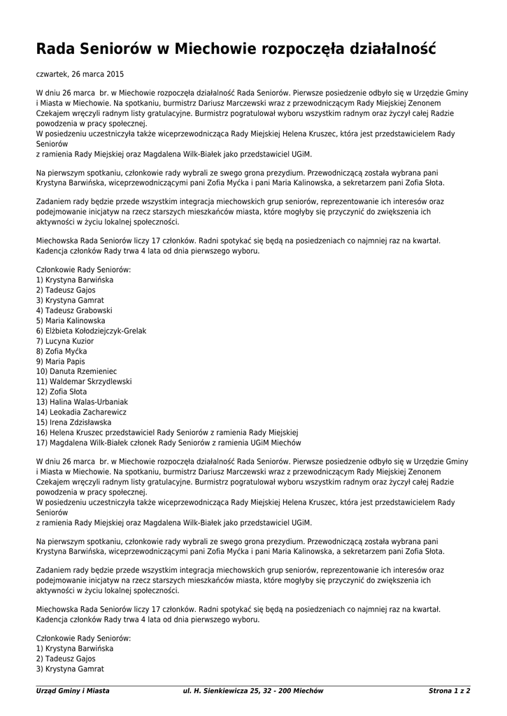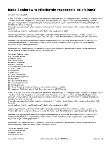 Rada Seniorów w Miechowie rozpoczęła działalność czwartek, 26 marca 2015 W dniu 26 marca br. w Miechowie rozpoczęła działalność Rada Seniorów. Pierwsze posiedzenie odbyło się w Urzędzie Gminy i Miasta w Miechowie. Na spotkaniu, burmistrz Dariusz Marczewski wraz z przewodniczącym Rady Miejskiej Zenonem Czekajem wręczyli radnym listy gratulacyjne. Burmistrz pogratulował wyboru wszystkim radnym oraz życzył całej Radzie powodzenia w pracy społecznej. W posiedzeniu uczestniczyła także wiceprzewodnicząca Rady Miejskiej Helena Kruszec, która jest przedstawicielem Rady Seniorów z ramienia Rady Miejskiej oraz Magdalena Wilk-Białek jako przedstawiciel UGiM. Na pierwszym spotkaniu, członkowie rady wybrali ze swego grona prezydium. Przewodniczącą została wybrana pani Krystyna Barwińska, wiceprzewodniczącymi pani Zofia Myćka i pani Maria Kalinowska, a sekretarzem pani Zofia Słota. Zadaniem rady będzie przede wszystkim integracja miechowskich grup seniorów, reprezentowanie ich interesów oraz podejmowanie inicjatyw na rzecz starszych mieszkańców miasta, które mogłyby się przyczynić do zwiększenia ich aktywności w życiu lokalnej społeczności. Miechowska Rada Seniorów liczy 17 członków. Radni spotykać się będą na posiedzeniach co najmniej raz na kwartał. Kadencja członków Rady trwa 4 lata od dnia pierwszego wyboru. Członkowie Rady Seniorów: 1) Krystyna Barwińska 2) Tadeusz Gajos 3) Krystyna Gamrat 4) Tadeusz Grabowski 5) Maria Kalinowska 6) Elżbieta Kołodziejczyk-Grelak 7) Lucyna Kuzior 8) Zofia Myćka 9) Maria Papis 10) Danuta Rzemieniec 11) Waldemar Skrzydlewski 12) Zofia Słota 13) Halina Walas-Urbaniak 14) Leokadia Zacharewicz 15) Irena Zdzisławska 16) Helena Kruszec przedstawiciel Rady Seniorów z ramienia Rady Miejskiej 17) Magdalena Wilk-Białek członek Rady Seniorów z ramienia UGiM Miechów W dniu 26 marca br. w Miechowie rozpoczęła działalność Rada Seniorów. Pierwsze posiedzenie odbyło się w Urzędzie Gminy i Miasta w Miechowie. Na spotkaniu, burmistrz Dariusz Marczewski wraz z przewodniczącym Rady Miejskiej Zenonem Czekajem wręczyli radnym listy gratulacyjne. Burmistrz pogratulował wyboru wszystkim radnym oraz życzył całej Radzie powodzenia w pracy społecznej. W posiedzeniu uczestniczyła także wiceprzewodnicząca Rady Miejskiej Helena Kruszec, która jest przedstawicielem Rady Seniorów z ramienia Rady Miejskiej oraz Magdalena Wilk-Białek jako przedstawiciel UGiM. Na pierwszym spotkaniu, członkowie rady wybrali ze swego grona prezydium. Przewodniczącą została wybrana pani Krystyna Barwińska, wiceprzewodniczącymi pani Zofia Myćka i pani Maria Kalinowska, a sekretarzem pani Zofia Słota. Zadaniem rady będzie przede wszystkim integracja miechowskich grup seniorów, reprezentowanie ich interesów oraz podejmowanie inicjatyw na rzecz starszych mieszkańców miasta, które mogłyby się przyczynić do zwiększenia ich aktywności w życiu lokalnej społeczności. Miechowska Rada Seniorów liczy 17 członków. Radni spotykać się będą na posiedzeniach co najmniej raz na kwartał. Kadencja członków Rady trwa 4 lata od dnia pierwszego wyboru. Członkowie Rady Seniorów: 1) Krystyna Barwińska 2) Tadeusz Gajos 3) Krystyna Gamrat Urząd Gminy i Miasta ul. H. Sienkiewicza 25, 32 - 200 Miechów Strona 1 z 2 4) Tadeusz Grabowski 5) Maria Kalinowska 6) Elżbieta Kołodziejczyk-Grelak 7) Lucyna Kuzior 8) Zofia Myćka 9) Maria Papis 10) Danuta Rzemieniec 11) Waldemar Skrzydlewski 12) Zofia Słota 13) Halina Walas-Urbaniak 14) Leokadia Zacharewicz 15) Irena Zdzisławska 16) Helena Kruszec przedstawiciel Rady Seniorów z ramienia Rady Miejskiej 17) Magdalena Wilk-Białek członek Rady Seniorów z ramienia UGiM Miechów Tekst pochodzi ze strony: http://www.miechow.eu/miasto-i-gmina/aktualnosci/rada-seniorow-w-miechowie-rozpoczela-dzialalnosc/ Urząd Gminy i Miasta ul. H. Sienkiewicza 25, 32 - 200 Miechów Strona 2 z 2
