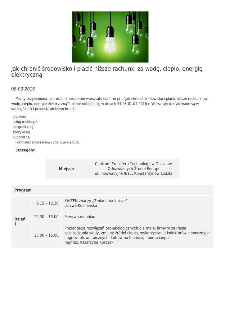 Jak chronić środowisko i płacić niższe rachunki za wodę, ciepło, energię elektryczną 08-03-2016 Mamy przyjemność zaprosić na bezpłatne warsztaty dla firm pt.: "Jak chronić środowisko i płacić niższe rachunki za wodę, ciepło, energię elektryczną?", które odbędą się w dniach 31.03-01.04.2016 r. Warsztaty dedykowane są w szczególności przedstawicielom branż: drzewnej usług osobistych poligraficznej spożywczej budowlanej Formularz zgłoszeniowy znajduje się tutaj. Szczegóły: Miejsce Centrum Transferu Technologii w Obszarze Odnawialnych Źródeł Energii ul. Innowacyjna 9/11, Konstantynów Łódzki Program 9.15 – 12.30 Dzień 1 KAIZEN znaczy „Zmiana na lepsze” dr Ewa Kochańska 12.30 – 13.00 Przerwa na obiad 13.00 – 16.00 Prezentacja rozwiązań pro-ekologicznych dla małej firmy w zakresie oszczędzania wody, zmiany źródeł ciepła, wykorzystania kolektorów słonecznych i ogniw fotowoltaicznych, kotłów na biomasę i pomp ciepła mgr inż. Katarzyna Korczak 9.15 – 11.00 Dzień 2 Analiza techniczna indywidualnych potrzeb przedsiębiorstw pod kątem wdrożenia rozwiązań pro-ekologicznych mgr inż. Katarzyna Korczak 11.00 – 12.30 Analiza ekonomiczna: określenie niezbędnych nakładów, a następnie korzyści finansowych, wynikających z wdrożenia mgr Iwona Adamkiewicz 12.30 – 13.00 Przerwa na obiad 13.00 – 14.00 14.00 – 15.00 Prezentacja dostępnych źródeł finansowania, umożliwiających wdrożenie rozwiązań pro-ekologicznych mgr Iwona Adamkiewicz Podsumowanie warsztatów, pytania, dyskusja, wnioski mgr Monika Stojan Strona CBI Pro-Akademia używa ciasteczek (cookies), dzięki którym nasz serwis może działać lepiej. Zobacz