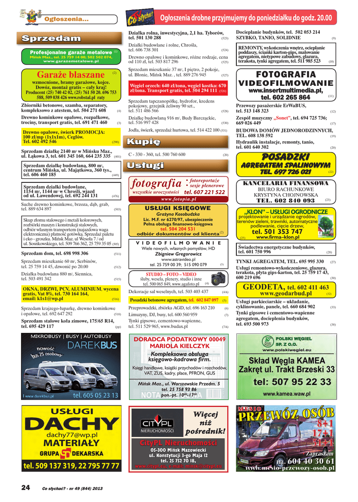 Ogłoszenia drobne przyjmujemy do poniedziałku do godz. 20.00 Ogłoszenia... Działka rolna, inwestycyjna, 2,1 ha. Tyborów, (523) tel. 501 130 288 Sprzedam Profesjonalne garaże metalowe (1) Mińsk Maz., tel. 25 759 14 00; 502 502 074, www.garazemetalowe.pl Zbiorniki betonowe, szamba, separatory, kompleksowo z atestem, tel. 504 271 608 Drewno kominkowe opałowe, rozpałkowe, trociny, transport gratis, tel. 691 471 460 Węgiel orzech: 640 zł/tona, węgiel kostka: 670 zł/tona. Transport gratis, tel. 504 294 111 (526) (4) Sprzedam tapczanopółkę, hydrofor, kredens pokojowy, grzejnik żeliwny 90 szt., tel. 511 486 566 (3) Działkę budowlaną 916 m2, Budy Barcząckie, tel. 516 997 428 (290) (401) Sprzedam działkę budowlaną, 800 m2, centrum Mińska, ul. Majątkowa, 360 tys., tel. 606 460 185 (449) (476) (503) Skup złomu stalowego i metali kolorowych, rozbiórki maszyn i konstrukcji stalowych, odbiór własnym transportem (najazdowa waga elektroniczna) płatność gotówką. Sprzedaż paletu i eko - groszku. Mińsk Maz. ul Wesoła 7 / od ul. Sosnkowskiego, tel. 509 766 362, 25 759 35 05(505) Sprzedam dom, tel. 698 998 306 (511) Sprzedam mieszkanie 60 m2, Serbinów, tel. 25 759 14 45, dzwonić po 20.00 (512) Działka budowlana 880 m2, Siennica, tel. 503 491 342 (515) OKNA, DRZWI, PCV, ALUMINIUM, wycena gratis, Vat 8%, tel. 730 164 164, (516) email: [email protected] Sprzedam krajzego-łuparkę, drewno kominkowe i opałowe, tel. 692 647 292 (518) Sprzedam stalowe koła zimowe, 175/65 R14, tel. 695 429 117 (pp) (530) (17) tel. 509 137 319, 22 795 77 77 24 Co słychać? - nr 49 (844) 2013 Budowa domów jednorodzinnych, (19) tel. 608 138 592 Hydraulik instalacje, remonty, tanio, (20) tel. 601 640 302 Posadzki (20) Usługi agregatem spalinowym tel. 697 726 021 • fotoreportaże • sesje plenerowe biuro rachunkowe Krystyna Chojnowska tel. 607 221 522 www.fotopia.pl tel. 602 840 093 Usługi księgowe projektowanie i urządzanie ogrodów, terenów zieleni, trawniki, automatyczne podlewanie, cięcie drzew, tel. 504 204 531 tel. 501 353 747 odbiór dokumentów od klienta (2) (25) V I D E O F I L M O W A N I E Posadzki betonowe agregatem, tel. 602 847 097 (5) Wiele nowych, własnych pomysłów, HD Zbigniew Gregorowicz www.astravideo.pl (3) tel. 25 759 00 39; 515 090 079 (4) Dekoracje sal weselnych, tel. 503 403 437 Posadzki betonowe agregatem, tel. 602 847 097 Przeprowadzki, zbiórka AGD, tel. 696 163 210 Limuzyny, DJ, busy, tel. 600 560 959 Tynki gipsowe, cementowo-wapienne, tel. 511 529 965, www.budax.pl (4A) (5) (6) (7) (7A) Więcej niż pośrednik! CityPL Nieruchomości 05-300 Mińsk Mazowiecki ul. Konstytucji 3-go Maja 12 tel. 25 752 70 18, www.citypl.eu, e-mail: [email protected] (23) „KLON” – USŁUGI OGRODNICZE Grażyna Kosobudzka Lic. M.F. nr 6270/97, ubezpieczenie Pełna obsługa finansowo-księgowa STUDIO – FOTO – VIDEO śluby, wesela, plenery, studio i inne tel. 500 065 849, www.agafoto.pl (22) Kancelaria finansowa Mińsk Maz., ul. Warszawskie Przedm. 5 tel. 25 758 93 86 pon.-pt. 1000-1700 MATERIAŁY (11) (12) Księgi handlowe, książki przychodów i rozchodów, VAT, ZUS, kadry, płace, PFRON, GUS [email protected] www.insertmultimedia.pl, tel. 602 265 864 Zespół muzyczny „Sonet”, tel. 694 725 736; 669 026 449 DORADCA PODATKOWY 00049 MARIOLA KIELCZYK Kompleksowa obsługa księgowo-kadrowa firm. USŁUGI fotografia VIDEOFILMOWANIE Przewozy pasażerskie ErWaBUS, tel. 513 148 323 C - 330 - 360, tel. 500 760 600 wszystkie uroczystości (10) (528) Kupię fotografia (9) Remonty, wykończenia wnętrz, ocieplanie poddaszy, ścianki karton-gips, malowanie agregatem, nietypowe zabudowy, glazura, terakota, tynki agregatem, tel. 511 985 523 (527) Jodła, świerk, sprzedaż hurtowa, tel. 514 422 100 (531) Sprzedam działkę 2140 m2 w Mińsku Maz., ul. Łąkowa 3, tel. 601 345 160, 664 235 335 Suche drewno kominkowe, brzoza, dąb, grab, tel. 889 634 897 Drewno opałowe i kominkowe, różne rodzaje, cena (525) od 110 zł, tel. 503 817 296 Sprzedam mieszkanie 37 m , I piętro, 2 pokoje, ul. Błonie, Mińsk Maz. , tel. 889 276 945 (2) wzmocnione, bramy garażowe, kojce. Dowóz, montaż gratis – cały kraj! Producent (25) 740 42 02, (25) 761 50 20. 696 753 588, 509 038 426 www.robstal.pl raty Sprzedam działki budowlane, 1154 m2, 1144 m2 w Chrośli, wjazd od ul. Lawendowej, tel. 692 244 131 (524) 2 Garaże blaszane Drewno opałowe, świerk PROMOCJA: 100 zł/mp (1x1x1m), Cegłów. Tel. 602 492 546 Działki budowlane i rolne, Chrośla, tel. 606 738 301 Docieplanie budynków, tel. 502 053 214 SZYBKO, TANIO, SOLIDNIE www.firma–klon.pl Świadectwa energetyczne budynków, tel. 601 750 996 (28) TYNKI AGREGATEM, TEL. 695 995 330 Usługi remontowo-wykończeniowe, glazura, terakota, płyta gips-karton, tel. 25 759 17 43, 600 219 696 (27) (30) Geodeta, tel. 602 411 463 www.geodarbud.pl Usługi parkieciarskie – układanie, cyklinowanie, panele, tel. 660 684 902 Tynki gipsowe i cementowo-wapienne agregatem, docieplenia budynków, tel. 693 500 973 (32) (33) (38)