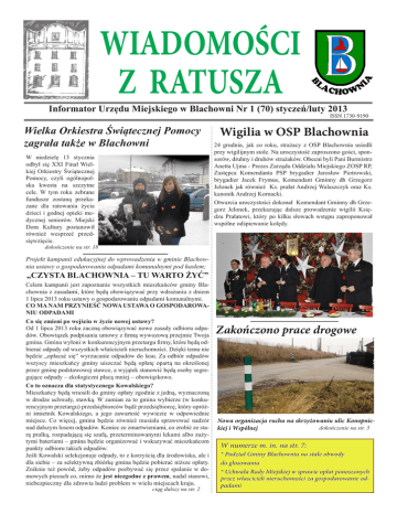 WIADOMOŚCI Z RATUSZA Informator Urzędu Miejskiego w Blachowni Nr 1 (70) styczeń/luty 2013 ISSN 1730-9190 Wielka Orkiestra Świątecznej Pomocy zagrała także w Blachowni W niedzielę 13 stycznia odbył się XXI Finał Wielkiej Orkiestry Świątecznej Pomocy, czyli ogólnopolska kwesta na szczytne cele. W tym roku zebrane fundusze zostaną przekazane dla ratowania życia dzieci i godnej opieki medycznej seniorów. Miejski Dom Kultury postanowił również wesprzeć przedsięwzięcie. Wigilia w OSP Blachownia 24 grudnia, jak co roku, strażacy z OSP Blachownia usiedli przy wigilijnym stole. Na uroczystość zaproszono gości, sponsorów, druhny i druhów strażaków. Obecni byli Pani Burmistrz Anetta Ujma - Prezes Zarządu Oddziału Miejskiego ZOSP RP, Zastępca Komendanta PSP brygadier Jarosław Piotrowski, brygadier Jacek Frymus, Komendant Gminny dh Grzegorz Jelonek jak również Ks. prałat Andrzej Walaszczyk oraz Ks. kanonik Andrzej Kornacki. Otwarcia uroczystości dokonał Komendant Gminny dh Grzegorz Jelonek, przekazując dalsze prowadzenie wigilii Księdzu Prałatowi, który po kilku słowach wstępu zaproponował wspólne odśpiewanie kolędy. dokończenie na str. 18 Projekt kampanii edukacyjnej do wprowadzenia w gminie Blachownia ustawy o gospodarowaniu odpadami komunalnymi pod hasłem; „CZYSTA BLACHOWNIA – TU WARTO ŻYĆ” Celem kampanii jest zapoznanie wszystkich mieszkańców gminy Blachownia z zasadami, które będą obowiązywać przy wdrażaniu z dniem 1 lipca 2013 roku ustawy o gospodarowaniu odpadami komunalnymi. CO MA NAM PRZYNIEŚĆ NOWA USTAWA O GOSPODAROWANIU ODPADAMI Co się zmieni po wejściu w życie nowej ustawy? Od 1 lipca 2013 roku zaczną obowiązywać nowe zasady odbioru odpadów. Obowiązek podpisania umowy z firmą wywozową przejmie Twoja gmina. Gmina wyłoni w konkurencyjnym przetargu firmy, które będą odbierać odpady od wszystkich właścicieli nieruchomości. Dzięki temu nie będzie „opłacać się” wyrzucanie odpadów do lasu. Za odbiór odpadów wszyscy mieszkańcy gminy uiszczać będą opłatę opartą na określonej przez gminę podstawowej stawce, a wyjątek stanowić będą osoby segregujące odpady – ekologiczni płacą mniej – obowiązkowo. Co to oznacza dla statystycznego Kowalskiego? Mieszkańcy będą wnosili do gminy opłaty zgodnie z jedną, wyznaczoną w drodze uchwały, stawką. W zamian za to gmina wybierze (w konkurencyjnym przetargu) przedsiębiorców bądź przedsiębiorcę, który opróżni śmietnik Kowalskiego, a jego zawartość wywiezie w odpowiednie miejsce. Co więcej, gmina będzie również musiała sprawować nadzór nad dalszym losem odpadów. Koniec ze zmartwieniami, co zrobić ze starą pralką, rozpadającą się szafą, przeterminowanymi lekami albo zużytymi bateriami – gmina będzie organizować i wskazywać mieszkańcom punkty odbioru takich odpadów. Jeśli Kowalski selekcjonuje odpady, to z korzyścią dla środowiska, ale i dla siebie – za selektywną zbiórkę gmina będzie pobierać niższe opłaty. Zniknie też powód, żeby odpadów pozbywać się przez spalanie w domowych piecach co, mimo że jest niezgodne z prawem, nadal stanowi, niebezpieczny dla zdrowia ludzi problem w wielu miejscach kraju. ciąg dalszy na str. 2 Zakończono prace drogowe Nowa organizacja ruchu na skrzyżowaniu ulic Konopnicdokończenie na str. 3 kiej i Wspólnej W numerze m. in. na str. 7: * Podział Gminy Blachownia na stałe obwody do głosowania * Uchwała Rady Miejskiej w sprawie opłat ponoszonych przez włascicieli nieruchomości za gospodarowanie odpadami Projekt kampanii edukacyjnej do wprowadzenia w gminie Blachownia ustawy o gospodarowaniu odpadami komunalnymi pod hasłem „CZYSTA BLACHOWNIA – TU WARTO ŻYĆ” dokończenie ze str. 1 Przepisy i harmonogram wdrażania 1 stycznia 2012 r. weszła w życie ustawa z dnia 1 lipca 2011 r. o zmianie ustawy o utrzymaniu czystości i porządku w gminach oraz niektórych innych ustaw (Dz. U. z 2012 r., poz. 391). Gminy dostały 18 miesięcy na przygotowanie nowego systemu gospodarki odpadami. Rok 2012 był rokiem przygotowania się gmin do realizacji nowych zadań, podjęcia stosownych uchwał. Natomiast rok 2013 to rok faktycznego wdrożenia przepisów. Od 1 lipca 2013 roku zaczną obowiązywać nowe zasady odbioru odpadów. Obowiązek podpisania umowy z firmą wywozową przejmie gmina. Cel zmiany ustawy: 1. Objęcie wszystkich właścicieli nieruchomości sprawnym systemem odbioru odpadów, 2. Stworzenie lepszych warunków do segregacji odpadów, 3. Łatwo dostępne punkty zbiórki selektywnej takich odpadów, jak; zużyte opony, zużyty sprzęt elektryczny i elektroniczny, meble, odpady niebezpieczne, 4. Informowanie mieszkańców gmin, co gdzie i jak należy wyrzucać, 5. Wyeliminowanie dzikich wysypisk, 6. Zagospodarowanie odpadów biodegradowalnych (organicznych) w przydomowych kompostownikach, 7. Likwidacja zjawiska palenia odpadów w domach. Jak będą wyliczane stawki opłat? Rada Miejska w Blachowni, w formie uchwały zadecydowała o miesięcznym terminie wnoszenia opłaty za odbiór i zagospodarowanie odpadów. Uchwaliła również stawkę za wywóz odpadów w wysokości 14 zł od osoby. Dla osób segregujących odpady stawka ta jest obniżona do 7,00 zł od osoby. Rada Miejska w Blachowni uchwaliła również: 1. Regulamin utrzymania czystości porządku na terenie gminy, 2. Sposób i zakres świadczenia usług odbierania odpadów komunalnych od właścicieli nieruchomości i zagospodarowania tych odpadów, w zamian za uiszczoną przez właściciela nieruchomości opłatę za gospodarowanie odpadami komunalnymi, 3. Wzór deklaracji o wysokości opłaty dla mieszkańców. Właściciele nieruchomości będą mieli obowiązek uiszczania na rzecz gminy opłaty za odbiór oraz zagospodarowanie odpadów komunalnych, na podstawie złożonej przez siebie deklaracji. Za pieniądze z opłat gmina będzie opłacać przyjmowanie, wywóz i segregację odpadów,