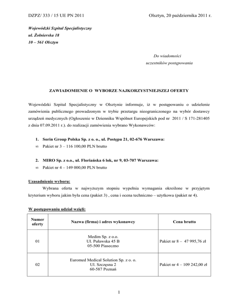 DZPZ/ 333 / 15 UE PN 2011 Olsztyn, 20 października 2011 r. Wojewódzki Szpital Specjalistyczny ul. śołnierska 18 10 – 561 Olsztyn Do wiadomości uczestników postępowania ZAWIADOMIENIE O WYBORZE NAJKORZYSTNIEJSZEJ OFERTY Wojewódzki Szpital Specjalistyczny w Olsztynie informuje, iŜ w postępowaniu o udzielenie zamówienia publicznego prowadzonym w trybie przetargu nieograniczonego na wybór dostawcy urządzeń medycznych (Ogłoszenie w Dzienniku Wspólnot Europejskich pod nr 2011 / S 171-281405 z dnia 07.09.2011 r.). do realizacji zamówienia wybrano Wykonawców: 1. Sorin Group Polska Sp. z o. o., ul. Postępu 21, 02-676 Warszawa: • Pakiet nr 3 – 116 100,00 PLN brutto 2. MIRO Sp. z o.o., ul. Floriańska 6 lok, nr 9, 03-707 Warszawa: • Pakiet nr 4 – 149 000,00 PLN brutto Uzasadnienie wyboru: Wybrana oferta w najwyŜszym stopniu wypełnia wymagania określone w przyjętym kryterium wyboru jakim była cena (pakiet 3) , cena i ocena techniczno – uŜytkowa (pakiet nr 4). W postępowaniu udział wzięli: Numer oferty Nazwa (firma) i adres wykonawcy 01 Medim Sp. z o.o. Ul. Puławska 45 B 05-500 Piaseczno Pakiet nr 8 – 47 995,76 zł 02 Euromed Medical Solution Sp. z o. o. Ul. Szczęsna 2 60-587 Poznań Pakiet nr 4 – 109 242,00 zł 1 Cena brutto DZPZ/ 333 / 15 UE PN 2011 Olsztyn, 20 października 2011 r. 03 MIRO Sp. z o.o. Ul. Floriańska 6 lok. Nr 9 03-707 Warszawa Pakiet nr 4 – 149 000,00 zł 04 Fresenius Medical Care Polska S.A. UL. Krzywa 13 60-118 Poznań Pakiet nr 7 – 36 936,00 zł 05 MDS Cardio Sp. z o. o. Ul. Puławska 538 02-884 Warszawa Pakiet nr 6 – 5 928,12 zł 06 GE Medical Systems Polska Sp. z o.o. Ul. Wołoska 9 02-583 Warszawa Pakiet nr 4 – 169 452,00 zł 07 Comesa Polska Sp. z o.o. Ul. Wolińska 4 03-699 Warszawa Pakiet nr 3 – 135 000,00 zł 08 Sorin Group Polska Sp. z o.o. Ul. Postępu 21 02-676 Warszawa Pakiet nr 3 – 116 100,00 zł Streszczenie oceny i porównanie złoŜonych ofert: Numer pakietu Numer oferty Przyznane punkty w kryterium cena Lokata 08- Sorin Group Polska Sp. z o.o. 1,0 I 0,86 II 3 07-Comesa Polska Sp. z o.o. 2 DZPZ/ 333 / 15 UE PN 2011 Olsztyn, 20 października 2011 r. Numer oferty Przyznane punkty w kryterium cena Przyznane punkty w kryterium ocena technicznouŜytkowa Lokata `03 - MIRO Sp. z o.o. 0,7 0,3 I 06- GE Medical Systems Polska Sp. z o.o 0,615 0,26 II Numer pakietu 4 UniewaŜnienie postępowania w częściach: - W zakresie pakietów nr 1, 2, 5 nie wpłynęła Ŝadna oferta, w związku z czym na podstawie art. 93 ust. 1, pkt. 1 ustawy prawo zamówień publicznych, postępowanie w tym zakresie zostaje uniewaŜnione. - W zakresie pakietów nr 6, 7, 8 Zamawiający uniewaŜnia postępowanie na podstawie art. 93 ust. 1 pkt. 4 ustawy prawo zamówień publicznych, poniewaŜ cena najkorzystniejszej oferty przewyŜsza kwotę, którą Zamawiający zamierza przeznaczyć na sfinansowanie zamówienia. Zabezpieczone wartości na sfinansowanie zamówienia a wartości ofert dla poszczególnych pakietów kształtują się następująco: Nr Wartości zabezpieczone na Nr pakietu sfinansowanie zamówienia oferty 6 5 000,00 zł 05 5 928,12 zł 7 27 000,00 zł 04 36 936,00 zł 8 30 000,00 zł 01 47 995,76 zł Wartość oferty Wykonawcy wykluczeni: Nie wykluczono Ŝadnego wykonawcy, biorącego udział w przedmiotowym postępowaniu. Oferty odrzucone: Uzasadnienie prawne Zamawiający na podstawie art.. 89 ust. 1 pkt 2 ustawy prawo zamówień publicznych odrzucił w zakresie pakietu nr 4 ofertę firmy Euromed Medical Solution Sp. z o.o., Sp. k. z siedzibą w Poznaniu, poniewaŜ jej treść nie odpowiada treści specyfikacji istotnych warunków zamówienia. Uzasadnienie faktyczne: Zamawiający w formularzu parametrów technicznych dla pakietu nr 4 (Załącznik nr 6 Specyfikacji Istotnych Warunków Zamówienia) postawił wymóg zaoferowania głowicy liniowej 3 DZPZ/ 333 / 15 UE PN 2011 Olsztyn, 20 października 2011 r. szerokopasmowej o zmiennej częstotliwości min. 5-12 Mhz (+/-) , następnie w odpowiedziach na pytania dopuścił moŜliwość zaoferowania głowicy o częstotliwości 4-13 Mhz. ( Pytania i odpowiedzi z dnia 2 sierpnia 2011 r.). Na podstawie dołączonych do oferty dokumentów, tj. formularza parametrów technicznych oraz folderu, katalogu Zamawiający stwierdził, Ŝe zaoferowany przez Wykonawcę aparat posiada głowicę liniową o częstotliwości 3,5 – 13 Mhz, która w tym zakresie nie spełnia postawionego przez Zamawiający wymogu. Tym samym oferta nie odpowiada treści specyfikacji istotnych warunków zamówienia i podlega odrzuceniu. Podpisanie umowy: Umowy jednostronnie podpisane, zostaną przesłane pocztą, w terminie nie wcześniej niŜ 10 dni od momentu ogłoszenia wyników niniejszego postępowania . Od niniejszej decyzji przysługują środki ochrony prawnej określone w ustawie z dnia 29 stycznia 2004 r. Prawo Zamówień Publicznych ( Dz. U. z 2007 r., nr 223, poz. 1655 oraz z 2008 r. nr 171 poz.1058 ) – Dział VI „ Środki ochrony prawnej ”. DYREKTOR Irena Kierzkowska ( Podpis osoby uprawnionej) 4 DZPZ/ 333 / 15 UE PN 2011 Olsztyn, 20 października 2011 r. 5
