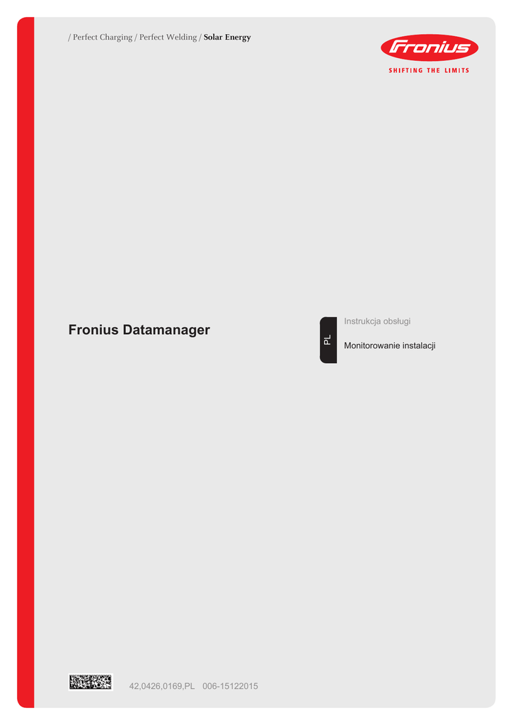 / Perfect Charging / Perfect Welding / Solar Energy 42,0426,0169,PL 006-15122015 Instrukcja obsługi PL Fronius Datamanager Monitorowanie instalacji 0 PL Szanowny użytkowniku! Wprowadzenie Dziękujemy za obdarzenie nas zaufaniem oraz gratulujemy wyboru produktu firmy Fronius o wysokiej jakości technicznej. Niniejsza instrukcja obsługi pomoże Państwu się z nim zaznajomić. Czytając uważnie instrukcję, poznają Państwo szeroki zakres zastosowań niniejszego produktu firmy Fronius. Tylko w ten sposób mogą Państwo najlepiej wykorzystać zalety produktu. Prosimy również o przestrzeganie instrukcji bezpieczeństwa, by zapewnić większe bezpieczeństwo w miejscu użytkowania produktu. Uważne obchodzenie się z produktem pomaga utrzymać jego trwałość i niezawodność. Są to niezbędne warunki osiągania należytych rezultatów jego użycia. 1 2 PL Spis treści Informacje ogólne Informacje ogólne ...................................................................................................................................... Informacje ogólne ................................................................................................................................. Dostępne wersje urządzenia „Fronius Datamanager” .......................................................................... Kompatybilne podzespoły DATCOM .................................................................................................... Warunki eksploatacji ............................................................................................................................. Wymagane oprogramowanie falownika ................................................................................................ Wskazówki dotyczące zakłóceń radiowych .......................................................................................... Zakres dostawy..................................................................................................................................... Użycie etykiet samoprzylepnych........................................................................................................... Przykłady konfiguracji ........................................................................................................................... Obliczenie objętości danych ...................................................................................................................... Informacje ogólne ................................................................................................................................. Wersja oprogramowania sprzętowego do obliczania objętości danych................................................ Obliczenie objętości danych ................................................................................................................. Przykłady obliczeń ................................................................................................................................ Ogólne informacje dla administratora sieci ................................................................................................ Warunki................................................................................................................................................. Ogólne ustawienia zapory firewall ........................................................................................................ Wysyłanie komunikatów serwisowych w przypadku połączenia internetowego DSL ........................... Użycie platformy „Fronius Solar.web” i wysyłanie komunikatów serwisowych ..................................... Elementy obsługi, przyłącza i wskaźniki .................................................................................................... Bezpieczeństwo .................................................................................................................................... Elementy obsługi, przyłącza i wskaźniki ............................................................................................... Schemat załączania wejść/wyjść .......................................................................................................... Instalacja urządzenia „Fronius Datamanager” Zamontować urządzenie „Fronius Datamanager” w falowniku .................................................................. Informacje ogólne ................................................................................................................................. Bezpieczeństwo .................................................................................................................................... Pozycja instalacyjna urządzenia „Fronius Datamanager”..................................................................... Montaż i podłączenie anteny WLAN .......................................................................................................... Informacje ogólne ................................................................................................................................. Montaż i podłączenie anteny w modelach Fronius IG, Fronius IG Plus, Fronius IG Plus V, Fronius CL Fronius IG USA, Fronius IG Plus USA, Fronius IG Plus V USA: montaż i podłączenie anteny ........... Instalacja urządzenia „Fronius Datamanager” w sieci „Fronius Solar Net” ................................................ Instalacja falownika wyposażonego w urządzenie „Fronius Datamanager” w sieci „Fronius Solar Net” Okablowanie .............................................................................................................................................. Uczestnik sieci Fronius Solar Net ......................................................................................................... Okablowanie uczestników sieci Fronius Solar Net ......................................................