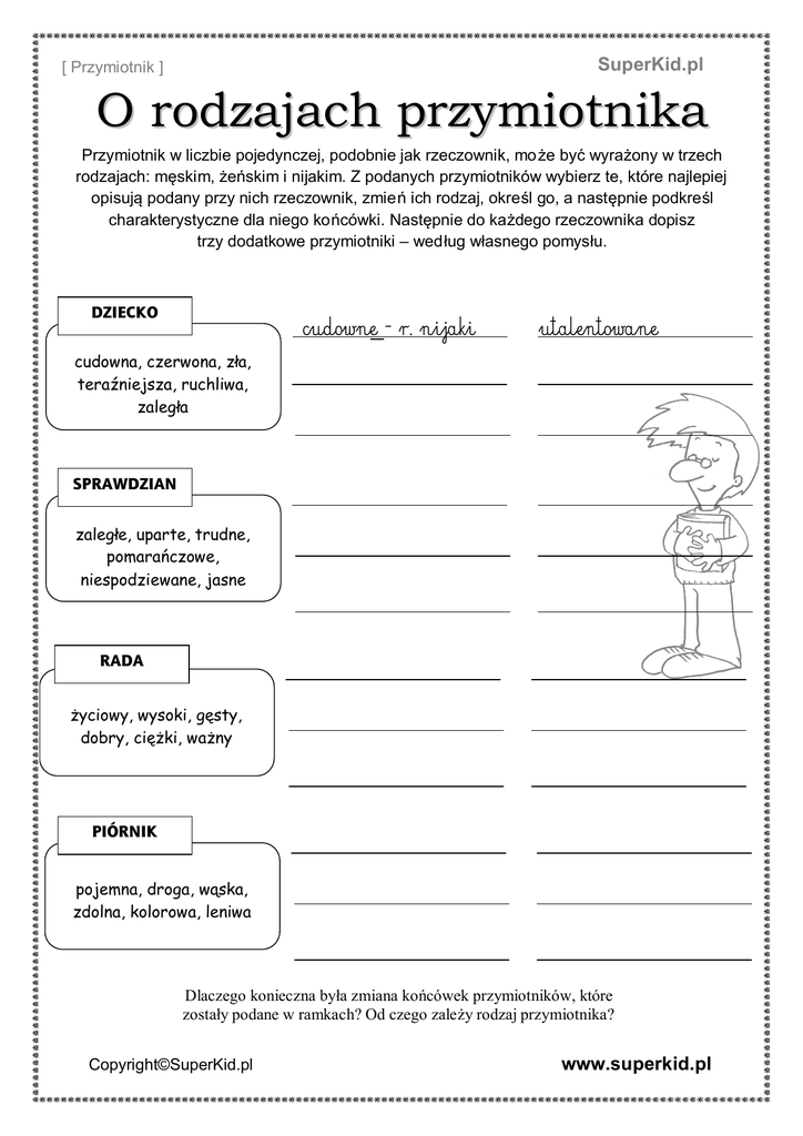 SuperKid.pl [ Przymiotnik ] O rodzajach przymiotnika Przymiotnik w liczbie pojedynczej, podobnie jak rzeczownik, mo że być wyrażony w trzech rodzajach: męskim, żeńskim i nijakim. Z podanych przymiotników wybierz te, które najlepiej opisują podany przy nich rzeczownik, zmień ich rodzaj, określ go, a następnie podkreśl charakterystyczne dla niego końcówki. Następnie do każdego rzeczownika dopisz trzy dodatkowe przymiotniki – według własnego pomysłu. DZIECKO cudowne – r. nijaki nies utalentowane cudowna, czerwona, zła, teraźniejsza, ruchliwa, zaległa SPRAWDZIAN zaległe, uparte, trudne, pomarańczowe, niespodziewane, jasne RADA życiowy, wysoki, gęsty, dobry, ciężki, ważny PIÓRNIK pojemna, droga, wąska, zdolna, kolorowa, leniwa Dlaczego konieczna była zmiana końcówek przymiotników, które zostały podane w ramkach? Od czego zależy rodzaj przymiotnika? Copyright©SuperKid.pl www.superkid.pl
