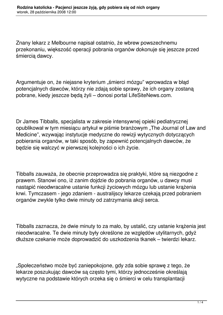 Rodzina katolicka - Pacjenci jeszcze żyją, gdy pobiera się od nich organy wtorek, 28 października 2008 12:00 Znany lekarz z Melbourne napisał ostatnio, że wbrew powszechnemu przekonaniu, większość operacji pobrania organów dokonuje się jeszcze przed śmiercią dawcy. Argumentuje on, że niejasne kryterium „śmierci mózgu” wprowadza w błąd potencjalnych dawców, którzy nie zdają sobie sprawy, że ich organy zostaną pobrane, kiedy jeszcze będą żyli – donosi portal LifeSiteNews.com. Dr James Tibballs, specjalista w zakresie intensywnej opieki pediatrycznej opublikował w tym miesiącu artykuł w piśmie branżowym „The Journal of Law and Medicine”, wzywając instytucje medyczne do rewizji wytycznych dotyczących pobierania organów, w taki sposób, by zapewnić potencjalnych dawców, że będzie się walczyć w pierwszej kolejności o ich życie. Tibballs zauważa, że obecnie przeprowadza się praktyki, które są niezgodne z prawem. Stanowi ono, iż zanim dojdzie do pobrania organów, u dawcy musi nastąpić nieodwracalne ustanie funkcji życiowych mózgu lub ustanie krążenia krwi. Tymczasem - jego zdaniem - australijscy lekarze czekają przed pobraniem organów zwykle tylko dwie minuty od zatrzymania akcji serca. Tibballs zaznacza, że dwie minuty to za mało, by ustalić, czy ustanie krążenia jest nieodwracalne. Te dwie minuty były określone ze względów utylitarnych, gdyż dłuższe czekanie może doprowadzić do uszkodzenia tkanek – twierdzi lekarz. „Społeczeństwo może być zaniepokojone, gdy zda sobie sprawę z tego, że lekarze poszukując dawców są często tymi, którzy jednocześnie określają wytyczne na podstawie których orzeka się o śmierci w celu transplantacji 1/4 Rodzina katolicka - Pacjenci jeszcze żyją, gdy pobiera się od nich organy wtorek, 28 października 2008 12:00 organów” – zauważa Tibballs. „Z tego powodu – pisze dalej – w komisjach powinni zasiadać ludzie z wykształceniem prawniczym, by tworzyć wytyczne kliniczne wykorzystywane do orzekania, że ktoś jest martwy”. Grupa lekarzy zajmujących się transplantologią skrytykowała artykuł Tibballsa, obawiając, się, ze potencjalni dawcy nie będą godzić się na ewentualne pobranie narządów. Dr Bill Silvester uważa, że z powodu zamieszania wokół definicji śmierci mózgu potencjalni dawcy mogą odmówić zgody na pobranie organów po ich śmierci. Z kolei dr Gerry O’Callaghan zapewnia, że potencjalni dawcy powinni zdać sobie sprawę, że śmierć mózgu, to jest prawdziwa śmierć. – Nie ma takiej możliwości, aby byli oni świadomi, aby mieli zdolność do odczuwania bólu, aby byli zdolni do samodzielnego życia – twierdzi lekarz. Dr Tibballs stwierdził, że wie, iż należy do mniejszości, jednak nic nie zmieni faktu, że wciąż rośnie grupa medyków, którzy wyrażają swoje zaniepokojenie z powodu agresywnej polityki pobierania organów na podstawie wytycznych, które nie dają pewności, że pacjent jest martwy. Kryterium tzw. śmierci mózgu, na podstawie którego orzeka się o definitywnej śmierci pacjenta, budzi coraz powszechniejsze zaniepokojenie. W Watykanie ma się zebrać w listopadzie specjalna komisja, która będzie tę kwestię badać. Samo kryterium śmierci mózgu zostało wprowadzone 40 lat temu przez naukowców z uniwersytetu Harvarda, którzy obawiali się, że zbyt długie czekanie może doprowadzić do uszkodzenia tzw. tkanek miękkich, jak serce, płuca, nerki itp., które później nie będą się nadawały do przeszczepu. 2/4 Rodzina katolicka - Pacjenci jeszcze żyją, gdy pobiera się od nich organy wtorek, 28 października 2008 12:00 Portal LifeSiteNews.com informował wielokrotnie o przypadkach, kiedy stwierdzono u pacjenta śmierć mózgu, poczym budził się on po jakimś czasie ze śpiączki. Znana jest m.in. sprawa Francuza, u którego w czerwcu tego roku doszło do ataku serca i przerwania akcji serca na przynajmniej 90 minut. Pacjent był już przygotowany do zabiegu pobrania organów, jednak na stole operacyjnym lekarze zauważyli, że puls jest wyczuwalny, a mężczyzna oddycha i reaguje na ból. W ciągu kilku tygodni chory, u którego stwierdzono śmierć mózgu, wrócił do zdrowia. Chodził i rozmawiał. W innym przypadku – 21-letniego Zacka Dunlapa, przygotowanego do operacji pobrania narządów – krewni zauważyli, że mężczyzna reaguje na dotyk. Lekarze zakwalifikowali go do zabiegu, gdyż stwierdzili, że ustało krążenie i krew nie dochodzi do mózgu. Zack, kiedy obudził się powiedział, że słyszał lekarzy, gdy orzekali o jego śmierci, kiedy leżał pozornie nieprzytomny. Specjalista dr John Shea w artykule zatytułowanym „Dawstwo organów: niewygodna prawda” napisał, że często podaje się dawcy znieczulenie, by nie ruszał się na stole operacyjnym w czasie pobierania organów. Zauważono bowiem, że wielu dawców ruszało się w czasie pobierania organów i w dodatku wzrastało u nich ciśnienie krwi, co było reakcją na nacięcie skóry. Zawsze tak się dzieje u żywych pacjentów, którym poda się niewystarczającą dawkę znieczulenia anastezjologicznego. Jest to reakcja na ból wywołana nacięciem skóry. Dlatego dr Shea uważa, że jest to powód wystarczający, by uznać, że pacjent jeszcze żyje, bo odczuwa ból. Obecnie jego zdaniem bardzo często podaje się jakąś formę znieczulenia, by unieruchomić mięśnie, gdyż jest to stresujące dla lekarzy i pielęgniarek przeprowadzających zabieg pobrania organów od potencjalnego dawcy, który się rusza. Źródło: LifeSiteNews.com 3/4 Rodzina katolicka - Pacjenci jeszcze żyją, gdy pobiera się od nich organy wtorek, 28 października 2008 12:00 Za: PiotrSkarga.pl 4/4