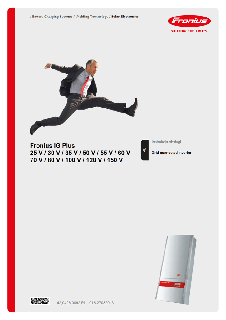 0 2 System nieuziemiony: Podłączanie linii modułów solarnych kablem o przekroju > 16 mm²................. Uziemienie modułów solarnych na biegunie ujemnym: Podłączanie linii modułów solarnych................... Informacje ogólne ................................................................................................................................. Przekroje przewodów linii modułów solarnych...................................................................................... Uziemienie modułów solarnych na biegunie ujemnym: Podłączanie linii modułów solarnych.............. Wybór bezpieczników linii ..................................................................................................................... Wkładanie bezpieczników linii............................................................................................................... Uziemienie modułów solarnych na biegunie ujemnym: Podłączanie linii modułów solarnych kablem o przekroju > 16 mm² ................................................................................................................................. Informacje ogólne ................................................................................................................................. Wymagane elementy dodatkowe.......................................................................................................... Uziemienie modułów solarnych na biegunie ujemnym: Podłączanie linii modułów solarnych kablem o przekroju > 16 mm² ............................................................................................................................ Uziemienie modułów solarnych na biegunie ujemnym w falowniku Fronius IG Plus ................................. Informacje ogólne ................................................................................................................................. Uziemienie modułów solarnych na biegunie ujemnym ......................................................................... Uziemienie modułów solarnych na biegunie ujemnym w falowniku Fronius IG Plus............................ Bezpieczeństwo .................................................................................................................................... Konfiguracja falownika w przypadku uziemionych modułów solarnych ................................................ Uziemienie modułu solarnego: Instalowanie bezpiecznika lub opcjonalnego zestawu „Grounding Kit 100 kiloomów”....................................................................................................................................... Otwieranie falownika Fronius IG Plus do prac konserwacyjnych.......................................................... Uziemienie modułów solarnych na biegunie dodatnim: Podłączanie linii modułów solarnych .................. Informacje ogólne ................................................................................................................................. Przekroje przewodów linii modułów solarnych...................................................................................... Uziemienie modułów solarnych na biegunie dodatnim: Podłączanie linii modułów solarnych ............. Wybór bezpieczników linii ..................................................................................................................... Wkładanie bezpieczników linii............................................................................................................... Uziemienie modułów solarnych na biegunie dodatnim: Podłączanie linii modułów solarnych kablem o przekroju > 16 mm² ................................................................................................................................. Informacje ogólne ................................................................................................................................. Wymagane elementy dodatkowe.......................................................................................................... Uziemienie modułów solarnych na biegunie dodatnim: Podłączanie linii modułów solarnych kablem o przekroju > 16 mm² ............................................................................................................................ Uziemienie modułów solarnych na biegunie dodatnim w falowniku Fronius IG Plus................................. Informacje ogólne ................................................................................................................................. Uziemienie modułów solarnych na biegunie dodatnim ......................................................................... Uziemienie modułów solarnych na biegunie dodatnim w falowniku Fronius IG Plus............................ Bezpieczeństwo .................................................................................................................................... Konfiguracja falownika w przypadku uziemionych modułów solarnych ................................................ Uziemienie modułu solarnego: Instalowanie bezpiecznika lub opcjonalnego zestawu „Grounding Kit 100 kiloomów”....................................................................................................................................... Otwieranie falownika Fronius IG Plus do prac konserwacyjnych.......................................................... Kryteria wyboru właściwych bezpieczników linii ........................................................................................ Informacje ogólne ................................................................................................................................. Kryteria wyboru właściwych bezpieczników linii ................................................................................... Skutki zastosowania bezpieczników obliczonych na zbyt małą wartoś