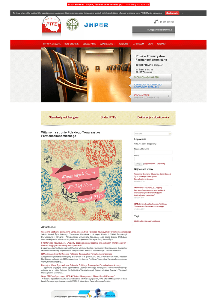Zrzut strony: http://farmakoekonomika.pl/ <--kliknij na adresie Ta strona używa plków cookies, które są potrzebne do poprawnego działania serwisu oraz wykorzystywane w celach statystycznych. Więcej informacji uzyskasz w menu POMOC Twojej przeglądarki Zgadzam się + 48 505 313 255 STRONA GŁÓWNA KONFERENCJE SEKCJE PTFE DZIAŁALNOŚĆ KONKURS ARCHIWUM LINKI KONTAKT Polskie Towarzystwo Farmakoekonomiczne ISPOR POLAND Chapter ul. Śliska 3 lok. 55 00-127 Warszawa Standardy edukacyjne Statut PTFe Witamy na stronie Polskiego Towarzystwa Farmakoekonomicznego Deklaracja członkowska Wyszukaj Logowanie Witaj, nie jesteś zalogowany! Nazwa użytkownika Hasło Zaloguj | Zapomniałem | Zarejestruj Najnowsze wpisy Wiosenne Spotkanie Edukacyjne Sekcji Jakości Życia Polskiego Towarzystwa Farmakoekonomicznego kwiecień, 2014 I Konferencja Naukowa, pt.: „Aspekty bezpieczeństwa leczenia przeciwciałami monoklonalnymi i białkami fuzyjnymi – teraźniejszość i przyszłość”, styczeń, 2014 XI Międzynarodowa Konferencja Polskiego Towarzystwa Farmakoekonomicznego grudzień, 2013 Tagi jakość konferencja udział współpraca Aktualności Wiosenne Spotkanie Edukacyjne Sekcji Jakości Życia Polskiego Towarzystwa Farmakoekonomicznego Sekcja Jakości Życia Polskiego Towarzystwa Farmakoekonomicznego, Katedra i Zakład Farmakologii Doświadczalnej i Klinicznej Warszawskiego Uniwersytetu Medycznego oraz Szkoła Biznesu Politechniki Warszawskiej serdecznie zapraszają na Wiosenne Spotkanie Edukacyjne Sekcji Jakości Życia ... I Konferencja Naukowa, pt.: „Aspekty bezpieczeństwa leczenia przeciwciałami monoklonalnymi i białkami fuzyjnymi – teraźniejszość i przyszłość”, Z przyjemnością chcielibyśmy zaprosić Państwa w imieniu Komitetu Naukowego i Organizacyjnego do udziału w I Konferencji Naukowej, organizowanej pod patronatem Journal of Health Policy & Outcomes Research ... XI Międzynarodowa Konferencja Polskiego Towarzystwa Farmakoekonomicznego z przyjemnością Państwa informujemy, że w dniach 5 –6 grudnia 2013 roku, w warszawskim Hotelu Radisson Blu Sobieski, odbędzie się XI Międzynarodowa Konferencja Polskiego Towarzystwa Farmakoekonomicznego. Główny temat tegorocznej ... Zwyczajne Walne Zgromadzenie Członków Polskiego Towarzystwa Farmakoekonomicznego Tegoroczne Zwyczajne Walne Zgromadzenie Członków Polskiego Towarzystwa Farmakoekonomicznego odbędzie się w Hotelu Radisson Blu Sobieski w Warszawie w sali Gatrium (pl. Artura Zawiszy 1, Warszawa) Pierwszy termin spotkania: ... Sesja PTFE na Sympozjum „HTA & Efficient Management of Basic Benefit Package” W dniach 7-8 października 2013 roku w Warszawie odbyło się Sympozjum „HTA& Efficient Management of Basic Benefit Package” organizowane przez CEESTAHC (Central and Eastern European Society ... . Zrzut strony: http://farmakoekonomika.pl/ <--kliknij na adresie Copyright © 2013 Polskie Towarszystwo Farmakoekonomiczne. All rights reserved. Wykonanie: PDS - Strony internetowe