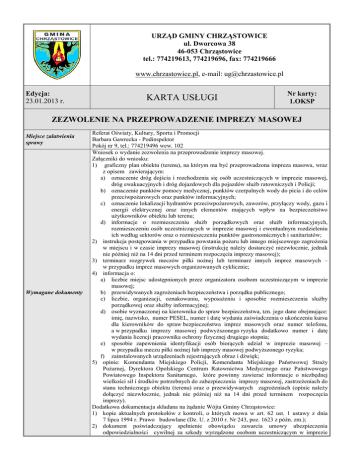 URZĄD GMINY CHRZĄSTOWICE ul. Dworcowa 38 46-053 Chrząstowice tel.: 774219613, 774219696, fax: 774219666 www.chrzastowice.pl, e-mail: [email protected] Edycja: 23.01.2013 r. KARTA USŁUGI Nr karty: 1.OKSP ZEZWOLENIE NA PRZEPROWADZENIE IMPREZY MASOWEJ Miejsce załatwienia sprawy Wymagane dokumenty Referat Oświaty, Kultury, Sportu i Promocji Barbara Gawrecka - Podinspektor Pokój nr 9, tel.: 774219496 wew. 102 Wniosek o wydanie zezwolenia na przeprowadzenie imprezy masowej. Załączniki do wniosku: 1) graficzny plan obiektu (terenu), na którym ma być przeprowadzona impreza masowa, wraz z opisem zawierającym: a) oznaczenie dróg dojścia i rozchodzenia się osób uczestniczących w imprezie masowej, dróg ewakuacyjnych i dróg dojazdowych dla pojazdów służb ratowniczych i Policji; b) oznaczenie punktów pomocy medycznej, punktów czerpalnych wody do picia i do celów przeciwpożarowych oraz punktów informacyjnych; c) oznaczenie lokalizacji hydrantów przeciwpożarowych, zaworów, przyłączy wody, gazu i energii elektrycznej oraz innych elementów mających wpływ na bezpieczeństwo użytkowników obiektu lub terenu; d) informacje o rozmieszczeniu służb porządkowych oraz służb informacyjnych, rozmieszczeniu osób uczestniczących w imprezie masowej i ewentualnym rozdzieleniu ich według sektorów oraz o rozmieszczeniu punktów gastronomicznych i sanitariatów; 2) instrukcja postępowania w przypadku powstania pożaru lub innego miejscowego zagrożenia w miejscu i w czasie imprezy masowej (instrukcję należy dostarczyć niezwłocznie, jednak nie później niż na 14 dni przed terminem rozpoczęcia imprezy masowej); 3) terminarz rozgrywek meczów piłki nożnej lub terminarz innych imprez masowych – w przypadku imprez masowych organizowanych cyklicznie; 4) informacja o: a) liczbie miejsc udostępnionych przez organizatora osobom uczestniczącym w imprezie masowej; b) przewidywanych zagrożeniach bezpieczeństwa i porządku publicznego; c) liczbie, organizacji, oznakowaniu, wyposażeniu i sposobie rozmieszczenia służby porządkowej oraz służby informacyjnej; d) osobie wyznaczonej na kierownika do spraw bezpieczeństwa, tzn. jego dane obejmujące: imię, nazwisko, numer PESEL, numer i datę wydania zaświadczenia o ukończeniu kursu dla kierowników do spraw bezpieczeństwa imprez masowych oraz numer telefonu, a w przypadku imprezy masowej podwyższonego ryzyka dodatkowo numer i datę wydania licencji pracownika ochrony fizycznej drugiego stopnia; e) sposobie zapewnienia identyfikacji osób biorących udział w imprezie masowej – w przypadku meczu piłki nożnej lub imprezy masowej podwyższonego ryzyka; f) zainstalowanych urządzeniach rejestrujących obraz i dźwięk; 5) opinie: Komendanta Miejskiego Policji, Komendanta Miejskiego Państwowej Straży Pożarnej, Dyrektora Opolskiego Centrum Ratownictwa Medycznego oraz Państwowego Powiatowego Inspektora Sanitarnego, które powinny zawierać informacje o niezbędnej wielkości sił i środków potrzebnych do zabezpieczenia imprezy masowej, zastrzeżeniach do stanu technicznego obiektu (terenu) oraz o przewidywanych zagrożeniach (opinie należy dołączyć niezwłocznie, jednak nie później niż na 14 dni przed terminem rozpoczęcia imprezy). Dodatkowa dokumentacja składana na żądanie Wójta Gminy Chrząstowice: 1) kopie aktualnych protokołów z kontroli, o których mowa w art. 62 ust. 1 ustawy z dnia 7 lipca 1994 r. Prawo budowlane (Dz. U. z 2010 r. Nr 243, poz. 1623 z późn. zm.); 2) dokument poświadczający spełnienie obowiązku zawarcia umowy ubezpieczenia odpowiedzialności cywilnej za szkody wyrządzone osobom uczestniczącym w imprezie Opłaty Podstawa prawna Termin składania dokumentów Termin realizacji Tryb odwoławczy Informacje dodatkowe Formularze wniosków i druki do pobrania masowej, na którą wstęp jest odpłatny; 3) pisemna zgoda na przeprowadzenie imprezy masowej, wydana przez kierownika jednostki organizacyjnej Lasów Państwowych, parku narodowego lub krajobrazowego – w razie przeprowadzania imprezy na terenach będących w zarządzie tej jednostki; 4) program i regulamin imprezy masowej oraz regulamin obiektu (terenu), wraz z informacją o sposobie ich udostępniania uczestnikom imprezy masowej; 5) pisemna instrukcja określająca zadania służby porządkowej oraz służby informacyjnej; 6) kserokopia aktualnego wypisu z właściwego rejestru, dotyczącego organizatora imprezy masowej. 82 zł – opłata skarbowa za wydanie zezwolenia na przeprowadzenie imprezy masowej. Opłata w kasie tut. Urzędu lub na numer rachunku bankowego: 93 8907 1063 2008 7006 6514 0002, Bank Spółdzielczy w Leśnicy, Filia Chrząstowice. 1. Ustawa z dnia 14 czerwca 1960 r. Kodeks postępowania administracyjnego (Dz. U. z 2000 r., Nr 98, poz. 1071 z późn. zm.). 2. Ustawa z dnia 20 marca 2009 r. o bezpieczeństwie imprez masowych (Dz. U., Nr 62, poz. 504). 3. Ustawa z dnia 16 listopada 2006 r. o opłacie skarbowej (Dz. U. z 2006 r., nr 225, poz. 1635 z późn. zm.) Wniosek o wydanie zezwolenia wraz z wymaganymi załącznikami powinien zostać złożony nie później niż na 30 dni przed planowanym terminem rozpoczęcia imprezy masowej. Opinie muszą być dostarczone nie później niż na 14 dni przed planowaną imprezą masową. Zezwolenie lub odmowa na przeprowadzenie imprezy masowej następuje w formie decyzji administracyjnej. Organ ma na to 7 dni od dnia złożenia wniosku. Od decyzji organu przysługuje odwołanie do Samorządowego Kolegium Odwoławczego w Opolu za pośrednictwem Wójta. Samorządowe Kolegium Odwoławcze rozpatruje odwołanie w terminie 4 dni od dnia jego wniesienia. 1. Zezwolenie na przeprowadzenie imprezy masowej nie zwalnia organizatora od uzyskania zgody zarządzającego terenem na jej zorganizowanie. 2. Jeżeli imprezy masowe są przeprowadzane przez tego samego organizatora w tych samych obiektach i na terenach do tego przystosowanych częściej niż 2 razy w roku lub są to impre