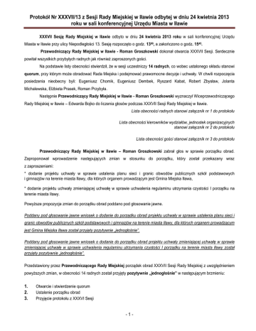 Protokół Nr XXXVII/13 z Sesji Rady Miejskiej w Iławie odbytej w dniu 24 kwietnia 2013 roku w sali konferencyjnej Urzędu Miasta w Iławie XXXVII Sesję Rady Miejskiej w Iławie odbyto w dniu 24 kwietnia 2013 roku w sali konferencyjnej Urzędu Miasta w Iławie przy ulicy Niepodległości 13. Sesję rozpoczęto o godz. 1300, a zakończono o godz. 1545. Przewodniczący Rady Miejskiej w Iławie - Roman Groszkowski dokonał otwarcia XXXVII Sesji. Serdecznie powitał wszystkich przybyłych radnych jak również zaproszonych gości. Na podstawie listy obecności stwierdził, że w sesji uczestniczy 14 radnych, co wobec ustalonego składu stanowi quorum, przy którym może obradować Rada Miejska i podejmować prawomocne decyzje i uchwały. W chwili rozpoczęcia posiedzenia nieobecny byli: Eugeniusz Chomik, Eugeniusz Dembek, Ryszard Kabat, Robert Zbysław, Jolanta Michalewska, Elżbieta Prasek, Roman Przybyła. Następnie Przewodniczący Rady Miejskiej w Iławie - Roman Groszkowski wyznaczył Wiceprzewodniczącego Rady Miejskiej w Iławie – Edwarda Bojko do liczenia głosów podczas XXXVII Sesji Rady Miejskiej w Iławie. Lista obecności radnych stanowi załącznik nr 1 do protokołu Lista obecności kierowników wydziałów, jednostek organizacyjnych stanowi załącznik nr 2 do protokołu Lista obecności gości stanowi załącznik nr 3 do protokołu Przewodniczący Rady Miejskiej w Iławie – Roman Groszkowski zabrał głos w sprawie porządku obrad. Zaproponował wprowadzenie następujących zmian w stosunku do porządku, który został przekazany wraz z zaproszeniami: * dodanie projektu uchwały w sprawie ustalenia planu sieci i granic obwodów publicznych szkół podstawowych i gimnazjów na terenie miasta Iławy, dla których organem prowadzącym jest Gmina Miejska Iława, * dodanie projektu uchwały zmieniającej uchwałę w sprawie uchwalenia regulaminu utrzymania czystości I porządku na terenie miasta Iławy. Powyższe propozycje zmian do porządku obrad poddano pod głosowanie jawne. Poddany pod głosowanie jawne wniosek o dodanie do porządku obrad projektu uchwały w sprawie ustalenia planu sieci i granic obwodów publicznych szkół podstawowych i gimnazjów na terenie miasta Iławy, dla których organem prowadzącym jest Gmina Miejska Iława został przyjęty pozytywnie „jednogłośnie”. Poddany pod głosowanie jawne wniosek o dodanie do porządku obrad projektu uchwały zmieniającej uchwałę w sprawie zmieniającej uchwałę w sprawie uchwalenia regulaminu utrzymania czystości I porządku na terenie miasta Iławy został przyjęty pozytywnie „jednogłośnie”. Przedstawiony przez Przewodniczącego Rady Miejskiej porządek obrad XXXVII Sesji Rady Miejskiej z uwzględnieniem powyższych zmian, w obecności 14 radnych został przyjęty pozytywnie „jednogłośnie” w następującym brzmieniu: 1. 2. 3. Otwarcie i stwierdzenie quorum Ustalenie porządku obrad Przyjęcie protokołu z XXXVI Sesji -1- Protokół Nr XXXVII/13 z Sesji Rady Miejskiej w Iławie odbytej w dniu 24 kwietnia 2013 roku w sali konferencyjnej Urzędu Miasta w Iławie 4. 5. 6. 7. 8. 9. 10. 11. 12. 13. Ocena zasobów pomocy społecznej dla Gminy Miejskiej Iława na rok 2013 Informacja na temat aktualnego bezrobocia na terenie miasta Iławy oraz form przeciwdziałania jemu. Informacja na temat zaopatrzenia mieszkańców miasta w ciepło i ciepłą wodę oraz perspektyw rozbudowy sieci ciepłowniczej Podjęcie uchwał w sprawie: a. zmian w Wieloletniej Prognozie Finansowej miasta na lata 2013-2016 b. zmian w budżecie miasta na 2013 rok c. odstąpienia od żądania zwrotu udzielonej bonifikaty d. zbycia prawa własności nieruchomości przy ul. Ziemowita e. ustalenia planu sieci i granic obwodów publicznych szkół podstawowych i gimnazjów na terenie miasta Iławy, dla których organem prowadzącym jest Gmina Miejska Iława f. zmieniająca uchwałę w sprawie uchwalenia regulaminu utrzymania czystości I porządku na terenie miasta Iławy. Sprawozdanie z działalności międzysesyjnej Burmistrza Miasta Interpelacje i zapytania radnych Odpowiedzi na interpelacje i zapytania Wnioski mieszkańców Iławy Komunikaty i oświadczenia Zamknięcie obrad XXXVII Sesji Ad.1 Otwarcie i stwierdzenie quorum Przewodniczący Rady Miejskiej - Roman Groszkowski o godzinie 1300 otworzył XXXVII Sesję Rady Miejskiej w Iławie i przewodniczył jej obradom. Na podstawie listy obecności stwierdził, że w Sesji uczestniczy 14 radnych, co stanowi quorum dla podejmowania prawomocnych decyzji i wniosków. Ad.2. Ustalenie porządku posiedzenia Przewodniczący Rady Miejskiej - Roman Groszkowski po przyjęciu porządku w powyższym brzmieniu przystąpił do jego realizacji. Niżej zaprezentowana karta opinii z poszczególnych posiedzeń komisji w miesiącu kwietniu jest informacją dotyczącą zaopiniowania każdego materiału sesyjnego oraz projektu uchwały. Szczegółowa karta opinii głosowań poszczególnych materiałów oraz projektów uchwał z posiedzeń stałych komisji stanowi załącznik nr 4 do protokołu ZMIANA QUORUM – DO OBRAD PRZYSTĄPIŁ RADNY EUGENIUSZ DEMBEK ORAZ ROMAN PRZYBYŁA. AKTUALNIE W POSIEDZENIU UCZESTNICZY 16 RADNYCH. Ad.3. Przyjęcie protokołu z XXXVI Sesji Przewodniczący Rady Miejskiej - Roman Groszkowski przekazał informację, że w Biuletynie Informacji Publicznej opublikowano oraz wyłożono do wglądu w Biurze Rady Miejskiej protokół z XXXVI Sesji Rady Miejskiej -2- Protokół Nr XXXVII/13 z Sesji Rady Miejskiej w Iławie odbytej w dniu 24 kwietnia 2013 roku w sali konferencyjnej Urzędu Miasta w Iławie w Iławie. Do chwili rozpoczęcia dzisiejszych obrad, nikt nie złożył pisemnych uwag do powyższego protokołu, w związku z czym protokół XXXVI uznano za przyjęty. ZMIANA QUORUM – DO OBRAD PRZYSTĄPIŁA RADNA ELŻBIETA PRASEK. AKTUALNIE W POSIEDZENIU UCZESTNICZY 17 RADNYCH. Ad.4. Ocena zasobów pomocy społecznej dla Gminy Miejskiej Iława na rok 2013 Na wstępie głos zabra