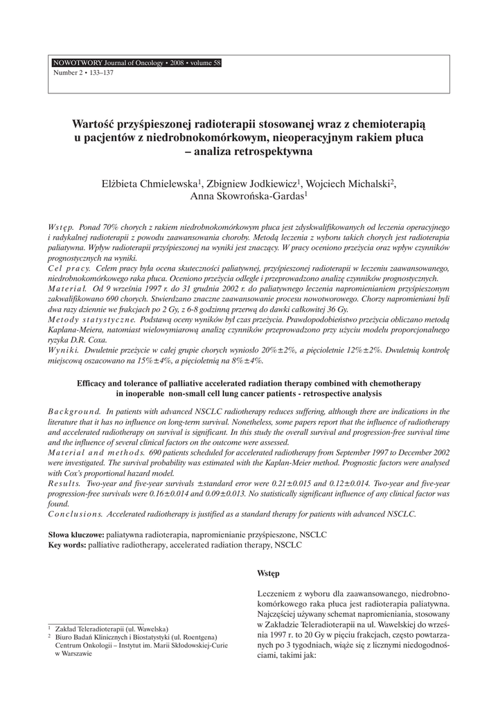 NOWOTWORY Journal of Oncology • 2008 • volume 58 Number 2 • 133–137 Wartość przyśpieszonej radioterapii stosowanej wraz z chemioterapią u pacjentów z niedrobnokomórkowym, nieoperacyjnym rakiem płuca – analiza retrospektywna Elżbieta Chmielewska1, Zbigniew Jodkiewicz1, Wojciech Michalski2, Anna Skowrońska-Gardas1 Ws t ę p. Ponad 70% chorych z rakiem niedrobnokomórkowym płuca jest zdyskwalifikowanych od leczenia operacyjnego i radykalnej radioterapii z powodu zaawansowania choroby. Metodą leczenia z wyboru takich chorych jest radioterapia paliatywna. Wpływ radioterapii przyśpieszonej na wyniki jest znaczący. W pracy oceniono przeżycia oraz wpływ czynników prognostycznych na wyniki. C e l p r a c y. Celem pracy była ocena skuteczności paliatywnej, przyśpieszonej radioterapii w leczeniu zaawansowanego, niedrobnokomórkowego raka płuca. Oceniono przeżycia odległe i przeprowadzono analizę czynników prognostycznych. M a t e r i a ł. Od 9 września 1997 r. do 31 grudnia 2002 r. do paliatywnego leczenia napromienianiem przyśpieszonym zakwalifikowano 690 chorych. Stwierdzano znaczne zaawansowanie procesu nowotworowego. Chorzy napromieniani byli dwa razy dziennie we frakcjach po 2 Gy, z 6-8 godzinną przerwą do dawki całkowitej 36 Gy. M e t o d y s t a t y s t y c z n e. Podstawą oceny wyników był czas przeżycia. Prawdopodobieństwo przeżycia obliczano metodą Kaplana-Meiera, natomiast wielowymiarową analizę czynników przeprowadzono przy użyciu modelu proporcjonalnego ryzyka D.R. Coxa. W y n i k i. Dwuletnie przeżycie w całej grupie chorych wyniosło 20%±2%, a pięcioletnie 12%±2%. Dwuletnią kontrolę miejscową oszacowano na 15%±4%, a pięcioletnią na 8%±4%. Efficacy and tolerance of palliative accelerated radiation therapy combined with chemotherapy in inoperable non-small cell lung cancer patients - retrospective analysis B a c k g r o u n d. In patients with advanced NSCLC radiotherapy reduces suffering, although there are indications in the literature that it has no influence on long-term survival. Nonetheless, some papers report that the influence of radiotherapy and accelerated radiotherapy on survival is significant. In this study the overall survival and progression-free survival time and the influence of several clinical factors on the outcome were assessed. M a t e r i a l a n d m e t h o d s. 690 patients scheduled for accelerated radiotherapy from September 1997 to December 2002 were investigated. The survival probability was estimated with the Kaplan-Meier method. Prognostic factors were analysed with Cox’s proportional hazard model. R e s u l t s. Two-year and five-year survivals ±standard error were 0.21±0.015 and 0.12±0.014. Two-year and five-year progression-free survivals were 0.16±0.014 and 0.09±0.013. No statistically significant influence of any clinical factor was found. C o n c l u s i o n s. Accelerated radiotherapy is justified as a standard therapy for patients with advanced NSCLC. Słowa kluczowe: paliatywna radioterapia, napromienianie przyśpieszone, NSCLC Key words: palliative radiotherapy, accelerated radiation therapy, NSCLC Wstęp 1 2 Zakład Teleradioterapii (ul. Wawelska) Biuro Badań Klinicznych i Biostatystyki (ul. Roentgena) Centrum Onkologii – Instytut im. Marii Skłodowskiej-Curie w Warszawie Leczeniem z wyboru dla zaawansowanego, niedrobnokomórkowego raka płuca jest radioterapia paliatywna. Najczęściej używany schemat napromieniania, stosowany w Zakładzie Teleradioterapii na ul. Wawelskiej do września 1997 r. to 20 Gy w pięciu frakcjach, często powtarzanych po 3 tygodniach, wiąże się z licznymi niedogodnościami, takimi jak: 134 − konieczność dwukrotnego hospitalizowania chorych, w sumie czas leczenia 5 tygodni, − podawanie wysokich dawek frakcyjnych, co u chorych z dłuższym przeżyciem mogło powodować groźne powikłania popromienne w rejonie przełyku i odcinka piersiowego rdzenia kręgowego. Zastosowanie przyśpieszonej radioterapii niesie za sobą liczne korzyści, takie jak: − skrócenie czasu hospitalizacji napromienianych chorych, − zmniejszenie odsetka powikłań dzięki niższym dawkom frakcyjnym, − ewentualną poprawę wyników przez skrócenie całkowitego czasu leczenia. Ostatnio coraz więcej autorów proponuje radioterapię przyspieszoną także w leczeniu paliatywnym, gdyż przynosi ona rezultaty zbliżone do leczenia o założeniu radykalnym [1-4]. Celem pracy była ocena skuteczności paliatywnej radioterapii, prowadzonej metodą napromieniania przyśpieszonego, zastosowanej w Zakładzie Radioterapii na ul. Wawelskiej u chorych z zaawansowanym, niedrobnokomórkowym rakiem płuca. Tab. I. Charakterystyka materiału Wiek mediana 62 przedział 30-82 Liczba Procent męska 570 82,6 żeńska 120 17,4 0 451 65,4 1 178 25,8 2 57 8,3 3 4 0,6 Płeć WHO stan ogólny chorego T T1 11 1,6 T2 97 14,1 T3 345 50,0 T4 237 34,3 N N0 28 4,1 Materiał N1 130 18,8 N2 426 61,7 W okresie od 9 września 1997 r. do 31 grudnia 2002 r. przeprowadzono paliatywną radioterapię metodą napromieniania przyśpieszonego u 690 chorych. Grupę tę poddano analizie. Wszyscy chorzy byli badani klinicznie, posiadali rtg klatki piersiowej z kontrastem w przełyku, CT klatki piersiowej z kontrastem, badanie bronchoskopowe oraz rutynowe badania krwi. Wszyscy mieli wykonane USG jamy brzusznej. Ocenę stanu ogólnego analizowanej grupy chorych prowadzono według pięciostopniowej skali stopnia sprawności WHO. 678 chorych ukończyło planowane leczenie, 12 przerwało je z powodu pogorszenia stanu ogólnego, ale zostali włączeni do analizy. Wielkość guza w dużej grupie chorych (390) przekraczała średnicę 5 cm. Zgodnie z przyjętymi zasadami klasyfikacji kwalifikowali się oni do leczenia paliatywnego. U 300 chorych guz był mniejszy niż 5 cm, jednak ta grupa została także zakwalifikowana do leczenia paliatywnego. U 130 chorych przyczyną były nienowotworowe choroby współistni