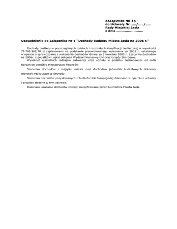 ZAŁĄCZNIK NR 16 do Uchwały Nr ...../...../..... Rady Miejskiej Jasła z dnia ......................... Uzasadnienie do Załącznika Nr 1 “Dochody budżetu miasta Jasła na 2006 r.” Dochody budżetu w poszczególnych działach i rozdziałach klasyfikacji budżetowej w wysokości 75 785 568,78 zł zaplanowano na podstawie przewidywanego wykonania za 2005 r. ustalonego w oparciu o sprawozdanie z wykonania dochodów Gminy za 3 kwartały 2005 r. Szacunku dochodów na 2006r. z podatków i opłat dokonali Wydział Finansowy UM oraz Urzędy Skarbowe. Wysokość wszystkich rodzajów subwencji oraz udziału w podatku dochodowym od osób fizycznych określiło Ministerstwo Finansów. Szacunku dochodów z majątku miasta oraz dochodów jednostek budżetowych dokonały jednostki realizujące te dochody. Szacunku dochodów pozyskiwanych z budżetu Unii Europejskiej dokonano w oparciu o uchwały i projekty złożone w tym zakresie. Dokonane szacunki dochodów zostały zweryfikowane przez Burmistrza Miasta Jasła. DOCHODY 010 Rolnictwo i łowiectwo Plan: 01095 Pozostała działalność 160,00 Opłaty za dzierżawę obwodów łowieckich 600 Transport i łączność 160,00 Plan: 60014 Drogi publiczne powiatowe 3 383 353,11 6 000,00 Wpływy z wpłat powiatu na utrzymanie dróg w ramach zawartego porozumienia 6 000,00 60016 Drogi publiczne gminne 3 377 353,11 Darowizna - 160,00 211 932,00 Darowizna - CARBON BLACK POLSKA Spółka z o.o. w związku z podpisanym porozumieniem o budowę drogi dojazdowej uzbrojenie stref gospodarczych i inwestycyjnych miasta 211 932,00 Dofinansowanie z Unii Europejskiej 3 150 421,11 - Budowa ulicy Dobrzańskiego 300 233,26 - Budowa drogi dojazdowej - uzbrojenie stref gospodarczych i inwestycyjnych miasta (Etap I) 334 997,00 - Przebudowa ul. Fabrycznej i budowa parkingów 1 318 137,73 - Budowa skrzyżowania ulicy KZ4 z drogą krajową nr 28 w strefie przemysłowej jako element transgranicznego rozwoju Gminy Miasto Jasło 1 047 053,12 - Modernizacja ciągu komunikacyjnego 150 000,00 Wpływy z wpłat za zajęcie pasa drogowego - 15 000,00 Wpływy z wpłat za zajęcie pasa drogowego 700 Gospodarka mieszkaniowa 15 000,00 Plan: 70005 Gospodarka gruntami i nieruchomościami 2 240 500,00 2 240 000,00 Dochody z nieruchomości - realizowane przez Wydział Spraw Lokalowych 800 000,00 - Sprzedaż lokali mieszkalnych 100 000,00 - Najem i dzierżawy 700 000,00 Dochody z nieruchomości realizowane przez Wydział Geodezji i Gospodarki Gruntami 1 440 000,00 - Dochody ze sprzedaży nieruchomości gminnych 1 000 000,00 - Opłaty roczne z tytułu użytkowania wieczystego, zarządu i użytkowania nieruchomości 140 000,00 - Dochody z najmu i dzierżawy nieruchomości gminnych 300 000,00 70095 Pozostała działalność 500,00 Dochody z nieruchomości - realizowane przez Wydział Spraw Lokalowych 500,00 Wpływy wynikające z rozliczenia mediów dostarczanych najemcom ze wspólnego punktu pomiarowego 500,00 - 710 Działalność usługowa 71035 Cmentarze Wpływy z opłat cmentarnych Plan: 40 000,00 40 000,00 40 000,00 750 Administracja publiczna Plan: 619 670,33 75011 Urzędy wojewódzkie 227 035,00 Dotacje na zadania zlecone 221 535,00 - Dotacja celowa otrzymana z budżetu państwa na realizację zadań bieżących z zakresu administracji rządowej oraz innych zadań zleconych Gminie 221 535,00 Pozostałe dochody - 5 500,00 5 % dochodów uzyskiwanych na rzecz budżetu państwa w związku z realizacją zadań z zakresu administracji rządowej oraz innych zadań zleconych ustawami (dowody osobiste) 5 500,00 75023 Urzędy gmin (miast i miast na prawach powiatu) 56 780,00 Dochody z majątku miasta 11 780,00 - Zwrot kosztów prowadzenia kasy zapomogowo pożyczkowej 9 460,00 - Wynajem pomieszczenia na bankomat 2 320,00 Pozostałe dochody - 45 000,00 Dochody z tytułu mandatów nakładanych przez Straż Miejską w Jaśle 45 000,00 75095 Pozostała działalność 335 855,33 Dochody z majątku miasta - 23 000,00 Wynajem domów ludowych na organizację przyjęć weselnych , komunijnych itp. 23 000,00 Dofinansowanie z Unii Europejskiej - 312 855,33 Komputeryzacja urzędu E -URZĄD- w ramach programu "Budowa społeczeństwa informacyjnego" 751 Urzędy naczelnych organów władzy państwowej kontroli i ochrony prawa 312 855,33 Plan: 75101 Urzędy naczelnych organów władzy państwowej, kontroli i ochrony prawa 6 435,00 Dotacje na zadania zlecone - 75414 Obrona cywilna Dofinansowanie z Unii Europejskiej - - Unowocześnienie służb zarządzania kryzysowego w celu minimalizacji zagrożeń powodziowych na obszarach przygranicznych 756 Dochody od osób prawnych, fizycznych i jednostek nieposiadających osobowości prawnej oraz wydatki związane z ich poborem 75601 Wpływy z podatku dochodowego od osób fizycznych Wpływy z podatku dochodowego od osób fizycznych - 6 435,00 Dotacje z budżetu państwa na aktualizację spisu wyborców 754 Bezpieczeństwo publiczne i ochrona przeciwpożarowa Podatek od działalności gospodarczej osób fizycznych, opłacany w formie karty podatkowej 6 435,00 6 435,00 Plan: 357 047,99 357 047,99 357 047,99 357 047,99 Plan: 36 047 695,94 130 000,00 130 000,00 130 000,00 75615 Wpływy z podatku rolnego, leśnego, podatku od czynności cywilnoprawnych oraz podatków i opłat lokalnych od osób prawnych i innych jednostek organizacyjnych Opłaty administracyjne - Wypisy i wyrysy z m.p.z.p i studium- osoby prawne Wpływy z podatków i opłat lokalnych- osoby prawne - - 16 824 200,00 2 500,00 2 500,00 16 771 700,00 Podatek od nieruchomości - Podatek od nieruchomości opłaca 209 osób prawnych oraz jednostek organizacyjnych nieposiadających osobowości prawnej. Podstawą do dokonania szacunku wpływów z tytułu podatku od nieruchomości były dane z deklaracji złożonych przez podatników w 2005 r. Przyjęto wskaźnik ściagalności w wysokości 91% przypisu wynikającego z deklaracji podatkowych. Założono wzrost stawki na 2006r.o wysokość zbliżoną do wskaźnika inflacji. 16 05
