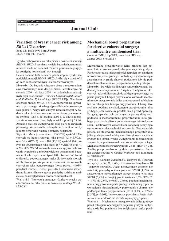 NOWOTWORY Journal of Oncology • 2008 • volume 58 Number 2 • 201–206 Journal Club Variation of breast cancer risk among BRCA1/2 carriers Begg CB, Haile RW, Borg Å i wsp. JAMA 2008; 299: 194-201 Ryzyko zachorowania na raka piersi u nosicielek mutacji BRCA1 i BRCA2 oceniano w wielu badaniach, natomiast niewiele wiadomo na temat różnic w poziomie tego ryzyka pomiędzy nosicielkami ww. mutacji. Celem badania była ocena, w jakim stopniu ryzyko dla nosicielek mutacji BRCA1 i BRCA2 różni się w zależności od cech zaobserwowanych i niezaobserwowanych. M e t o d y. Do badania włączono chore z rozpoznaniem asynchronicznego raka drugiej piersi, uczestniczące od stycznia 2000 r. do lipca 2004 r. w badaniach populacyjnych typu case-control (Women’s Environmental Cancer and Radiation Epidemiology [WECARE]). Oceniono obecność mutacji BRCA1 i BRCA2 u chorych na uprzednio rozpoznanego raka drugiej piersi lub jednostronnego raka piersi. U wszystkich chorych uczestniczących w badaniu raka piersi rozpoznano po raz pierwszy w okresie od stycznia 1985 r. do grudnia 2000 r. W chwili rozpoznania nowotworu chore były w wieku poniżej 55 lat. Zbadano częstość występowania raka piersi u krewnych pierwszego stopnia osób badanych oraz oceniono cechy kliniczne chorych i różnice pomiędzy rodzinami. W y n i k i. Mutacje znaleziono u 73 (5,2%) spośród 1.394 chorych na jednostronnego raka piersi (42 w BRCA1 oraz 31 w BRCA2) oraz u 108 (15,3%) spośród 704 chorych na obustronnego raka piersi (67 w BRCA1 oraz 41 w BRCA2). Wśród krewnych nosicielek ryzyko zachorowania wiązało się z młodym wiekiem uczestniczek badania w chwili rozpoznania (p=0,04). Stwierdzono trend w kierunku podwyższonego ryzyka dla krewnych chorych na obustronnego raka piersi, w porównaniu do krewnych chorych na raka jednostronnego (iloraz ryzyka 1,4 [95% przedział ufności, 0,8-2,4]; p=0,28). Dodatkowo stwierdzono istotne różnice w ryzyku pomiędzy rodzinami nosicielek, po uwzględnieniu zaobserwowanych cech. W n i o s k i. Występują znaczące różnice w ryzyku zachorowania na raka piersi u nosicielek mutacji BRCA1 i BRCA2. Mechanical bowel preparation for elective colorectal surgery: a multicentre randomised trial Contant CME, Hop WCJ, van’t Sant HP i wsp. Lancet 2007; 370: 2112-7 Mechaniczne przygotowanie jelita grubego jest powszechnie stosowane przed zabiegami na jelicie grubym. Porównano udział nieszczelności zespoleń po usunięciu nowotworu jelita grubego i odbytnicy z jednoczesnym zespoleniem w grupie chorych poddanych lub nie poddanych mechanicznemu przygotowaniu jelita grubego. M e t o d y. Do wieloośodkowego randomizowanego badania typu non-inferiority w 13 szpitalach włączono 1.431 chorych, zakwalifikowanych do zabiegu operacyjnego na jelicie grubym. Chorych przydzielono losowo do mechanicznego przygotowania jelita grubego przed zabiegiem lub do zabiegu bez takiego przygotowania. Chorzy, których nie poddano mechanicznemu przygotowaniu jelita grubego, jedli normalny posiłek dzień przed operacją. Druga grupa chorych otrzymywała płynną dietę oraz poddano ją mechanicznemu przygotowaniu jelita grubego przy użyciu glikolu polietylenowego lub fosforanu sodu. Podstawowym wskaźnikiem końcowej oceny było występowanie nieszczelności zespolenia. Testowano hipotezę, że stosowanie mechanicznego przygotowania jelita grubego przed zabiegiem chirurgicznym na jelicie grubym nie obniża ryzyka występowania nieszczelności zespolenia, w porównaniu do niestosowania tego zabiegu. Mediana czasu obserwacji wyniosła 24 dni (IQR 17–34). Analizę przeprowadzono zgodnie z protokołem. Badanie zarejestrowano w ClinicalTrials.gov pod numerem NCT00288496. W y n i k i. Z analizy wyłączono 77 chorych: 46, u których nie wycięto jelita, 21, u których brakowało danych oraz 10 – z innych powodów. Udział nieszczelności zespoleń nie różnił się pomiędzy obiema grupami: 32/670 (4,8%) po zastosowaniu mechanicznego przygotowania jelita oraz 37/684 (5,4%) w drugiej grupie (różnica 0,6%, 95% CI − 1,7% do 2,9%, p=0,69). Chorzy poddani mechanicznemu przygotowaniu jelita grubego mieli mniej ropni po wystąpieniu nieszczelności, w porównaniu z chorymi nie poddanymi temu przygotowaniu (2/670 [0,3%] vs 17/684 [2,5%], p=0,001). Inne septyczne powikłania, fascia dehiscence i umieralność nie różniły się między grupami. W n i o s k i. Mechaniczne przygotowanie jelita grubego przed zabiegiem operacyjnym na jelicie grubym i odbytnicy może być pominięte bez zwiększenia ryzyka powikłań. 202 Darbepoetin alfa for the treatment of anemia in patients with active cancer not receiving chemotherapy or radiotherapy: results of a phase III, multicenter, randomized, double-blind, placebo-controlled study Smith RE, Aapro MS, Ludwig H i wsp. J Clin Oncol 2008; 26: 1040-50 C e l. Ocena skuteczności i bezpieczeństwa stosowania darbepoetyny alfa (DA) u chorych na aktywny nowotwór z niedokrwistością, nie otrzymujących ani nie przygotowywanych do chemioterapii lub mielosupresyjnej radioterapii. C h o r z y i m e t o d y. Chorych na aktywny nowotwór, u których nie podawano i nie planowano chemoterapii ani radioterapii, włączono do wieloośrodkowego, randomizowanego, z kontrolowanym placebo, badania klinicznego III fazy i przydzielono losowo do placebo lub DA w dawce 6,75 μg/kg co 4 tygodnie (Q4W), podawanych do 16 tygodni, z 2-letnim czasem obserwacji. Chorzy, którzy ukończyli 16 tygodni leczenia, mogli otrzymać dodatkowe 16 tygodni takiego samego leczenia. Głównym punktem oceny końcowej była liczba przetoczeń krwi w tygodniach 5.-17. Dodatkowo oceniano liczbę niepożądanych zdarzeń oraz czas przeżycia. W y n i k i. W grupie otrzymującej DA w tygodniach 5.-17. wykonano mniej przetoczeń krwi, w porównaniu do grupy otrzymującej placebo, ale różnica ta nie była znamienna statystycznie. Stosowanie DA wiązało się ze zwiększoną liczbą zdarzeń sercowo-naczyniowych i zakrzepo