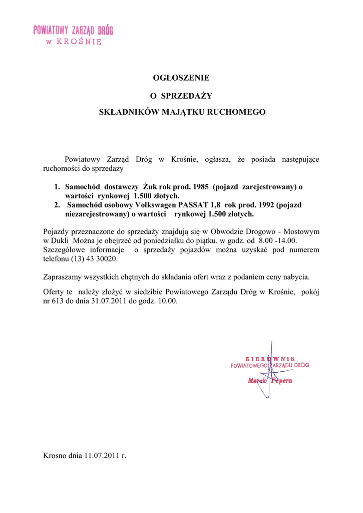 OGŁOSZENIE O SPRZEDAŻY SKŁADNIKÓW MAJĄTKU RUCHOMEGO Powiatowy Zarząd Dróg w Krośnie, ogłasza, że posiada następujące ruchomości do sprzedaży 1. Samochód dostawczy Żuk rok prod. 1985 (pojazd zarejestrowany) o wartości rynkowej 1.500 złotych. 2. Samochód osobowy Volkswagen PASSAT 1,8 rok prod. 1992 (pojazd niezarejestrowany) o wartości rynkowej 1.500 złotych. Pojazdy przeznaczone do sprzedaży znajdują się w Obwodzie Drogowo - Mostowym w Dukli Można je obejrzeć od poniedziałku do piątku. w godz. od 8.00 -14.00. Szczegółowe informacje o sprzedaży pojazdów można uzyskać pod numerem telefonu (13) 43 30020. Zapraszamy wszystkich chętnych do składania ofert wraz z podaniem ceny nabycia. Oferty te należy złożyć w siedzibie Powiatowego Zarządu Dróg w Krośnie, pokój nr 613 do dnia 31.07.2011 do godz. 10.00. Krosno dnia 11.07.2011 r.
