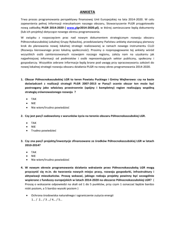 ANKIETA Trwa proces programowania perspektywy finansowej Unii Europejskiej na lata 2014-2020. W celu zapewnienia pełnej informacji mieszkańcom naszego obszaru, Stowarzyszenie PLGR przygotowało nową zakładkę PLGR 2014-2020 ( www.plgr2014-2020.pl), w której zamieszczane będą dokumenty (lub ich projekty) dotyczące nowego okresu programowania. W związku z rozpoczęciem prac nad nowym dokumentem strategicznym rozwoju obszaru Północnokaszubskiej Lokalnej Grupy Rybackiej, przedstawiamy Państwu ankietę stanowiącą pierwszy krok do planowania nowej lokalnej strategii realizowanej w ramach nowego instrumentu CLLD (Rozwoju kierowanego przez lokalną społeczność). Prosimy o rozpropagowanie tej ankiety wśród wszystkich osób zainteresowanych rozwojem naszego regionu, zależy nam na uzyskaniu jak najpełniejszej informacji od podmiotów i osób reprezentujących sektor publiczny, społeczny i gospodarczy. Wszystkie zebrane informacje będą brane pod uwagę przy opracowywaniu założeń do nowej lokalnej strategii rozwoju obszaru działania PLGR na nowy okres programowania 2014-2020. 1. Obszar Północnokaszubskiej LGR to teren Powiatu Puckiego i Gminy Wejherowo: czy na bazie doświadczeń z realizacji strategii PLGR 2007-2013 w Pana/i ocenie obszar ten może być postrzegany jako właściwy przestrzennie (spójny i kompletny) region realizujący wspólną strategię zrównoważonego rozwoju ? TAK NIE Nie wiem/trudno powiedzieć 2. Czy jest pan/i zadowolony z warunków życia na terenie obszaru Północnokaszubskiej LGR. TAK NIE Trudno powiedzieć 3. Czy zna pan/i projekty/inwestycje sfinansowane ze środków Północnokaszubskiej LGR w latach 2010-2014? TAK NIE Nie wiem/trudno powiedzieć 4. W nowym okresie programowania działania wdrażanie przez Północnokaszubską LGR mogą przyczynić się m.in. do tworzenia nowych miejsc pracy, rozwoju gospodarki, infrastruktury i aktywizacji mieszkańców. Proszę wskazać, jakiego rodzaju projekty powinny być szczególnie wspierane z funduszy europejskich w latach 2014-2020 na obszarze Północnokaszubskiej LGR? ( Proszę o wskazanie odpowiedzi na skali od 1 do 5 punktów, przy czym 1 oznaczać będzie bardzo niski poziom, a 5 bardzo wysoki poziom ) Ochrona środowiska naturalnego i ograniczenie zużycia energii 1… / 2… / 3 …/ 4… / 5… Turystyka - wsparcie na rzecz wzmocnienia usług turystycznych - wykorzystanie walorów kulturalnych dla rozwoju turystyki i rekreacji, w tym rozwój i wyposażenie infrastruktury 1… / 2… / 3 …/ 4… / 5… Tworzenie miejsc pracy poza sektorem rolnictwa i rybołówstwem oraz wspieranie dywersyfikacji działalności w w/w sektorach 1… / 2… / 3 …/ 4… / 5… Rozwój przedsiębiorczości i przedsiębiorczości społecznej (działalności, której zyski w założeniu są reinwestowane w cele społeczne lub we wspólnotę, a nie w celu maksymalizacji zysku tego przedsiębiorstwa ) 1… / 2… / 3 …/ 4… / 5… Ochrona, promocja i rozwój dziedzictwa kulturowego obszaru, w tym inwestycje w poprawę infrastruktury związanej z dziedzictwem kulturowym. 1… / 2… / 3 …/ 4… / 5… Wspieranie i promowanie aktywności lokalnej mieszkańców 1… / 2… / 3 …/ 4… / 5… Wspieranie uczenia się przez całe życie, w tym przystosowanie pracowników, przedsiębiorstw i przedsiębiorców do zmian. 1… / 2… / 3 …/ 4… / 5… Badanie i rozwój, transfer wiedzy i innowacji oraz doradztwo dla firm 1… / 2… / 3 …/ 4… / 5… Inwestycje w poprawę infrastruktury społecznej związanej z poprawa jakości życia dzieci, młodzieży, osób starszych i niepełnosprawnych 1… / 2… / 3 …/ 4… / 5… Działania ukierunkowane na poprawę dostępności i jakości edukacji - edukacja ogólna i przedszkolna 1… / 2… / 3 …/ 4… / 5… Działania ukierunkowane na większy dostęp do zatrudnienia dla osób poszukujących pracy i osób biernych zawodowo poprzez lokalne inicjatywy na rzecz zatrudnienia oraz wspieranie mobilności pracowników, programy aktywizacji społeczno-zawodowej osób biernych zawodowo oraz wykluczonych i zagrożonych wykluczeniem społecznym 1… / 2… / 3 …/ 4… / 5… Kompleksowe działania i inwestycji o charakterze ponadlokalnym i regionalnym dotyczące np. budowy lub modernizacji infrastruktury żeglarskiej, rozwoju infrastruktury rekreacyjnej oraz działań tworzących charakter uzdrowiskowy na obszarze. 1… / 2… / 3 …/ 4… / 5… 5. Czy działania Północnokaszubskiej LGR w ramach aktualnie wdrażanej LSROR są skutecznym narzędziem rozwoju obszaru (odpowiedź wraz z uzasadnieniem)? TAK ……………………………………………………………………………………………………………………………………………………… NIE ……………………………………………………………………………………………………………………………………………………… Nie wiem/trudno powiedzieć 6. Kto Pana/i zdaniem ma największy wpływ na to, co się dzieje w miejscowości w której Pan/i mieszka i jak się ona rozwija: sami mieszkańcy sołtysi / radni lokalni przedsiębiorcy parafia / ksiądz wójt / urząd gminy stowarzyszenia / koło gospodyń / OSP 7. Czy nowa Lokalna Strategia Północnokaszubskiej LGR powinna: być tylko ogólnym planem działania – koncepcją wyznaczającą ogólne kierunki pożądanych zmian, zawierać konkretne rozwiązania problemów wynikających z analizy SWOT, w tym listę konkretnych projektów? nie wiem 8. Jaki rodzaj wsparcia Pana/i zdaniem oczekują mieszkańcy przy ubieganiu się o środki UE indywidualne doradztwo specjalistyczne szkolenia tematyczne ( finanse, prawo i inne ) pomoc w wypełnianiu wniosku o dofinansowanie i załączników koordynacja/liderowanie w gramach grupy podobnych projektów inne ( jakie ) …………………………..…… 9. Jakie projekty chciałby Pan/Pani zrealizować w przyszłym okresie programowania ze środ