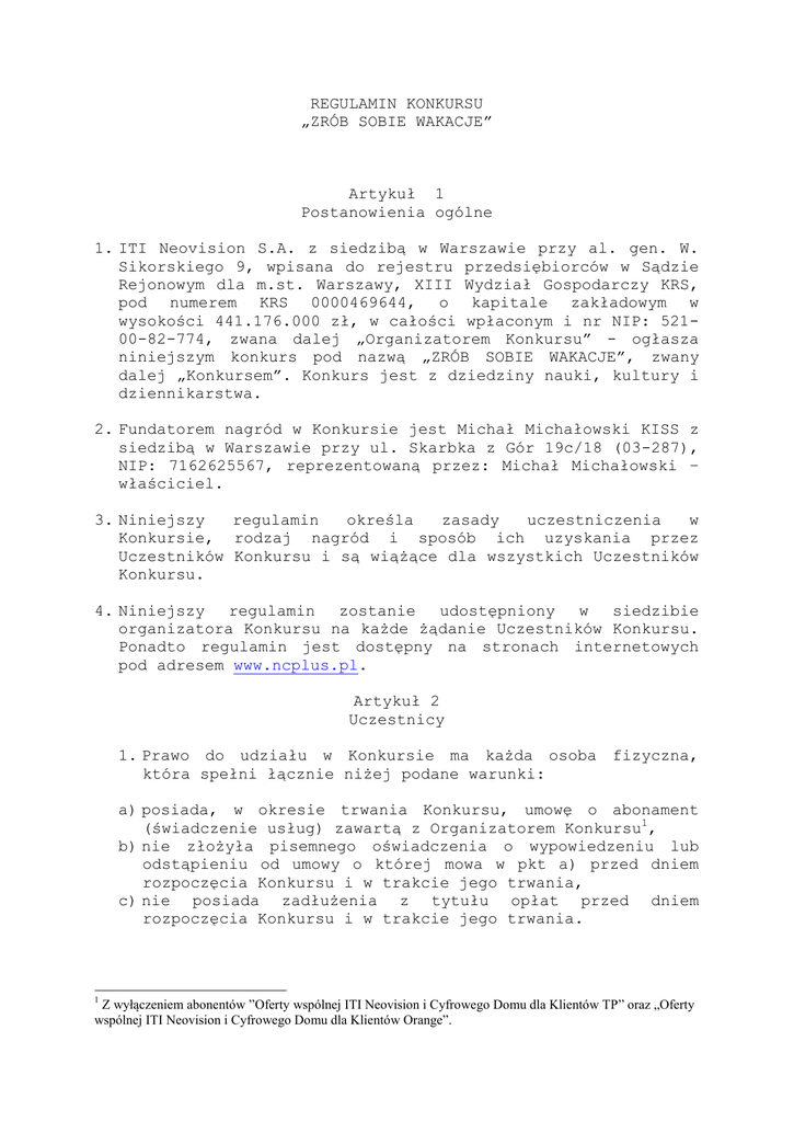 REGULAMIN KONKURSU „ZRÓB SOBIE WAKACJE” Artykuł 1 Postanowienia ogólne 1. ITI Neovision S.A. z siedzibą w Warszawie przy al. gen. W. Sikorskiego 9, wpisana do rejestru przedsiębiorców w Sądzie Rejonowym dla m.st. Warszawy, XIII Wydział Gospodarczy KRS, pod numerem KRS 0000469644, o kapitale zakładowym w wysokości 441.176.000 zł, w całości wpłaconym i nr NIP: 52100-82-774, zwana dalej „Organizatorem Konkursu” - ogłasza niniejszym konkurs pod nazwą „ZRÓB SOBIE WAKACJE”, zwany dalej „Konkursem”. Konkurs jest z dziedziny nauki, kultury i dziennikarstwa. 2. Fundatorem nagród w Konkursie jest Michał Michałowski KISS z siedzibą w Warszawie przy ul. Skarbka z Gór 19c/18 (03-287), NIP: 7162625567, reprezentowaną przez: Michał Michałowski – właściciel. 3. Niniejszy regulamin określa zasady uczestniczenia w Konkursie, rodzaj nagród i sposób ich uzyskania przez Uczestników Konkursu i są wiążące dla wszystkich Uczestników Konkursu. 4. Niniejszy regulamin zostanie udostępniony w siedzibie organizatora Konkursu na każde żądanie Uczestników Konkursu. Ponadto regulamin jest dostępny na stronach internetowych pod adresem www.ncplus.pl. Artykuł 2 Uczestnicy 1. Prawo do udziału w Konkursie ma każda osoba fizyczna, która spełni łącznie niżej podane warunki: a) posiada, w okresie trwania Konkursu, umowę o abonament (świadczenie usług) zawartą z Organizatorem Konkursu1, b) nie złożyła pisemnego oświadczenia o wypowiedzeniu lub odstąpieniu od umowy o której mowa w pkt a) przed dniem rozpoczęcia Konkursu i w trakcie jego trwania, c) nie posiada zadłużenia z tytułu opłat przed dniem rozpoczęcia Konkursu i w trakcie jego trwania. 1 Z wyłączeniem abonentów ”Oferty wspólnej ITI Neovision i Cyfrowego Domu dla Klientów TP” oraz „Oferty wspólnej ITI Neovision i Cyfrowego Domu dla Klientów Orange”. 2. Konkurs nie dotyczy Abonentów ITI Neovision S.A. którzy uiszczają opłaty abonamentowe w formie pre-paid. 3. W Konkursie nie mogą brać udziału pracownicy i współpracownicy ITI Neovision S.A., Michał Michałowski KISS oraz Studio K Przemysław Andrzejak. Artykuł 3 Zasady Konkursu 1. Osoby chcące wziąć udział w Konkursie i spełniające warunki określone w art. 2, zwane dalej „Uczestnikami Konkursu” muszą w terminie od 22 grudnia 2014r. do 11 stycznia 2015r. skorzystać z aplikacji konkursowej w serwisie www.ncplus.pl i: a) odpowiedzieć poprawnie na 5 pytań zamkniętych z zakresu nauki, związanych z kanałem H2 lub 5 pytań zamkniętych z zakresu nauki, związanych z kanałem Lifetime. Aby odpowiedzieć na pytania, należy zaznaczyć przy każdym pytaniu jedną z trzech odpowiedzi do wyboru i przejść dalej; b) odpowiedzieć na pytanie otwarte z zakresu kultury i nauki; c) wypełnić formularz danych po udzieleniu odpowiedzi na wszystkie pytania, o których mowa w ust. 1 lit. a) i b) oraz nacisnąć przycisk AKCEPTUJĘ. W formularzu należy wpisać: – adres e-mail – imię i nazwisko (podane w umowie z ITI Neovision S.A.) – numer PESEL (podany na umowie z ITI Neovision S.A.) Uczestnik, który poda w formularzu powyższe dane i potwierdzi naciskając przycisk AKCEPTUJĘ, akceptuje postanowienia Regulaminu, w tym również dotyczące sposobu przetwarzania danych osobowych określone w art. 6 Regulaminu; d) odpowiedzieć na e-mail, zgodnie z zawartą w nim instrukcją, wysłany przez Organizatora Konkursu po wypełnieniu przez Uczestnika formularza, na podany w formularzu adres e-mail Uczestnika. 2. Udział w Konkursie jest całkowicie dobrowolny. 3. Każdy Uczestnik Konkursu ma prawo do wzięcia udziału w Konkursie tylko jeden raz. Masowe wpisy (czyli stosowanie jakiejkolwiek technologii umożliwiającej jednoczesne wpisy) nie są dozwolone. 4. Organizator Konkursu zastrzega sobie prawo do wykluczenia z udziału w Konkursie tych osób, które nie przestrzegają postanowień Regulaminu. 5. Poprzez przesłanie odpowiedzi na pytanie otwarte w ramach Konkursu w sposób określony w niniejszym Regulaminie, Uczestnik Konkursu oświadcza, że wysłana przez niego odpowiedź na pytanie otwarte nie narusza przepisów prawa, ani prawem chronionych dóbr osób trzecich, zaś Uczestnik Konkursu jest w pełni uprawniony do zgłoszenia odpowiedzi na pytanie otwarte do Konkursu. Artykuł 4 Nagrody 1. Spośród wszystkich Uczestników Konkursu, którzy łącznie spełnili następujące warunki: a) prawidłowo odpowiedzieli na pytania określone w art. 3 ust. 1 lit. a), b) udzielili odpowiedzi na pytanie otwarte, określone w art. 3 ust. 1 lit. b), c) wypełnili formularz, i d) odpowiedzieli na e-mail, zgodnie z procedurą określoną w art. 3 ust. 1 lit. d), komisja konkursowa, w skład której wchodzą przedstawiciele Organizatora Konkursu i Fundatora wybierze Uczestników („Laureatów Konkursu”), którzy napisali najlepszą – zdaniem komisji konkursowej – odpowiedź na pytanie otwarte. Komisja będzie oceniać pomysłowość, uzasadnienie pod kątem aktualnej wiedzy naukowej, a także poprawność dziennikarską wypowiedzi, w tym sztukę argumentacji i poprawność językową. Decyzja komisji konkursowej co do wyłonienia Laureatów Konkursu jest ostateczna. 2. Laureaci Konkursu otrzymają Nagrody, w zależności przyznanego im przez komisję konkursową miejsca: od a) 1 miejsce: (Nagroda Główna): voucher na wycieczkę o wartości 6 000 PLN brutto, do wykorzystania w biurze podróży ITAKA Laureat Nagrody Głównej otrzyma dodatkowo nagrodę pieniężną w wysokości należnego podatku dochodowego od osób fizycznych, która przeznaczona zostanie na zapłatę tego podatku i nie zostanie wypłacona Laureatowi Konkursu w formie gotówkowej. Zasady wykorzystania vouchera stanowi Załącznik nr. 1 b) 2-3 miejsce: voucher do sklepu Sephora o wartości 500 zł c) 4-33 miejsce: zestawy scyzoryków błyszczyk i szczotka Lifetime. USB H2 + zestawy 3. Wyniki Konkursu opublikowane zostaną do dnia 26.01.2015 na str