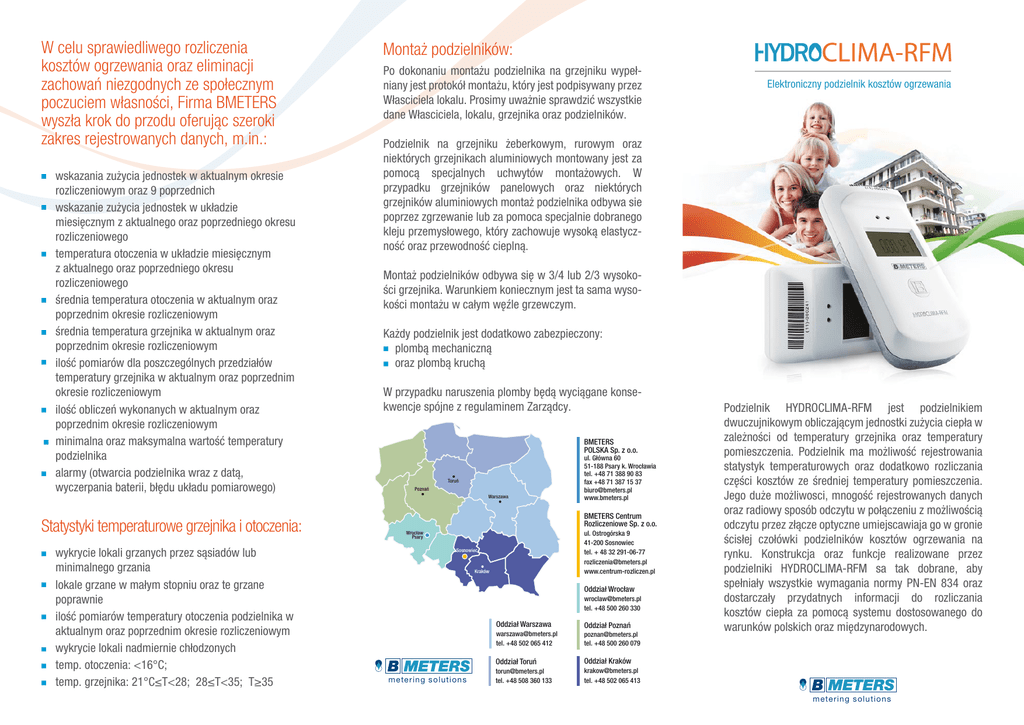 W celu sprawiedliwego rozliczenia kosztów ogrzewania oraz eliminacji zachowań niezgodnych ze społecznym poczuciem własności, Firma BMETERS wyszła krok do przodu oferując szeroki zakres rejestrowanych danych, m.in.: wskazania zużycia jednostek w aktualnym okresie rozliczeniowym oraz 9 poprzednich wskazanie zużycia jednostek w układzie miesięcznym z aktualnego oraz poprzedniego okresu rozliczeniowego temperatura otoczenia w układzie miesięcznym z aktualnego oraz poprzedniego okresu rozliczeniowego średnia temperatura otoczenia w aktualnym oraz poprzednim okresie rozliczeniowym średnia temperatura grzejnika w aktualnym oraz poprzednim okresie rozliczeniowym ilość pomiarów dla poszczególnych przedziałów temperatury grzejnika w aktualnym oraz poprzednim okresie rozliczeniowym ilość obliczeń wykonanych w aktualnym oraz poprzednim okresie rozliczeniowym minimalna oraz maksymalna wartość temperatury podzielnika alarmy (otwarcia podzielnika wraz z datą, wyczerpania baterii, błędu układu pomiarowego) Statystyki temperaturowe grzejnika i otoczenia: wykrycie lokali grzanych przez sąsiadów lub minimalnego grzania lokale grzane w małym stopniu oraz te grzane poprawnie ilość pomiarów temperatury otoczenia podzielnika w aktualnym oraz poprzednim okresie rozliczeniowym wykrycie lokali nadmiernie chłodzonych temp. otoczenia: <16°C; temp. grzejnika: 21°C≤T<28; 28≤T<35; T≥35 Montaż podzielników: Po dokonaniu montażu podzielnika na grzejniku wypełniany jest protokół montażu, który jest podpisywany przez Własciciela lokalu. Prosimy uważnie sprawdzić wszystkie dane Własciciela, lokalu, grzejnika oraz podzielników. Elektroniczny podzielnik kosztów ogrzewania Podzielnik na grzejniku żeberkowym, rurowym oraz niektórych grzejnikach aluminiowych montowany jest za pomocą specjalnych uchwytów montażowych. W przypadku grzejników panelowych oraz niektórych grzejników aluminiowych montaż podzielnika odbywa sie poprzez zgrzewanie lub za pomoca specjalnie dobranego kleju przemysłowego, który zachowuje wysoką elastyczność oraz przewodność cieplną. Montaż podzielników odbywa się w 3/4 lub 2/3 wysokości grzejnika. Warunkiem koniecznym jest ta sama wysokości montażu w całym węźle grzewczym. Każdy podzielnik jest dodatkowo zabezpieczony: plombą mechaniczną oraz plombą kruchą W przypadku naruszenia plomby będą wyciągane konsekwencje spójne z regulaminem Zarządcy. BMETERS POLSKA Sp. z o.o. Toruń Poznań Warszawa ul. Główna 60 51-188 Psary k. Wrocławia tel. +48 71 388 90 83 fax +48 71 387 15 37 [email protected] www.bmeters.pl BMETERS Centrum Rozliczeniowe Sp. z o.o. ul. Ostrogórska 9 41-200 Sosnowiec tel. + 48 32 291-06-77 [email protected] www.centrum-rozliczen.pl Wrocław Psary Sosnowiec Kraków Oddział Wrocław [email protected] tel. +48 500 260 330 Oddział Warszawa [email protected] tel. +48 502 065 412 mete ring solutions Oddział Poznań [email protected] tel. +48 500 260 079 Oddział Toruń Oddział Kraków [email protected] tel. +48 508 360 133 [email protected] tel. +48 502 065 413 Podzielnik HYDROCLIMA-RFM jest podzielnikiem dwuczujnikowym obliczającym jednostki zużycia ciepła w zależności od temperatury grzejnika oraz temperatury pomieszczenia. Podzielnik ma możliwość rejestrowania statystyk temperaturowych oraz dodatkowo rozliczania części kosztów ze średniej temperatury pomieszczenia. Jego duże możliwosci, mnogość rejestrowanych danych oraz radiowy sposób odczytu w połączeniu z możliwością odczytu przez złącze optyczne umiejscawiaja go w gronie ścisłej czołówki podzielników kosztów ogrzewania na rynku. Konstrukcja oraz funkcje realizowane przez podzielniki HYDROCLIMA-RFM sa tak dobrane, aby spełniały wszystkie wymagania normy PN-EN 834 oraz dostarczały przydatnych informacji do rozliczania kosztów ciepła za pomocą systemu dostosowanego do warunków polskich oraz międzynarodowych. mete ring solutions Wskazania podzielnika W celu poprawnego ogrzewania lokalu a przy tym oszczędnego: Elektroniczny podzielnik kosztów ogrzewania 18oC Ogólny opis funkcjonowania podzielnika kosztów ogrzewania Podzielnik kosztów ciepła jest urządzeniem do podziału kosztów ogrzewania, które zostało zużyte przez wszystkich lokatorów z budynku. Każdy budynek musi być ogrzany. Należy mieć świadomość, iż w budynkach wielolokalowych mieszkania nie są odseparowanymi termicznie bryłami. Istnieje przenikalność cieplna pomiędzy mieszkaniami, a pomieszczenia techniczne oraz części wspólne są pośrednio ogrzewane przez lokatorów sąsiadujących. Jednostki widniejące na podzielniku kosztów ogrzewania nie są zależne od mocy grzejnika, ten element jest uwzględniany przy rozliczeniu kosztów ogrzewania w systemie. Koszt jednostki nie jest taki sam co sezon, jest uzależniony od ogólnego zużycia (naliczenia jednostek) całego węzła oraz od kosztu GJ mocy układu grzewczego. Wszystkie powyższe czynniki - sąsiedztwo z lokalami mieszkalnymi czy z nieogrzewanymi częściami wspólnymi, jak i kondygnacja, na której znajduje się lokal oraz liczba ścian szczytowych jest brana pod uwagę przy ustalaniu współczynnika lokalu, a finalnie ma wpływ na rozliczenie kosztów ciepła. Rozsądne zarządzanie ciepłem w lokalach W przypadku lokali ogrzewanych centralnie należy rozsądnie korzystać z ogrzewania poprzez sterowanie głowicą termostatyczną. Zawór z głowicą posiada skalę w stopniach Celsjusza lub w innych liczbach, np. 0–5. Zawór kontroluje dopływ czynnika grzewczego wyłącznie do grzejnika, natomiast rury instalacji C.O. (piony) mogą pozostać gorące i nagrzewać pomieszczenie w sposób niekontrolowany. Rozliczenie uzupełnione o konfort cieplny pomieszczeń rozwiązuje ten problem pozwalając na sprawiedliwy podział kosztów. Nie należy wychładzać lokalu poniżej 18°C ze względu na długie ponowne ogrzanie do temperatury pokojowej (20-21°C). Podczas wietrzen