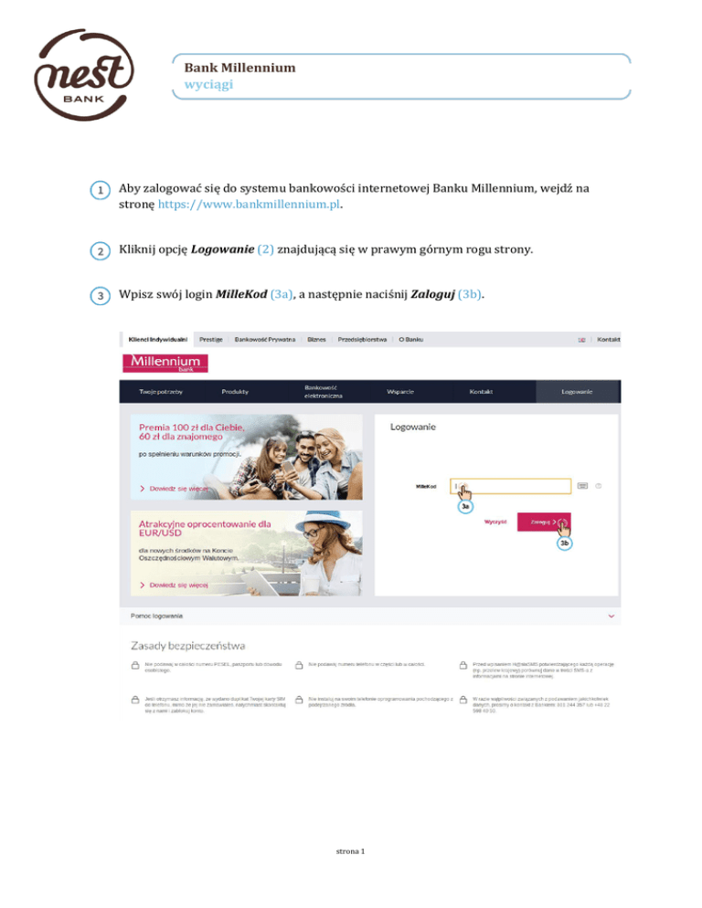 Bank Millennium wyciągi D Aby zalogować się do systemu bankowości internetowej Banku Millennium, wejdź na stronę https://www.bankmillennium.pl. Kliknij opcję Logowanie (2) znajdującą się w prawym górnym rogu strony. Wpisz swój login MilleKod (3a), a następnie naciśnij Zaloguj (3b). strona 1 Wpisz hasło (4a), wybierz rodzaj identyfikatora (4b), a następnie uzupełnij brakujące znaki w jego numerze (4c). Po uzupełnieniu danych wybierz Zaloguj (4d). Z menu dostępnego w górnej części strony wybierz opcję Konta (5a), a następnie z rozwiniętego menu wybierz Historia i szczegóły (5b). strona 2 Wybierz odpowiedni rachunek i przejdź do zakładki Historia (6) dostępnej poniżej. Pod listą wyciągów, z prawej dolnej części strony, kliknij Lista wyciągów (7). strona 3 Z widocznej listy wyciągów wybierz potrzebny wyciąg, a następnie kliknij odpowiadający mu przycisk Pobierz (8) znajdujący się po prawej stronie. strona 4