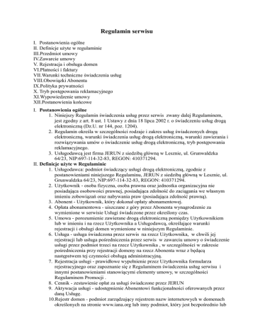 Regulamin serwisu I. Postanowienia ogólne II. Definicje użyte w regulaminie III.Przedmiot umowy IV.Zawarcie umowy V. Rejestracja i obsługa domen VI.Płatności i faktury VII.Warunki techniczne świadczenia usług VIII.Obowiązki Abonenta IX.Polityka prywatności X. Tryb postępowania reklamacyjnego XI.Wypowiedzenie umowy XII.Postanowienia końcowe I. Postanowienia ogólne 1. Niniejszy Regulamin świadczenia usług przez serwis zwany dalej Regulaminem, jest zgodny z art. 8 ust. 1 Ustawy z dnia 18 lipca 2002 r. o świadczeniu usług drogą elektroniczną (Dz.U. nr 144, poz. 1204). 2. Regulamin określa w szczególności rodzaje i zakres usług świadczonych drogą elektroniczną, warunki świadczenia usług drogą elektroniczną, warunki zawierania i rozwiązywania umów o świadczenie usług drogą elektroniczną, tryb postępowania reklamacyjnego. 3. Usługodawcą jest firma JERUN z siedzibą główną w Lesznie, ul. Grunwaldzka 64/23, NIP:697-114-32-83, REGON: 410371294. II. Definicje użyte w Regulaminie 1. Usługodawca: podmiot świadczący usługi drogą elektroniczną, zgodnie z postanowieniami niniejszego Regulaminu, JERUN z siedzibą główną w Lesznie, ul. Grunwaldzka 64/23, NIP:697-114-32-83, REGON: 410371294. 2. Użytkownik - osoba fizyczna, osoba prawna oraz jednostka organizacyjna nie posiadająca osobowości prawnej, posiadająca zdolność do zaciągania we własnym imieniu zobowiązań oraz nabywania praw (posiadająca zdolność prawną). 3. Abonent - Użytkownik, który dokonał opłaty abonamentowej. 4. Opłata abonamentowa - uiszczane z góry przez Abonenta wynagrodzenie za wymienione w serwisie Usługi świadczone przez określony czas. 5. Umowa - porozumienie zawierane drogą elektroniczną pomiędzy Użytkownikiem lub w imieniu i na rzecz Użytkownika a Usługodawcą, określające warunki rejestracji i obsługi domen wymienione w niniejszym Regulaminie. 6. Usługa - usługa świadczona przez serwis na rzecz Użytkownika, w chwili jej rejestracji lub usługa pośredniczenia przez serwis w zawarciu umowy o świadczenie usługi przez podmiot trzeci na rzecz Użytkownika , w szczególności w zakresie pośredniczenia przy rejestracji domeny na rzecz Abonenta wraz z będącą następstwem tej czynności obsługą administracyjną. 7. Rejestracja usługi - prawidłowe wypełnienie przez Użytkownika formularza rejestracyjnego oraz zapoznanie się z Regulaminem świadczenia usług serwisu i innymi postanowieniami stanowiącymi elementy umowy, w szczególności Regulaminem Promocji . 8. Cennik - zestawienie opłat za usługi świadczone przez JERUN 9. Aktywacja usługi - udostępnienie Abonentowi funkcjonalności oferowanych przez daną Usługę. 10.Rejestr domen - podmiot zarządzający rejestrem nazw internetowych w domenach określonych na stronie www.iana.org lub inny podmiot, który jest bezpośrednio lub pośrednio uprawniony do rejestracji i utrzymania domeny. 11.`Domeny globalne` - domeny rejestrowane przez Usługodawcę u Partnera Directi, tj. domeny stricte globalne oraz domeny narodowe spoza Europy. III.Przedmiot umowy 1. Świadczenie usługi drogą elektroniczną to wykonanie usługi bez jednoczesnej obecności stron (na odległość) poprzez przekaz danych na indywidualne żądanie Abonenta, która obejmuje przechowywanie i przetwarzanie danych Abonenta, rejestrację i obsługę domen internetowych. IV.Zawarcie umowy 1. Zawarcie Umowy o świadczenie Usługi jest poprzedzone Rejestracją usługi w serwisie. 2. Użytkownik rejestrujący Usługę oświadcza, iż wyraża zgodę na zawarcie Umowy o świadczenie Usługi. 3. Podmiot, który dokonuje wypełnienia formularza rejestracyjnego w imieniu Użytkownika, oświadcza, iż uzyskał bezpośrednią i udokumentowaną zgodę Użytkownika na zawarcie w jego imieniu i na jego rzecz Umowy o świadczenie Usługi. 4. Rejestracja usługi w serwisie jest równoznaczna z oświadczeniem Użytkownika, że: a. zapoznał się z treścią dokumentów stanowiących podstawę zawarcia Umowy i akceptuje ich treść; b. wyraża zgodę na zawarcie umowy o świadczenie usługi drogą elektroniczną; c. dane Użytkownika podane Usługodawcy są prawidłowe i nie powodują naruszenia osób trzecich oraz przepisów prawa; d. wyraża zgodę na otrzymywanie na adres e-mail wskazany w procesie rejestracji informacji niezbędnych do prawidłowej realizacji Usługi; e. w przypadku wyboru nazwy/nazw domen - udziela Usługodawcy zgody do dokonania w jego imieniu i na jego rzecz wszelkich czynności zmierzających do zarejestrowania domeny, w tym do reprezentowania go przed Rejestrem oraz udziela zgody Usługodawcy do przekazania Rejestrowi domeny swoich danych, w tym danych osobowych, w zakresie zgodnym z wymogami Rejestru f. w przypadku rejestracji domeny polskiej - udziela Usługodawcy, z którym NASK zawarła Porozumienie w sprawie współpracy dotyczącej nazw domen internetowych, zgody na wyłączne wykonywanie usług dotyczących funkcjonalności domeny i związanych z nią czynności, w szczególności na dokonywanie wobec NASK wszelkich czynności, w tym czynności prawnych, dotyczących rejestracji lub utrzymywania nazwy domeny lub opcji na nazwę domeny lub testu nazwy domeny, a w tym danych dotyczących Abonenta/Użytkownika, tj. zgody na rejestrację nazwy domeny, zmianę Abonenta nazwy domeny, usunięcie nazwy domeny lub opcji lub testu, zmianę danych dotyczących urządzeń wykorzystywanych dla nazwy domeny oraz świadczenie przez NASK przetwarzania i zarządzania danymi Abonenta/Użytkownika, służącymi do korzystania z utrzymywania nazwy domeny lub opcji na nazwę domeny lub testu nazwy domeny na rzecz Usługodawcy. V. Z chwilą zawarcia umowy pośrednictwa w rejestracji domeny Użytkownik wyraża zgodę na przestrzeganie regulaminu Rejestru który zarządza rejestrowaną domeną. VI.Usługodawca zastrzega sobie prawo do żądania przedstawienia przez Użytkownika dodatkowych dokumentów przed zawarciem umowy pośrednictw