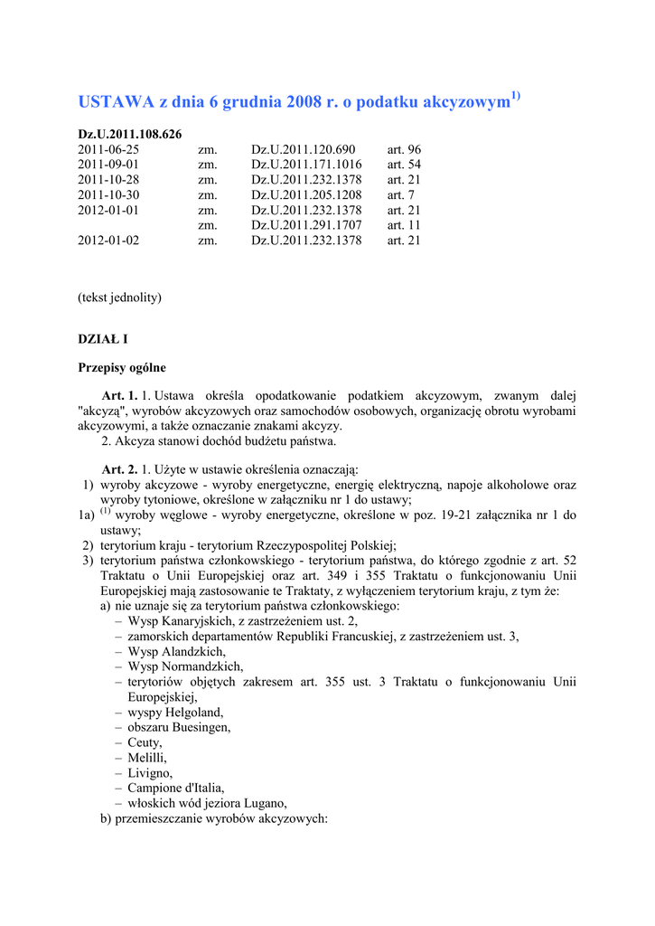 USTAWA z dnia 6 grudnia 2008 r. o podatku akcyzowym1) Dz.U.2011.108.626 2011-06-25 2011-09-01 2011-10-28 2011-10-30 2012-01-01 2012-01-02 zm. zm. zm. zm. zm. zm. zm. Dz.U.2011.120.690 Dz.U.2011.171.1016 Dz.U.2011.232.1378 Dz.U.2011.205.1208 Dz.U.2011.232.1378 Dz.U.2011.291.1707 Dz.U.2011.232.1378 art. 96 art. 54 art. 21 art. 7 art. 21 art. 11 art. 21 (tekst jednolity) DZIAŁ I Przepisy ogólne Art. 1. 1. Ustawa określa opodatkowanie podatkiem akcyzowym, zwanym dalej "akcyzą", wyrobów akcyzowych oraz samochodów osobowych, organizację obrotu wyrobami akcyzowymi, a także oznaczanie znakami akcyzy. 2. Akcyza stanowi dochód budżetu państwa. 1) 1a) 2) 3) Art. 2. 1. Użyte w ustawie określenia oznaczają: wyroby akcyzowe - wyroby energetyczne, energię elektryczną, napoje alkoholowe oraz wyroby tytoniowe, określone w załączniku nr 1 do ustawy; (1) wyroby węglowe - wyroby energetyczne, określone w poz. 19-21 załącznika nr 1 do ustawy; terytorium kraju - terytorium Rzeczypospolitej Polskiej; terytorium państwa członkowskiego - terytorium państwa, do którego zgodnie z art. 52 Traktatu o Unii Europejskiej oraz art. 349 i 355 Traktatu o funkcjonowaniu Unii Europejskiej mają zastosowanie te Traktaty, z wyłączeniem terytorium kraju, z tym że: a) nie uznaje się za terytorium państwa członkowskiego: – Wysp Kanaryjskich, z zastrzeżeniem ust. 2, – zamorskich departamentów Republiki Francuskiej, z zastrzeżeniem ust. 3, – Wysp Alandzkich, – Wysp Normandzkich, – terytoriów objętych zakresem art. 355 ust. 3 Traktatu o funkcjonowaniu Unii Europejskiej, – wyspy Helgoland, – obszaru Buesingen, – Ceuty, – Melilli, – Livigno, – Campione d'Italia, – włoskich wód jeziora Lugano, b) przemieszczanie wyrobów akcyzowych: 4) 5) 6) 7) 8) 9) 10) 11) 12) 13) – mające początek w Księstwie Monako lub z przeznaczeniem dla Księstwa Monako uznaje się za przemieszczanie mające początek w Republice Francuskiej lub z przeznaczeniem dla Republiki Francuskiej, – mające początek w Jungholz i Mittelberg (Kleines Walsertal) lub z przeznaczeniem dla Jungholz i Mittelberg (Kleines Walsertal) uznaje się za przemieszczanie mające początek w Republice Federalnej Niemiec lub z przeznaczeniem dla Republiki Federalnej Niemiec, – mające początek na wyspie Man lub z przeznaczeniem dla wyspy Man uznaje się za przemieszczanie mające początek w Zjednoczonym Królestwie Wielkiej Brytanii i Irlandii Północnej lub z przeznaczeniem dla Zjednoczonego Królestwa Wielkiej Brytanii i Irlandii Północnej, – mające początek w San Marino lub z przeznaczeniem dla San Marino uznaje się za przemieszczanie mające początek w Republice Włoskiej lub z przeznaczeniem dla Republiki Włoskiej, – mające początek w suwerennych strefach Zjednoczonego Królestwa Wielkiej Brytanii i Irlandii Północnej Akrotiri i Dhekelia lub z przeznaczeniem dla suwerennych stref Zjednoczonego Królestwa Wielkiej Brytanii i Irlandii Północnej Akrotiri i Dhekelia uznaje się za przemieszczanie mające początek w Republice Cypryjskiej lub z przeznaczeniem dla Republiki Cypryjskiej; terytorium Unii Europejskiej - terytorium kraju oraz terytoria państw członkowskich; terytorium państwa trzeciego - terytorium inne niż terytorium Unii Europejskiej; eksport - wywóz wyrobów akcyzowych lub samochodów osobowych z terytorium kraju poza terytorium Unii Europejskiej potwierdzony przez urząd celny, który nadzoruje faktyczne wyprowadzenie tych wyrobów lub samochodów poza terytorium Unii Europejskiej; import - przywóz: a) samochodów osobowych z terytorium państwa trzeciego na terytorium kraju, b) wyrobów akcyzowych z terytorium państwa trzeciego na terytorium kraju: – jeżeli wyroby te z chwilą ich wprowadzenia na terytorium kraju nie zostają objęte zawieszającą procedurą celną, – jeżeli wyroby te zostały zwolnione z zawieszającej procedury celnej lub procedura ta została zakończona i powstał dług celny; dostawa wewnątrzwspólnotowa - przemieszczanie wyrobów akcyzowych lub samochodów osobowych z terytorium kraju na terytorium państwa członkowskiego; nabycie wewnątrzwspólnotowe - przemieszczenie wyrobów akcyzowych lub samochodów osobowych z terytorium państwa członkowskiego na terytorium kraju; skład podatkowy - miejsce, w którym określone wyroby akcyzowe są: produkowane, magazynowane, przeładowywane lub do którego wyroby te są wprowadzane, lub z którego są wyprowadzane - z zastosowaniem procedury zawieszenia poboru akcyzy; w przypadku składu podatkowego znajdującego się na terytorium kraju miejsce to jest określone w zezwoleniu wydanym przez właściwego naczelnika urzędu celnego; podmiot prowadzący skład podatkowy - podmiot, któremu wydano zezwolenie na prowadzenie składu podatkowego; procedura zawieszenia poboru akcyzy - procedurę stosowaną podczas produkcji, magazynowania, przeładowywania i przemieszczania wyrobów akcyzowych, w trakcie której, gdy są spełnione warunki określone w przepisach niniejszej ustawy i aktów wykonawczych wydanych na jej podstawie, z obowiązku podatkowego nie powstaje zobowiązanie podatkowe; zarejestrowany odbiorca - podmiot, któremu wydano zezwolenie na nabywanie wewnątrzwspólnotowe albo na jednorazowe nabycie wewnątrzwspólnotowe wyrobów akcyzowych wysłanych z zastosowaniem procedury zawieszenia poboru akcyzy, w ramach prowadzonej działalności gospodarczej, zwane dalej odpowiednio "zezwoleniem na nabywanie wyrobów akcyzowych jako zarejestrowany odbiorca" albo "zezwoleniem na jednorazowe nabycie wyrobów akcyzowych jako zarejestrowany odbiorca"; 14) (uchylony); 14a) zarejestrowany wysyłający - podmiot, któremu wydano zezwolenie na wysyłanie importowanych wyrobów akcyzowych z miejsca importu z zastosowaniem procedury zawieszenia poboru akcyzy, w ramach prowadzonej działalności gospodarczej; 15) e-AD - elektroniczny administracyjny dokument, na podstawie którego przemieszcza się wyroby akc