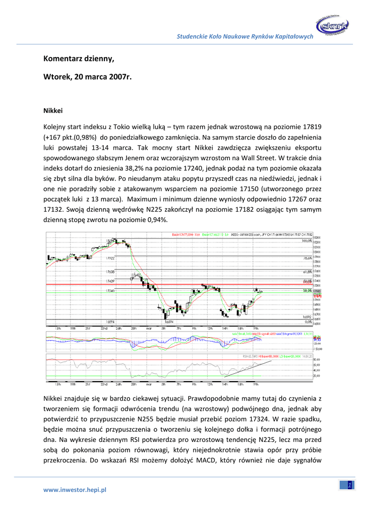 Studenckie Koło Naukowe Rynków Kapitałowych Komentarz dzienny, Wtorek, 20 marca 2007r. Nikkei Kolejny start indeksu z Tokio wielką luką – tym razem jednak wzrostową na poziomie 17819 (+167 pkt.(0,98%) do poniedziałkowego zamknięcia. Na samym starcie doszło do zapełnienia luki powstałej 13-14 marca. Tak mocny start Nikkei zawdzięcza zwiększeniu eksportu spowodowanego słabszym Jenem oraz wczorajszym wzrostom na Wall Street. W trakcie dnia indeks dotarł do zniesienia 38,2% na poziomie 17240, jednak podaż na tym poziomie okazała się zbyt silna dla byków. Po nieudanym ataku popytu przyszedł czas na niedźwiedzi, jednak i one nie poradziły sobie z atakowanym wsparciem na poziomie 17150 (utworzonego przez początek luki z 13 marca). Maximum i minimum dzienne wyniosły odpowiednio 17267 oraz 17132. Swoją dzienną wędrówkę N225 zakończył na poziomie 17182 osiągając tym samym dzienną stopę zwrotu na poziomie 0,94%. Nikkei znajduje się w bardzo ciekawej sytuacji. Prawdopodobnie mamy tutaj do czynienia z tworzeniem się formacji odwrócenia trendu (na wzrostowy) podwójnego dna, jednak aby potwierdzić to przypuszczenie N255 będzie musiał przebić poziom 17324. W razie spadku, będzie można snuć przypuszczenia o tworzeniu się kolejnego dołka i formacji potrójnego dna. Na wykresie dziennym RSI potwierdza pro wzrostową tendencję N225, lecz ma przed sobą do pokonania poziom równowagi, który niejednokrotnie stawia opór przy próbie przekroczenia. Do wskazań RSI możemy dołożyć MACD, który również nie daje sygnałów www.inwestor.hepi.pl 1 Studenckie Koło Naukowe Rynków Kapitałowych spadku Nikkei, a wręcz przeciwnie od wczorajszego przecięcia się linii szybkiej z sygnalną, ta pierwsza zdecydowanie góruje. Ponadto pomocne dla Nikkei może być zakończenie dzisiejszej sesji na Wall Street, gdzie główne indeksy zakończyły notowanie na plusie. Na podstawie tych informacji jutro prawdopodobnie będziemy świadkami kolejnego wzrostu japońskiego indeksu. Jednak szczególną uwagę należy zwrócić na zachowanie się indeksu przy zniesieniu 38,2% (poziom 17240), które dzisiaj zostało przetestowane oraz wspomniany bardzo ważny poziom 17324, po przekroczeniu którego z dużym prawdopodobieństwem indeks powędruje wyżej w górę. Standard & Poor’s 500 Główny indeks na Wall Street zakończył drugi dzień tygodnia na plusie, dając dzienną stopę zwrotu na poziomie 0,49%. Sesja dla SP500 przebiegła ze względnym spokojem. Po rozpoczęciu notowania na poziomie 1403,3 (-0,3 pkt. do wczorajszego zamknięcia), indeks zaliczył niewielki spadek do poziomu 1400,3 (gdzie znalazło się minimum dzienne)na którym władzę na parkiecie przejęły byki i ostro wyniosły ceny do poziomu 1411,2 (maksimum), do zakończenia notowania indeks jednak nieznacznie spadł osiągając tym samym poziom 1410,5. W trakcie dnia nie doszło do przełamania ważniejszych poziomów dla SP500. Początkowo indeks oscylował w okolicach zniesienia 38,2%, jednak popyt do końca dnia podniósł indeks tuż pod bardzo ważną linię zniesienia 50%. Aktualnie SP500 porusza się krótkoterminowym trendem wzrostowym, kreślonym od dołka z 14 marca. www.inwestor.hepi.pl 2 Studenckie Koło Naukowe Rynków Kapitałowych Na wykresie intraday (zamieszczonym powyżej), podobnie jak na Nikkei mamy wstępnie do czynienia z tworzeniem się formacji podwójnego dna, do ostatecznego jej utworzenia się brakuje tylko przecięcia zniesienia 50% na poziomie 1412,6, które dzisiaj nie pozwoliło indeksowi nawet na próbę przetestowania, jednak w razie powodzenia i przebicia wspomnianego poziomu z dużym prawdopodobieństwem będziemy mieć do czynienia z większym wzrostem. Skupiając się jednak na jutrzejszym notowaniu indeks prawdopodobnie powędruje w górę, przemawiają za tym wszystkie wskaźniki wykresu intraday oraz dziennego (poniżej). RSI na wykresie dziennym przebił poziom równowagi od dołu (uważany przez część analityków jako sygnał zajęcia pozycji długiej) i pnie się w górę, większych wątpliwości nie pozostawia również MACD – wskazując kontynuację wzrostu). Poziome warte uwagi podczas jutrzejszego notowania to niewątpliwie opór 1412,6 (zniesienie 50%), oraz strefa wsparcia 1400,3– 1401,4 (tworzona przez dzisiejszy dołek oraz zniesienie 38,2%). www.inwestor.hepi.pl 3 Studenckie Koło Naukowe Rynków Kapitałowych Nasdaq Indeks spółek technologicznych na nowojorskiej giełdzie, powędrował dzisiaj w tą samą stroną co Nikkei 225 i Standard & Poor’s 500, podnosząc swoja wartość i osiągając dzienny zwrot równy 0,28%. Nasdaq rozpoczął dzień z poziomu 1766,4 tracąc do wczorajszego zamknięcia zaledwie 0,2 pkt. Po początkowym spadku i nieudanym ataku niedźwiedzi na wsparcie utworzone przez zniesienie 38,2% (1757,1) wybił się w górę gdzie napotkał z kolei opór na poziomie 1771,0 (szczyt z 28 lutego) i również tutaj skończyło się jedynie na testowaniu oporu. Ostatecznie indeks zakończył wtorek, 20 marca br. na poziomie 1766,4, osiągając przy tym wartości maximum oraz minimum na poziomach odpowiednio 1772,4 oraz 1756,4. Nasdaq porusza się aktualnie krótkoterminowym trendem wzrostowym, mającym swój początek na dołku z 14 marca. Nasdaq potwierdził dzisiaj swoje nietypowe wybicie z wczoraj z tworzącej się formacji trójkąta, przez górną linię. Analiza wskaźników daje podstawy do snucia przypuszczeń o kontynuacji krótkoterminowego trendu wzrostowego (jego testowanie podczas dzisiejszego notowanie potwierdziło jego istnienie i zwiększyło rangę). RSI na wykresie dziennym bez większego oporu przebił poziom równowagi i wciąż zwrócony jest ku górze, podobnie zachowuje się MACD, na którym linia szybka przebiła od dołu poziom zerowy wskazując jednoznacznie wzrostową tendencję Nasdaq’a. Podczas jutrzejszego notowania polecam zwrócić uwagę na wspomniane wcześniej, testowane podczas dzisiejsze