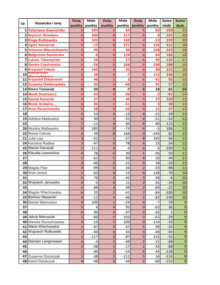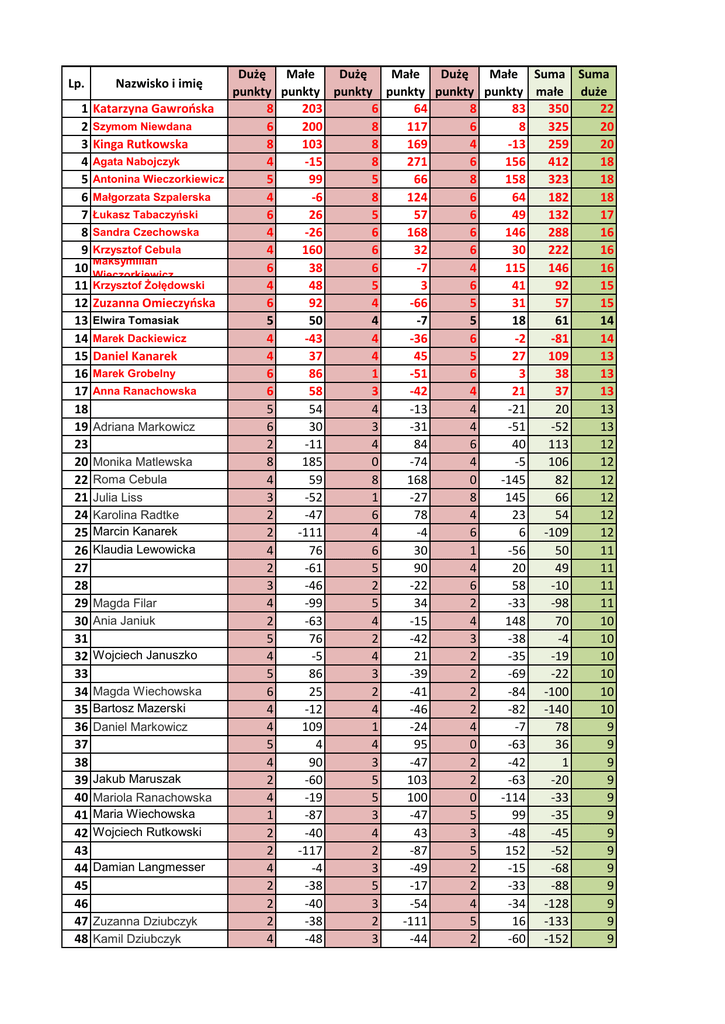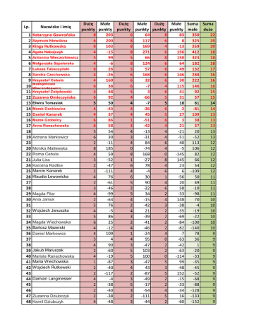 Dużę Małe Dużę Małe Dużę Małe Suma Suma punkty punkty punkty punkty punkty punkty małe duże 1 Katarzyna Gawrońska 8 203 6 64 8 83 350 22 2 Szymom Niewdana 6 200 8 117 6 8 325 20 3 Kinga Rutkowska 8 103 8 169 4 -13 259 20 4 Agata Nabojczyk 4 -15 8 271 6 156 412 18 5 Antonina Wieczorkiewicz 5 99 5 66 8 158 323 18 6 Małgorzata Szpalerska 4 -6 8 124 6 64 182 18 Łukasz Tabaczyński 7 6 26 5 57 6 49 132 17 8 Sandra Czechowska 4 -26 6 168 6 146 288 16 9 Krzysztof Cebula 4 160 6 32 6 30 222 16 Maksymilian 10 Wieczorkiewicz 6 38 6 -7 4 115 146 16 11 Krzysztof Żołędowski 4 48 5 3 6 41 92 15 12 Zuzanna Omieczyńska 6 92 4 -66 5 31 57 15 13 Elwira Tomasiak 5 50 4 -7 5 18 61 14 14 Marek Dackiewicz 4 -43 4 -36 6 -2 -81 14 15 Daniel Kanarek 4 37 4 45 5 27 109 13 16 Marek Grobelny 6 86 1 -51 6 3 38 13 17 Anna Ranachowska 6 58 3 -42 4 21 37 13 18 Emanuel Okrój 5 54 4 -13 4 -21 20 13 19 Adriana Markowicz 6 30 3 -31 4 -51 -52 13 23 Grazyna Żołędowska 2 -11 4 84 6 40 113 12 20 Monika Matlewska 8 185 0 -74 4 -5 106 12 22 Roma Cebula 4 59 8 168 0 -145 82 12 21 Julia Liss 3 -52 1 -27 8 145 66 12 24 Karolina Radtke 2 -47 6 78 4 23 54 12 25 Marcin Kanarek 2 -111 4 -4 6 6 -109 12 Klaudia Lewowicka 26 4 76 6 30 1 -56 50 11 27 Mateusz Wojtaś 2 -61 5 90 4 20 49 11 28 Michał Zdziennicki 3 -46 2 -22 6 58 -10 11 29 Magda Filar 4 -99 5 34 2 -33 -98 11 30 Ania Janiuk 2 -63 4 -15 4 148 70 10 31 Katarzyna Żołędowska 5 76 2 -42 3 -38 -4 10 32 Wojciech Januszko 4 -5 4 21 2 -35 -19 10 33 Justyna Świderska 5 86 3 -39 2 -69 -22 10 34 Magda Wiechowska 6 25 2 -41 2 -84 -100 10 35 Bartosz Mazerski 4 -12 4 -46 2 -82 -140 10 36 Daniel Markowicz 4 109 1 -24 4 -7 78 9 37 Kinga Padała 5 4 4 95 0 -63 36 9 38 Daria Wojtaś 4 90 3 -47 2 -42 1 9 Jakub Maruszak 39 2 -60 5 103 2 -63 -20 9 40 Mariola Ranachowska 4 -19 5 100 0 -114 -33 9 41 Maria Wiechowska 1 -87 3 -47 5 99 -35 9 Wojciech Rutkowski 42 2 -40 4 43 3 -48 -45 9 43 Arkadiusz Piróg 2 -117 2 -87 5 152 -52 9 44 Damian Langmesser 4 -4 3 -49 2 -15 -68 9 45 Łukasz Kowalski 2 -38 5 -17 2 -33 -88 9 46 Tomasz Toruń 2 -40 3 -54 4 -34 -128 9 47 Zuzanna Dziubczyk 2 -38 2 -111 5 16 -133 9 48 Kamil Dziubczyk 4 -48 3 -44 2 -60 -152 9 Lp. Nazwisko i imię 49 50 51 52 53 54 55 56 57 58 59 60 61 62 Ania Majewska Jadwiga Wiechowska Wiktor Wilczewski Patrycja Kamińska Rafał Kowalski Jakub Dobrzyński Aneta Demska Joanna Jesionkowska Krzysztof Kozłowski Igor Drohomirecki Anna Wiechowska Martyna Filar Marcel Kanarek Maciej Mazerski 0 2 1 2 3 2 0 2 0 2 3 1 2 1 -130 -11 -34 -59 -28 -60 -129 -24 -50 -115 -60 -71 -38 -101 6 1 4 0 1 3 1 1 2 0 0 1 0 0 154 -67 -72 -54 -106 -52 -172 -71 -58 -88 -78 -74 -102 -77 2 4 2 4 2 0 4 1 2 1 0 1 1 1 -23 85 -47 51 -30 -115 -97 -39 -39 69 0 -37 -52 -70 1 7 -153 -62 -164 -227 -398 -134 -147 -134 -138 -182 -192 -248 8 7 7 6 6 5 5 4 4 3 3 3 3 2