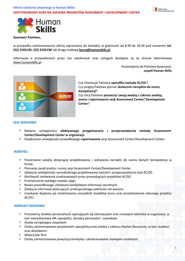Oferta szkolenia otwartego w Human Skills: CERTYFIKOWANY KURS NA ASESORA PROJEKTÓW ASSESSMENT I DEVELOPMENT CENTER Szanowni Państwo, w przypadku zainteresowania ofertą zapraszamy do kontaktu w godzinach od 8:30 do 16:30 pod numerem tel. (22) 2242195, (22) 2242196 lub drogą mailową [email protected] Informacje o prowadzonych przez nas szkoleniach oraz usługach dostępne są na stronie internetowej www.humanskills.pl Pozostajemy do Państwa dyspozycji, zespół Human Skills Czy interesuje Państwa specyfika metody AC/DC? Czy pragną Państwo poznać skuteczne narzędzia do oceny kompetencji? Czy chcą Państwo poszerzyć swoją wiedzę z zakresu analizy, oceny i raportowania sesji Assessment Center/ Development Center? CELE SZKOLENIA Nabycie umiejętności efektywnego przygotowania i przeprowadzenia metody Assessment Center/Development Center w organizacji. Zwiększenie umiejętności prawidłowego raportowania sesji Assessment Center/Development Center. KORZYŚCI Poszerzenie wiedzy dotyczącej projektowania i wdrażania narzędzi do oceny danych kompetencji w firmie. Poznanie zasad analizy i oceny sesji Assessment Center/Development Center. Zdobycie umiejętności samodzielnego projektowania ćwiczeń i przeprowadzania sesji AC/DC. Możliwość omówienia zrealizowanych przez prowadzących projektów AC/DC. Przećwiczenie każdego modułu zajęć. Nauka prawidłowego udzielania kandydatom informacji zwrotnych. Zdobycie informacji dotyczących profesjonalnego pełnienia roli asesora. Uzyskanie dyplomu po zrealizowaniu wszystkich modułów kursu oraz przedstawienie własnego projektu AC/DC. ADRESACI SZKOLENIA Pracownicy działów personalnych zajmujących się rekrutacjami oraz rozwojem talentów w organizacji, w tym menedżerowie HR, specjaliści, doradcy personalni i zawodowi. Osoby zarządzające zespołami. Osoby zainteresowane pozyskaniem specjalistycznej wiedzy z zakresu Human Resources, w tym studenci oraz absolwenci. Właściciele firm. Osoby zainteresowane powyższą tematyką i zainteresowane rozwojem osobistym. 1 Oferta szkolenia otwartego w Human Skills: CERTYFIKOWANY KURS NA ASESORA PROJEKTÓW ASSESSMENT I DEVELOPMENT CENTER PROGRAM SZKOLENIA I DZIEŃ 09:00 – 09:15 Rozpoczęcie, omówienie celów szkolenia oraz potrzeb uczestników. 09:15 – 10:30 METODA ASSESSMENT I DEVELOPMENT CENTER Specyfika metody AC/DC. Możliwości zastosowania metod w kierowaniu kapitałem ludzkim. Cele stosowania AC/DC w organizacji – pozyskiwanie, i motywowanie pracowników. Wady oraz zalety w kontekście rozwoju potencjału kadrowego. Prezentacja kilku zrealizowanych projektów. kształcenie 10:30 – 10:40 Przerwa 10:40 – 12:30 BAZA KOMPETENCJI I ICH ROLA W TWORZENIU NARZĘDZIA AC – obowiązkowa podstawa projektu AC/DC. Sens tworzenia profili kompetencyjnych. Rodzaje kompetencji. Definiowanie kompetencji, ustalanie ich wartościowania oraz wskaźników. Przykłady. Rola kompetencji w AC/DC. 12:30 – 13:00 Przerwa na obiad 13:00 – 14:30 PRZYGOTOWANIE SESJI AC/DC Konstruowanie harmonogramu projektu. Analiza stanowisk pracy dla potrzeb projektu AC/DC. Przygotowanie profilu idealnego kandydata. Przygotowanie odpowiednich narzędzi do przeprowadzenia sesji AC/DC. 14:30 – 14:40 Przerwa 14:40 – 15:40 OCENA KOMPETENCJI Budowanie pytań do wybranych kompetencji. Pytania CBI – wywiad kompetencyjny i jego rola w AC/DC. Ocena 360 stopni – narzędzie wspierające ocenę kompetencji. 15:40 – 16:00 Podsumowanie pierwszego dnia zajęć. Uczestnik otrzyma zadanie domowe – przygotowanie ćwiczeń do trzech kompetencji. 2 Oferta szkolenia otwartego w Human Skills: CERTYFIKOWANY KURS NA ASESORA PROJEKTÓW ASSESSMENT I DEVELOPMENT CENTER II DZIEŃ 09:00 – 09:10. Rozpoczęcie zajęć, przypomnienie pierwszego dnia. 09:10 – 12:30 ROLA ĆWICZEŃ W PROJEKCIE AC/DC Rodzaje ćwiczeń – omówienie wstępne. Typy ćwiczeń. Matryca ćwiczeń i kompetencji do AC/DC. Kryteria wyboru ćwiczeń. Tworzenie instrukcji do ćwiczeń dla asesorów i uczestników. Tworzenie formularzy, raportów itp. Podział zadań asesorów przy ćwiczeniach i raportach. 12:30 – 13:00 Przerwa na obiad 13:00 – 14:00 ROLE W PROJEKCIE AC/DC Podział ról – dział personalny, przełożeni, asesorzy oraz uczestnicy. Wybór uczestników, kryteria. Przygotowanie oraz rola asesora. Rola asesora w czasie sesji – obserwacja, odgrywanie ról, słuchanie, notowanie, wnioskowanie. Odpowiedzialność asesora. Ocenianie i błędy oceniania. Fakty a interpretacje i hipotezy. Mechanizmy ograniczania błędów oceniania. Techniczne przygotowanie asesora – przed, w trakcie oraz po. Typologie osobowości wg.Junga/MBTI a ograniczanie błędów oceniania. 14:00 – 14:10 Przerwa 14:10 – 15:40 RAPORTY I SESJA INTEGRACYJNA Współpraca między asesorami – ustalenia lidera. Zasady sesji integracyjnej. Unikanie pułapek psychologicznych – psychologia tłumu, zbiorowe myślenie. Decyzje asesorskie. Tworzenie raportów – zawartość, ocena kompetencji, wyniki szczegółowe, zbiorcze, analiza SWOT. Tworzenie rekomendacji rozwojowych dla uczestnika – szkolenia, coaching, ścieżka kariery itp. Tworzenie raportów dla uczestników przy AC oraz przy DC. Zasady przekazania informacji zwrotnej do Klienta o sugestiach rozwojowych dla organizacji – programy rozwoju talentów itp. 15:40 – 16:00 Podsumowanie METODA SZKOLENIOWA Szkolenie prowadzone zgodnie z cyklem Kolba oraz zgodnie z metodą ABL (Activity Based Learning). Uczestnicy będą brali udział w aktywizujących ćwiczeniach indywidualnych oraz grupowych poprzedzonych niezbędnym wprowadzeniem teoretycznym. Uczestnicy będą mieli również możliwość autodiagnozy oraz otrzymają feedback od trenera. Trener będzie przedstawiał merytorykę zgodnie z 3 kanałami przekazu informacji – wzrok, ruch, słuch. Panel dyskusyjny, ćwiczenia grupowe i indywidualne, prezentacja, odgrywanie ról, analiza przypadków i filmów poglądowych. 3 Oferta szkolenia otwartego w Human S