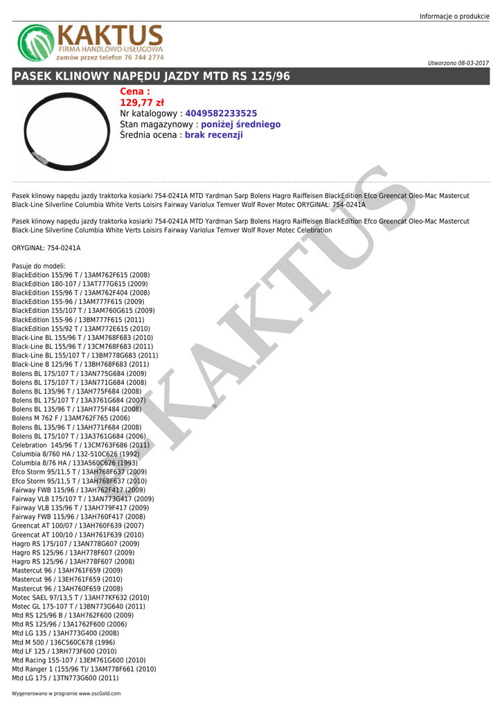 Informacje o produkcie Utworzono 08-03-2017 PASEK KLINOWY NAPĘDU JAZDY MTD RS 125/96 Cena : 129,77 zł Nr katalogowy : 4049582233525 Stan magazynowy : poniżej średniego Średnia ocena : brak recenzji S Pasek klinowy napędu jazdy traktorka kosiarki 754-0241A MTD Yardman Sarp Bolens Hagro Raiffeisen BlackEdition Efco Greencat Oleo-Mac Mastercut Black-Line Silverline Columbia White Verts Loisirs Fairway Variolux Temver Wolf Rover Motec ORYGINAŁ: 754-0241A ORYGINAŁ: 754-0241A AK TU Pasek klinowy napędu jazdy traktorka kosiarki 754-0241A MTD Yardman Sarp Bolens Hagro Raiffeisen BlackEdition Efco Greencat Oleo-Mac Mastercut Black-Line Silverline Columbia White Verts Loisirs Fairway Variolux Temver Wolf Rover Motec Celebration eK Pasuje do modeli: BlackEdition 155/96 T / 13AM762F615 (2008) BlackEdition 180-107 / 13AT777G615 (2009) BlackEdition 155/96 T / 13AM762F404 (2008) BlackEdition 155-96 / 13AM777F615 (2009) BlackEdition 155/107 T / 13AM760G615 (2009) BlackEdition 155-96 / 13BM777F615 (2011) BlackEdition 155/92 T / 13AM772E615 (2010) Black-Line BL 155/96 T / 13AM768F683 (2010) Black-Line BL 155/96 T / 13CM768F683 (2011) Black-Line BL 155/107 T / 13BM778G683 (2011) Black-Line B 125/96 T / 13BH768F683 (2011) Bolens BL 175/107 T / 13AN775G684 (2009) Bolens BL 175/107 T / 13AN771G684 (2008) Bolens BL 135/96 T / 13AH775F684 (2008) Bolens BL 175/107 T / 13A3761G684 (2007) Bolens BL 135/96 T / 13AH775F484 (2008) Bolens M 762 F / 13AM762F765 (2006) Bolens BL 135/96 T / 13AH771F684 (2008) Bolens BL 175/107 T / 13A3761G684 (2006) Celebration 145/96 T / 13CM763F686 (2011) Columbia 8/760 HA / 132-510C626 (1992) Columbia 8/76 HA / 133A560C626 (1993) Efco Storm 95/11,5 T / 13AH768F637 (2009) Efco Storm 95/11,5 T / 13AH768F637 (2010) Fairway FWB 115/96 / 13AH762F417 (2009) Fairway VLB 175/107 T / 13AN773G417 (2009) Fairway VLB 135/96 T / 13AH779F417 (2009) Fairway FWB 115/96 / 13AH760F417 (2008) Greencat AT 100/07 / 13AH760F639 (2007) Greencat AT 100/10 / 13AH761F639 (2010) Hagro RS 175/107 / 13AN778G607 (2009) Hagro RS 125/96 / 13AH778F607 (2009) Hagro RS 125/96 / 13AH778F607 (2008) Mastercut 96 / 13AH761F659 (2009) Mastercut 96 / 13EH761F659 (2010) Mastercut 96 / 13AH760F659 (2008) Motec SAEL 97/13,5 T / 13AH77KF632 (2010) Motec GL 175-107 T / 13BN773G640 (2011) Mtd RS 125/96 B / 13AH762F600 (2009) Mtd RS 125/96 / 13A1762F600 (2006) Mtd LG 135 / 13AH773G400 (2008) Mtd M 500 / 136C560C678 (1996) Mtd LF 125 / 13RH773F600 (2010) Mtd Racing 155-107 / 13EM761G600 (2010) Mtd Ranger 1 (155/96 T)/ 13AM778F661 (2010) Mtd LG 175 / 13TN773G600 (2011) Wygenerowano w programie www.oscGold.com eK S AK TU Mtd RS 125/96 B / 13AH762F670 (2008) Mtd LF 125 / 13AH773F600 (2008) Mtd RS 125/96 B / 13AH762F400 (2008) Mtd LF 125 / 13EH773F600 (2009) Mtd LG 175 / 13AN773G400 (2008) Mtd M 500 / 134B560C678 (1994) Mtd Racing 125-96 / 13EH761F676 (2010) Mtd SL 155 BS / 13AM768G676 (2007) Mtd LG 175 / 13EN773G600 (2009) Mtd LG 175 / 13AN773G600 (2009) Mtd RS 135/96 B / 13AH768F678 (2007) Mtd RS 135/107 / 13A1762G600 (2007) Mtd 12/96 T / 13AH761F676 (2006) Oleo-Mac Tornado 97/13,5 T / 13AH77KF636 (2010) Oleo-Mac Tornado 95/11,5 T / 13BH768F636 (2011) Oleo-Mac Tornado 108/15,5 T / 13BM77KG636 (2011) Oleo-Mac Tornado 108/15,5 T / 13AM77KG636 (2010) Oleo-Mac Tornado 108/15,5 T / 13AM77KG636 (2009) Raiffeisen RMS 714-96 T / 13AH777F628 (2007) Raiffeisen RMS 7145-96 T / 13AM777F628 (2010) Raiffeisen 8/76 HA / 132-510C628 (1992) Raiffeisen RMS 7145-96 T / 13AM777F628 (2008) Raiffeisen RMS 7145-96 T / 13AM777F628 (2009) Rover Raider 18/42" / 13AO77TS333 (2011) Rover Raider 14/38" / 13AM76TF333 (2011) Sarp SL 135 BS / 13AH768F498 (2007) Sarp SL 135 BS / 13AH768F498 (2009) Sarp SL 135 BS / 13AH768F698 (2007) Sarp SL 155 BS / 13AM768G498 (2007) Silverline Rasentrac 107 T/175 / 13BN763G677 (2011) Silverline Silvertrac / 13A4769-677 (2007) Silverline Silvertrac 20/107 T / 13A7763G677 (2006) Temver EJL 175-107 T / 13AN763G642 (2010) Temver EJL 155-96 T / 13AM763F642 (2010) Variolux 96-125 / 13AH761F620 (2010) Variolux V-RTS 135/96 T / 13AH77TF620 (2008) Variolux 96-115 / 13AH762F620 (2008) Variolux V-RTS 175/107 T / 13AN77TG620 (2009) Verts Loisirs FWT 180/107 / 13A3768G617 (2006) Verts Loisirs FW 96 / 13CH761F617 (2011) Verts Loisirs FWT 135/96 / 13A1768F617 (2006) Verts Loisirs FW 96 / 13AH761F617 (2010) White B 561 C / 134B561C679 (1994) White C 561 C / 135C561C679 (1995) Wolf Select 107.175 T / 13TN77RG650 (2011) Wolf Select 96.130 T / 13TH76RF650 (2011) Yardman TF 7135 / 13AH77YF643 (2009) Yardman TF 7135 / 13AH774F643 (2007) Yardman 11.5/76 / 136C561C643 (1996) Yardman AT 100/09 / 13AH761F439 (2009) Yardman TF 7135 / 13AH774F643 (2008) Yardman AT 100/08 / 13AH760F439 (2008) Yardman AT 100/07 / 13AH760F439 (2007)