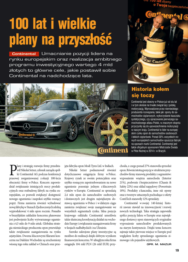 100 lat i wielkie plany na przyszłość Continental Umacnianie pozycji lidera na rynku europejskim oraz realizacja ambitnego programu inwestycyjnego wartego 4 mld złotych to główne cele, jakie postawił sobie Continental na nadchodzące lata. Historia kołem się toczy Continental jest obecny w Polsce już od stu lat i w tym okresie na trwałe związał się z polską motoryzacją. Wprowadzone przez niemieckiego producenta rozwiązania, takie jak: opony do samochodów ciężarowych, wykorzystanie kauczuku syntetycznego, czy opracowanie pierwszego samochodowego atlasu Polski, w znacznym stopniu przyczyniły się do upowszechnienia motoryzacji w naszym kraju. Continental to lider na europejskim rynku opon do samochodów osobowych i lekkich ciężarówek. Ponad 30% wszystkich nowych europejskich samochodów opuszcza fabryki na oponach marki Continental. Continental jest także oficjalnym sponsorem Mistrzostw Świata w Piłce Nożnej w 2014 r. w Brazylii. P lany i strategię rozwoju firmy przedstawił Nikolai Setzer, członek zarządu spółki Continental AG podczas konferencji prasowej zorganizowanej z okazji 100-lecia obecności firmy w Polsce. Koncern zapowiedział zwiększanie istniejących mocy produkcyjnych oraz rozbudowę fabryk na rynku europejskim, co pozwoli zwiększyć dostępność nowego ogumienia i zaspokoi szybko rosnący popyt. Firma zamierza również wybudować nową fabrykę w Stanach Zjednoczonych zdolną wyprodukować 4 mln opon rocznie. Ponadto w brazylijskim zakładzie koncernu planowane jest podwojenie liczby wytwarzanego ogumienia z 4,5 mln do 9 mln sztuk. Globalna strategia niemieckiego producenta opon przewiduje także zwiększanie zaangażowania na rynku azjatyckim. Dwoma kluczowymi filarami koncernu na Dalekim Wschodzie są uruchomiony wiosną tego roku zakład w Chinach oraz prze- jęta fabryka opon Modi Tyres Ltd. w Indiach. Nikolai Setzer podsumował również dotychczasowe osiągnięcia firmy w Polsce. Krajowy rynek ze swoim potencjałem oraz szybko rosnącym zapotrzebowaniem na nowe ogumienie pozostaje jednym z kluczowych rynków w Europie. Continental ze sprzedażą 2,4 mln opon do samochodów osobowych i dostawczych jest drugim największym dostawcą ogumienia w Polsce i w dalszym ciągu zamierza zwiększać swoje zaangażowanie we wszystkich segmentach rynku. Silna pozycja krajowego oddziału Continental umożliwia także skuteczną koordynację działań na wschodzie Europy i zwiększanie zaangażowania firmy w krajach nadbałtyckich i na Ukrainie. Szeroko zakrojone plany inwestycyjne są możliwe do realizacji dzięki dobrym wynikom finansowym koncernu. W ubiegłym roku firma osiągnęła 104 mld PLN (26 mld EUR) przy- chodu, z czego ponad 27% stanowiła sprzedaż opon. Równie istotną pozycję w strukturze przychodów firmy stanowią produkty z segmentów: wyposażenie wnętrza samochodu (Interior 21%), podwozie i bezpieczeństwo (Chassis & Safety 22%) oraz układ napędowy (Powertrain 18%). Produkty z kauczuku, inne niż opony oraz z tworzyw sztucznych pochodzące z oferty ContiTech stanowiły 12% sprzedaży. Continental w swojej 140-letniej historii zawsze stawiał na innowacyjność i rozwój nowych technologii. Taka strategia zapewniła spółce pozycję lidera w Europie oraz największego dostawcy opon stanowiących oryginalne wyposażenie samochodów produkowanych na starym kontynencie. Dzięki temu koncern zajmuje także pierwsze miejsce w Europie pod względem liczby sprzedanego ogumienia zimowego i do pojazdów użytkowych. OPR. M. Mazur 19