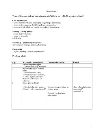 Scenariusz 1 Temat: Dlaczego palenie zagraża zdrowiu? (lekcja nr 1 , 20-30 uczniów w klasie) Cele operacyjne: - uczeń potrafi wskazać przyczyny sięgania po papierosy; - uczeń jest świadomy skutków palenia papierosów; - uczeń wie jak odmówić osobie częstującej papierosem. Metody i formy pracy: - praca indywidualna; - praca w grupach; - dyskusja. Materiały i pomoce dydaktyczne: -dwa arkusze szarego papieru, flamastry Załączniki: 1. Quiz „Prawdy i mity o papierosach” Przebieg lekcji: L.p. Czynności nauczyciela 1 Sprawy organizacyjne 1. Sprawdzanie listy obecności Wprowadzenie do tematu lekcji 1. Podanie tematu lekcji. 2. Poinformowanie uczniów, że lekcja będzie dotyczyła skutków uzależnienia od nikotyny. Część główna lekcji 2 3 Czynności uczniów 1. Rozdanie kartek z quizem Uczniowie odpowiadają na „Prawdy i mity o papierosach” pytania quizu. Uwagi Quiz „ Prawdy i mity o papierosach” - załącznik nr1 Czytanie i wyjaśnianie odpowiedzi. 1 2. Nauczyciel wyjaśnia skład chemiczny dymu tytoniowego: - nikotyna - tlenek węgla - arszenik - amoniak - formaldehyd ( formalina) - smoła Pytanie nauczyciela: Dlaczego działanie tych składników, jest toksyczne i szkodliwe dla zdrowia? Odpowiedzi uczniów, np. : tlenek węgla – nazywamy potocznie czadem, ma silne właściwości toksyczne, - kropla czynnej nikotyny jest dawką śmiertelną, - arszenik to bardzo silna trucizna, - amoniak to gaz szkodliwy dla zdrowia 3. Podział klasy na dwie grupy: I zwolennicy palenia II przeciwnicy palenia Uczniowie wypisują argumenty „za” i „przeciw” paleniu papierosów. Mogą korzystać z informacji o nikotynizmie zawartych Każda grupa otrzymuje arkusz w quizie. papieru i flamastry Prezentacja pracy grup. Dyskusja na temat bilansu zysków i strat wskutek palenia papierosów. 4 Ewaluacja Podsumowanie zajęć. Pytanie nauczyciela: 1.Jak palenie wpływa na organizm człowieka? 2. Wymień najczęstsze choroby będące skutkiem nikotynizmu. Wniosek: Skutki palenia papierosów są bardzo często nieodwracalne, nie warto sięgać po papierosy. Odpowiedzi uczniów. 2 Załącznik nr 1 Quiz ,, Prawdy i mity o papierosach” Odpowiedz : ,,Tak ’’ lub ,,Nie” 1. Palenie papierosów może byd przyczyną nowotworów ( płuc, krtani wraz z utratą głosu, wątroby) 2. Palenie tytoniu to nie tylko uzależnienie od nikotyny, ale przede wszystkim nawyk o charakterze behawioralnym, psychologicznym i społecznym. 3. Nikotyna nie ma wpływu na wydolnośd fizyczną organizmu. 4. Palenie to dobry sposób na schudnięcie. 5. Co piąty polski nastolatek sięga po papierosy. 6. Uzależnienie od papierosów rodzi się niespostrzeżenie. 7. Nikotyna dobrze wpływa na koncentrację uwagi. 8. Palenie w czasie ciąży nie zwiększa ryzyka poronieo, porodów przedwczesnych i zgonów niemowląt. 9. Osoba niepaląca przebywająca w towarzystwie palących często wdycha więcej szkodliwych substancji niż palacze. 10. Palenie papierosów to przejaw dorosłości. 11. Palenie papierosów negatywnie wpływa na cerę, włosy, paznokcie. 12. ,, Rzucenie palenia” jest łatwe i bezproblemowe. 13. Co roku 100 000 ludzi w Polsce umiera przedwcześnie z powodu palenia papierosów. 14. Reklamy papierosów są wiarygodne i uczciwe. 15. Papierosy nie są jedynym legalnie sprzedawanym środkiem rakotwórczym w Polsce i na świecie. Prawidłowe odpowiedzi: 1. Tak 2. Tak 3. Nie 4. Nie 5. Tak 6. Tak 7. Nie 8. Nie 9. Tak 10. Nie 11. Tak 12. Nie 13. Tak 14. Nie 15. Nie 3