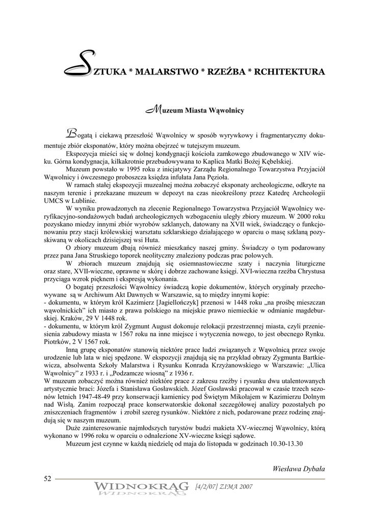 S ZTUKA * MALARSTWO * RZEŹBA * RCHITEKTURA Muzeum Miasta Wąwolnicy Bogatą i ciekawą przeszłość Wąwolnicy w sposób wyrywkowy i fragmentaryczny dokumentuje zbiór eksponatów, który moŜna obejrzeć w tutejszym muzeum. Ekspozycja mieści się w dolnej kondygnacji kościoła zamkowego zbudowanego w XIV wieku. Górna kondygnacja, kilkakrotnie przebudowywana to Kaplica Matki BoŜej Kębelskiej. Muzeum powstało w 1995 roku z inicjatywy Zarządu Regionalnego Towarzystwa Przyjaciół Wąwolnicy i ówczesnego proboszcza księdza infułata Jana Pęzioła. W ramach stałej ekspozycji muzealnej moŜna zobaczyć eksponaty archeologiczne, odkryte na naszym terenie i przekazane muzeum w depozyt na czas nieokreślony przez Katedrę Archeologii UMCS w Lublinie. W wyniku prowadzonych na zlecenie Regionalnego Towarzystwa Przyjaciół Wąwolnicy weryfikacyjno-sondaŜowych badań archeologicznych wzbogaceniu uległy zbiory muzeum. W 2000 roku pozyskano miedzy innymi zbiór wyrobów szklanych, datowany na XVII wiek, świadczący o funkcjonowaniu przy stacji królewskiej warsztatu szklarskiego działającego w oparciu o masę szklaną pozyskiwaną w okolicach dzisiejszej wsi Huta. O zbiory muzeum dbają równieŜ mieszkańcy naszej gminy. Świadczy o tym podarowany przez pana Jana Struskiego toporek neolityczny znaleziony podczas prac polowych. W zbiorach muzeum znajdują się osiemnastowieczne szaty i naczynia liturgiczne oraz stare, XVII-wieczne, oprawne w skórę i dobrze zachowane księgi. XVI-wieczna rzeźba Chrystusa przyciąga wzrok pięknem i ekspresją wykonania. O bogatej przeszłości Wąwolnicy świadczą kopie dokumentów, których oryginały przechowywane są w Archiwum Akt Dawnych w Warszawie, są to między innymi kopie: - dokumentu, w którym król Kazimierz [Jagiellończyk] przenosi w 1448 roku „na prośbę mieszczan wąwolnickich” ich miasto z prawa polskiego na miejskie prawo niemieckie w odmianie magdeburskiej. Kraków, 29 V 1448 rok. - dokumentu, w którym król Zygmunt August dokonuje relokacji przestrzennej miasta, czyli przeniesienia zabudowy miasta w 1567 roku na inne miejsce i wytyczenia nowego, to jest obecnego Rynku. Piotrków, 2 V 1567 rok. Inną grupę eksponatów stanowią niektóre prace ludzi związanych z Wąwolnicą przez swoje urodzenie lub lata w niej spędzone. W ekspozycji znajdują się na przykład obrazy Zygmunta Bartkiewicza, absolwenta Szkoły Malarstwa i Rysunku Konrada KrzyŜanowskiego w Warszawie: „Ulica Wąwolnicy” z 1933 r. i „Podzamcze wiosną” z 1936 r. W muzeum zobaczyć moŜna równieŜ niektóre prace z zakresu rzeźby i rysunku dwu utalentowanych artystycznie braci: Józefa i Stanisława Gosławskich. Józef Gosławski pracował w czasie trzech sezonów letnich 1947-48-49 przy konserwacji kamienicy pod Świętym Mikołajem w Kazimierzu Dolnym nad Wisłą. Zanim rozpoczął prace konserwatorskie dokonał szczegółowej analizy pozostałych po zniszczeniach fragmentów i zrobił szereg rysunków. Niektóre z nich, podarowane przez rodzinę znajdują się w naszym muzeum. DuŜe zainteresowanie najmłodszych turystów budzi makieta XV-wiecznej Wąwolnicy, którą wykonano w 1996 roku w oparciu o odnalezione XV-wieczne księgi sądowe. Muzeum jest czynne w kaŜdą niedzielę od maja do listopada w godzinach 10.30-13.30 Wiesława Dybała 52 [4/2/07] ZIMA 2007