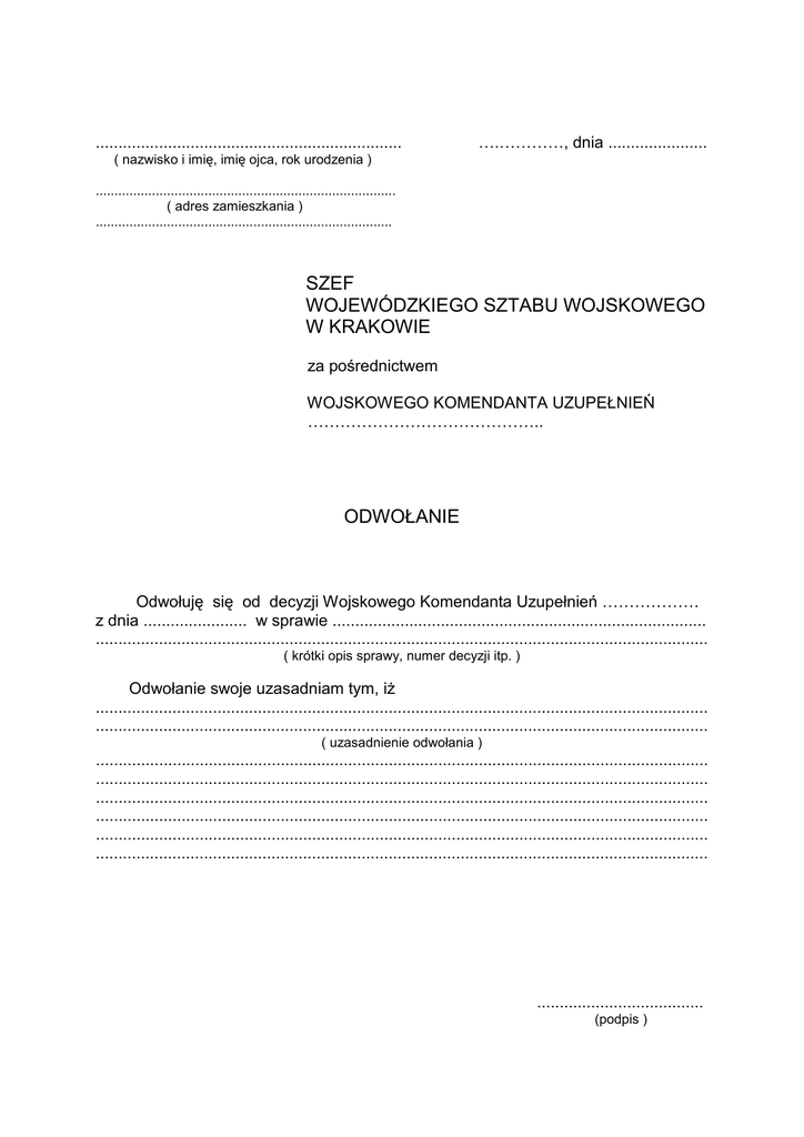 .................................................................... ….…………, dnia ...................... ( nazwisko i imię, imię ojca, rok urodzenia ) ................................................................................ ( adres zamieszkania ) ............................................................................... SZEF WOJEWÓDZKIEGO SZTABU WOJSKOWEGO W KRAKOWIE za pośrednictwem WOJSKOWEGO KOMENDANTA UZUPEŁNIEŃ …………………………………….. ODWOŁANIE Odwołuję się od decyzji Wojskowego Komendanta Uzupełnień ……………… z dnia ....................... w sprawie ................................................................................... ........................................................................................................................................ ( krótki opis sprawy, numer decyzji itp. ) Odwołanie swoje uzasadniam tym, iŜ ........................................................................................................................................ ........................................................................................................................................ ( uzasadnienie odwołania ) ........................................................................................................................................ ........................................................................................................................................ ........................................................................................................................................ ........................................................................................................................................ ........................................................................................................................................ ........................................................................................................................................ ..................................... (podpis )