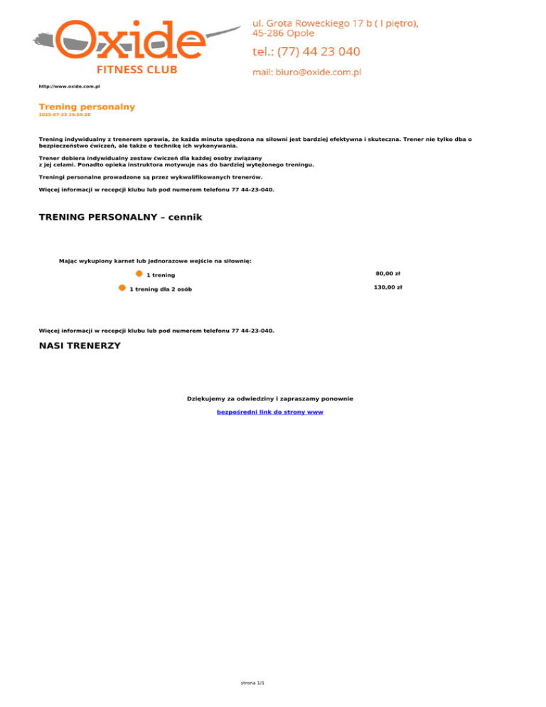 http://www.oxide.com.pl Trening personalny 2015-07-23 19:50:28 Trening indywidualny z trenerem sprawia, że każda minuta spędzona na siłowni jest bardziej efektywna i skuteczna. Trener nie tylko dba o bezpieczeństwo ćwiczeń, ale także o technikę ich wykonywania. Trener dobiera indywidualny zestaw ćwiczeń dla każdej osoby związany z jej celami. Ponadto opieka instruktora motywuje nas do bardziej wytężonego treningu. Treningi personalne prowadzone są przez wykwalifikowanych trenerów. Więcej informacji w recepcji klubu lub pod numerem telefonu 77 44-23-040. TRENING PERSONALNY – cennik Mając wykupiony karnet lub jednorazowe wejście na siłownię: 1 trening 80,00 zł 1 trening dla 2 osób 130,00 zł Więcej informacji w recepcji klubu lub pod numerem telefonu 77 44-23-040. NASI TRENERZY Dziękujemy za odwiedziny i zapraszamy ponownie bezpośredni link do strony www strona 1/1 Powered by TCPDF (www.tcpdf.org)
