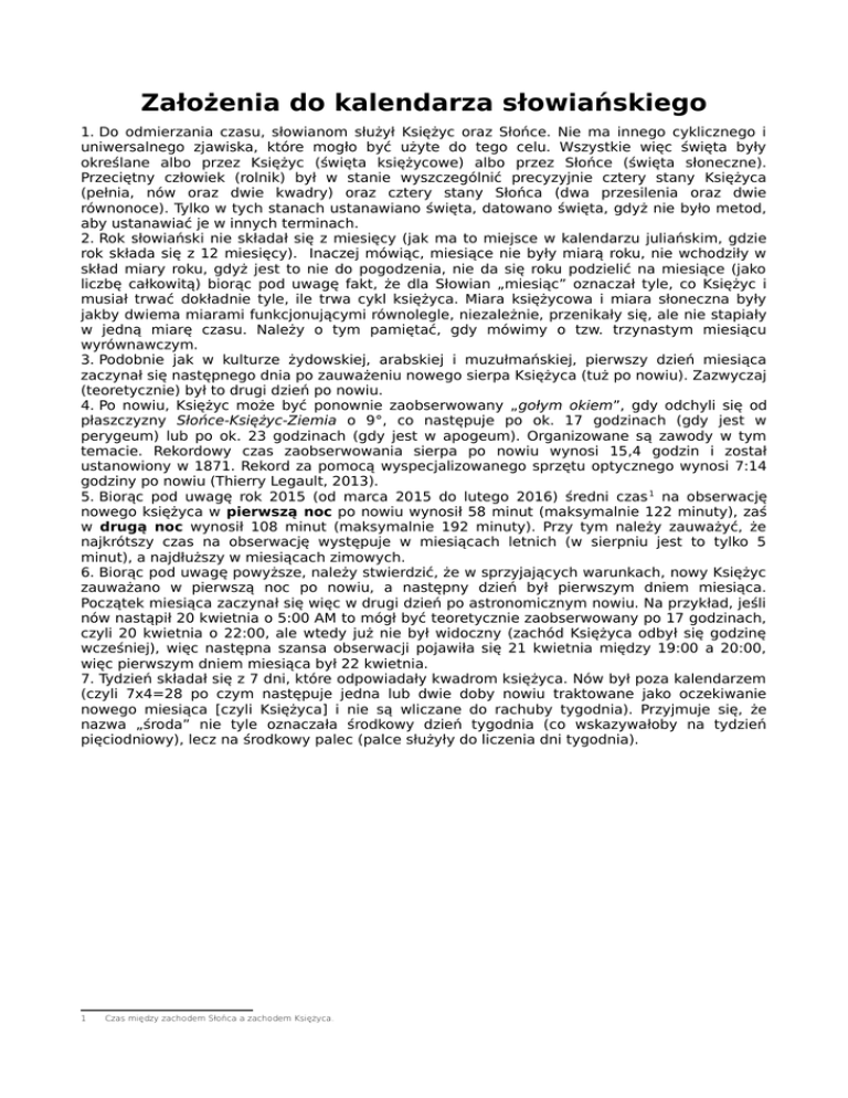 Założenia do kalendarza słowiańskiego 1. Do odmierzania czasu, słowianom służył Księżyc oraz Słońce. Nie ma innego cyklicznego i uniwersalnego zjawiska, które mogło być użyte do tego celu. Wszystkie więc święta były określane albo przez Księżyc (święta księżycowe) albo przez Słońce (święta słoneczne). Przeciętny człowiek (rolnik) był w stanie wyszczególnić precyzyjnie cztery stany Księżyca (pełnia, nów oraz dwie kwadry) oraz cztery stany Słońca (dwa przesilenia oraz dwie równonoce). Tylko w tych stanach ustanawiano święta, datowano święta, gdyż nie było metod, aby ustanawiać je w innych terminach. 2. Rok słowiański nie składał się z miesięcy (jak ma to miejsce w kalendarzu juliańskim, gdzie rok składa się z 12 miesięcy). Inaczej mówiąc, miesiące nie były miarą roku, nie wchodziły w skład miary roku, gdyż jest to nie do pogodzenia, nie da się roku podzielić na miesiące (jako liczbę całkowitą) biorąc pod uwagę fakt, że dla Słowian „miesiąc” oznaczał tyle, co Księżyc i musiał trwać dokładnie tyle, ile trwa cykl księżyca. Miara księżycowa i miara słoneczna były jakby dwiema miarami funkcjonującymi równolegle, niezależnie, przenikały się, ale nie stapiały w jedną miarę czasu. Należy o tym pamiętać, gdy mówimy o tzw. trzynastym miesiącu wyrównawczym. 3. Podobnie jak w kulturze żydowskiej, arabskiej i muzułmańskiej, pierwszy dzień miesiąca zaczynał się następnego dnia po zauważeniu nowego sierpa Księżyca (tuż po nowiu). Zazwyczaj (teoretycznie) był to drugi dzień po nowiu. 4. Po nowiu, Księżyc może być ponownie zaobserwowany „gołym okiem”, gdy odchyli się od płaszczyzny Słońce-Księżyc-Ziemia o 9°, co następuje po ok. 17 godzinach (gdy jest w perygeum) lub po ok. 23 godzinach (gdy jest w apogeum). Organizowane są zawody w tym temacie. Rekordowy czas zaobserwowania sierpa po nowiu wynosi 15,4 godzin i został ustanowiony w 1871. Rekord za pomocą wyspecjalizowanego sprzętu optycznego wynosi 7:14 godziny po nowiu (Thierry Legault, 2013). 5. Biorąc pod uwagę rok 2015 (od marca 2015 do lutego 2016) średni czas 1 na obserwację nowego księżyca w pierwszą noc po nowiu wynosił 58 minut (maksymalnie 122 minuty), zaś w drugą noc wynosił 108 minut (maksymalnie 192 minuty). Przy tym należy zauważyć, że najkrótszy czas na obserwację występuje w miesiącach letnich (w sierpniu jest to tylko 5 minut), a najdłuższy w miesiącach zimowych. 6. Biorąc pod uwagę powyższe, należy stwierdzić, że w sprzyjających warunkach, nowy Księżyc zauważano w pierwszą noc po nowiu, a następny dzień był pierwszym dniem miesiąca. Początek miesiąca zaczynał się więc w drugi dzień po astronomicznym nowiu. Na przykład, jeśli nów nastąpił 20 kwietnia o 5:00 AM to mógł być teoretycznie zaobserwowany po 17 godzinach, czyli 20 kwietnia o 22:00, ale wtedy już nie był widoczny (zachód Księżyca odbył się godzinę wcześniej), więc następna szansa obserwacji pojawiła się 21 kwietnia między 19:00 a 20:00, więc pierwszym dniem miesiąca był 22 kwietnia. 7. Tydzień składał się z 7 dni, które odpowiadały kwadrom księżyca. Nów był poza kalendarzem (czyli 7x4=28 po czym następuje jedna lub dwie doby nowiu traktowane jako oczekiwanie nowego miesiąca [czyli Księżyca] i nie są wliczane do rachuby tygodnia). Przyjmuje się, że nazwa „środa” nie tyle oznaczała środkowy dzień tygodnia (co wskazywałoby na tydzień pięciodniowy), lecz na środkowy palec (palce służyły do liczenia dni tygodnia). 1 Czas między zachodem Słońca a zachodem Księżyca.