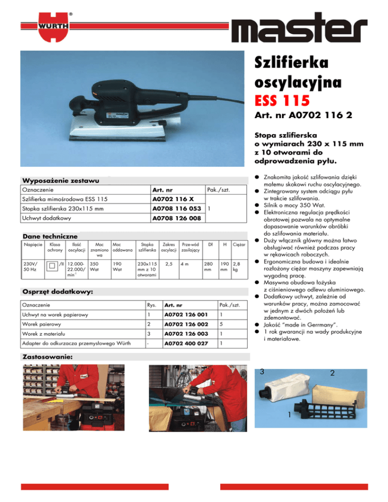 Szlifierka oscylacyjna ESS 115 Art. nr A0702 116 2 Stopa szlifierska o wymiarach 230 x 115 mm z 10 otworami do odprowadzenia pyłu. Wyposażenie zestawu Oznaczenie Art. nr Szlifierka mimośrodowa ESS 115 A0702 116 X Stopka szlifierska 230x115 mm A0708 116 053 Uchwyt dodatkowy A0708 126 008 Pak./szt. 1 Dane techniczne Napięcie Klasa ochrony 230V/ 50 Hz Ilość oscylacji Moc Moc znamiono oddawana wa /II 12.000- 350 22.000/ Wat min-1 190 Wat Stopka szlifierska Zakres oscylacji 230x115 mm z 10 otworami 2,5 Prze-wód zasilający 4m Dł 280 mm H Ciężar 190 2,8 mm kg Osprzęt dodatkowy: Oznaczenie Rys. Art. nr Pak./szt. Uchwyt na worek papierowy 1 A0702 126 001 1 Worek paierowy 2 A0702 126 002 5 Worek z materiału 3 A0702 126 003 1 Adapter do odkurzacza przemysłowego Würth - A0702 400 027 1 ● Znakomita jakość szlifowania dzięki małemu skokowi ruchu oscylacyjnego. ● Zintegrowany system odciągu pyłu w trakcie szlifowania. ● Silnik o mocy 350 Wat. ● Elektroniczna regulacja prędkości obrotowej pozwala na optymalne dopasowanie warunków obróbki do szlifowania materiału. ● Duży włącznik główny można łatwo obsługiwać również podczas pracy w rękawicach roboczych. ● Ergonomiczna budowa i idealnie rozłożony ciężar maszyny zapewniają wygodną pracę. ● Masywna obudowa łożyska z ciśnieniowego odlewu aluminiowego. ● Dodatkowy uchwyt, zależnie od warunków pracy, można zamocować w jednym z dwóch położeń lub zdemontować. ● Jakość “made in Gerrmany”. ● 1 rok gwarancji na wady produkcyjne i materiałowe. Zastosowanie: 3 2 1