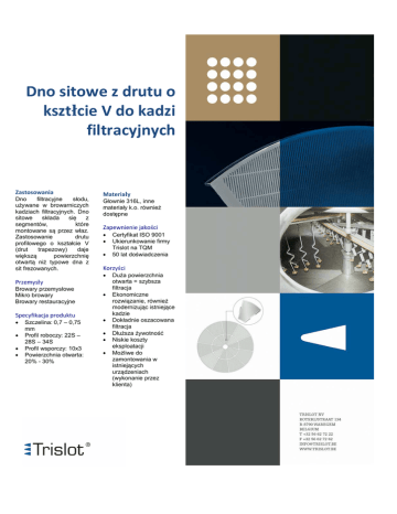 Dno sitowe z drutu o ksztłcie V do kadzi filtracyjnych Zastosowania Dno filtracyjne słodu, używane w browarniczych kadziach filtracyjnych. Dno sitowe składa się z segmentów, które montowane są przez właz. Zastosowanie drutu profilowego o kształcie V (drut trapezowy) daje większą powierzchnię otwartą niż typowe dna z sit frezowanych. Przemysły Browary przemysłowe Mikro browary Browary restauracyjne Specyfikacja produktu • • • • Szczelina: 0,7 – 0,75 mm Profil roboczy: 22S – 28S – 34S Profil wsporczy: 10x3 Powierzchnia otwarta: 20% - 30% Materiały Głownie 316L, inne materiały k.o. również dostępne Zapewnienie jakości • • • Certyfikat ISO 9001 Ukierunkowanie firmy Trislot na TQM 50 lat doświadczenia Korzyści • • • • • • Duża powierzchnia otwarta = szybsza filtracja Ekonomiczne rozwiązanie, również modernizując istniejące kadzie Dokładnie oszacowana filtracja Dłuższa żywotność Niskie koszty eksploatacji Możliwe do zamontowania w istniejących urządzeniach (wykonanie przez klienta)